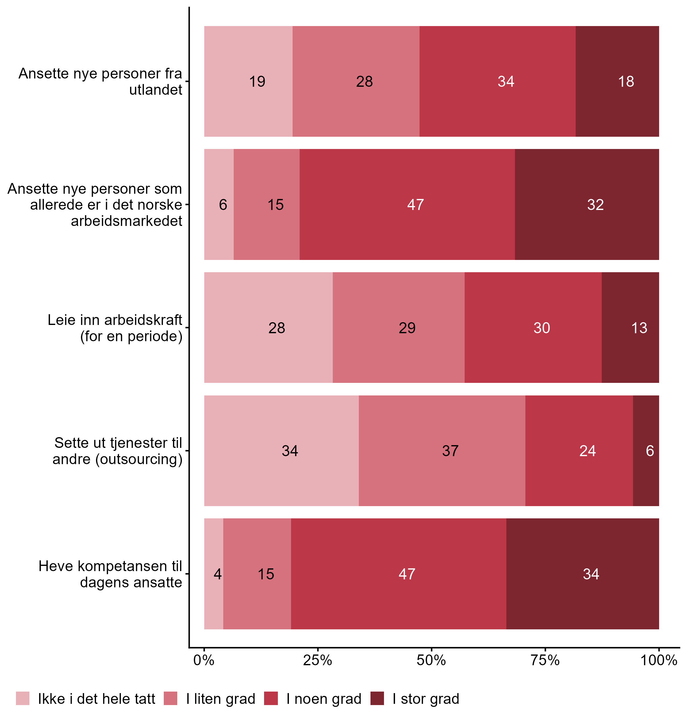 For Sette ut tjenester til andre (outsourcing) har målgruppen en lavere andel respondenter (0,29) enn alle andre (0,42) som svarte I noen grad eller I stor grad. For påstanden Ansette nye personer fra utlandet var det flere som svarte I noen grad eller I stor grad i målgruppen (0,53) enn blant andre (0,31).
