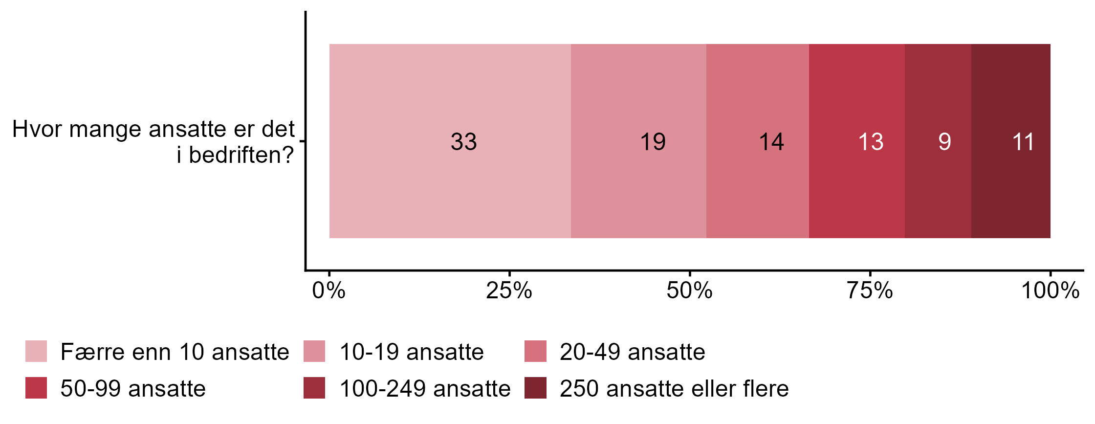 Kapittelet viser en overordnet fordeling på antall ansatte i bedrifter som har deltatt i undersøkelsen i figur 1, hvor stor andel av bedriftene som har svart fra hvert fylke i tabell 1, og andelen fordelt på sentralitet i tabell 2. Der det har vært mer oversiktlig å presentere sentralitet på en 3-delt skala har vi gjort dette.