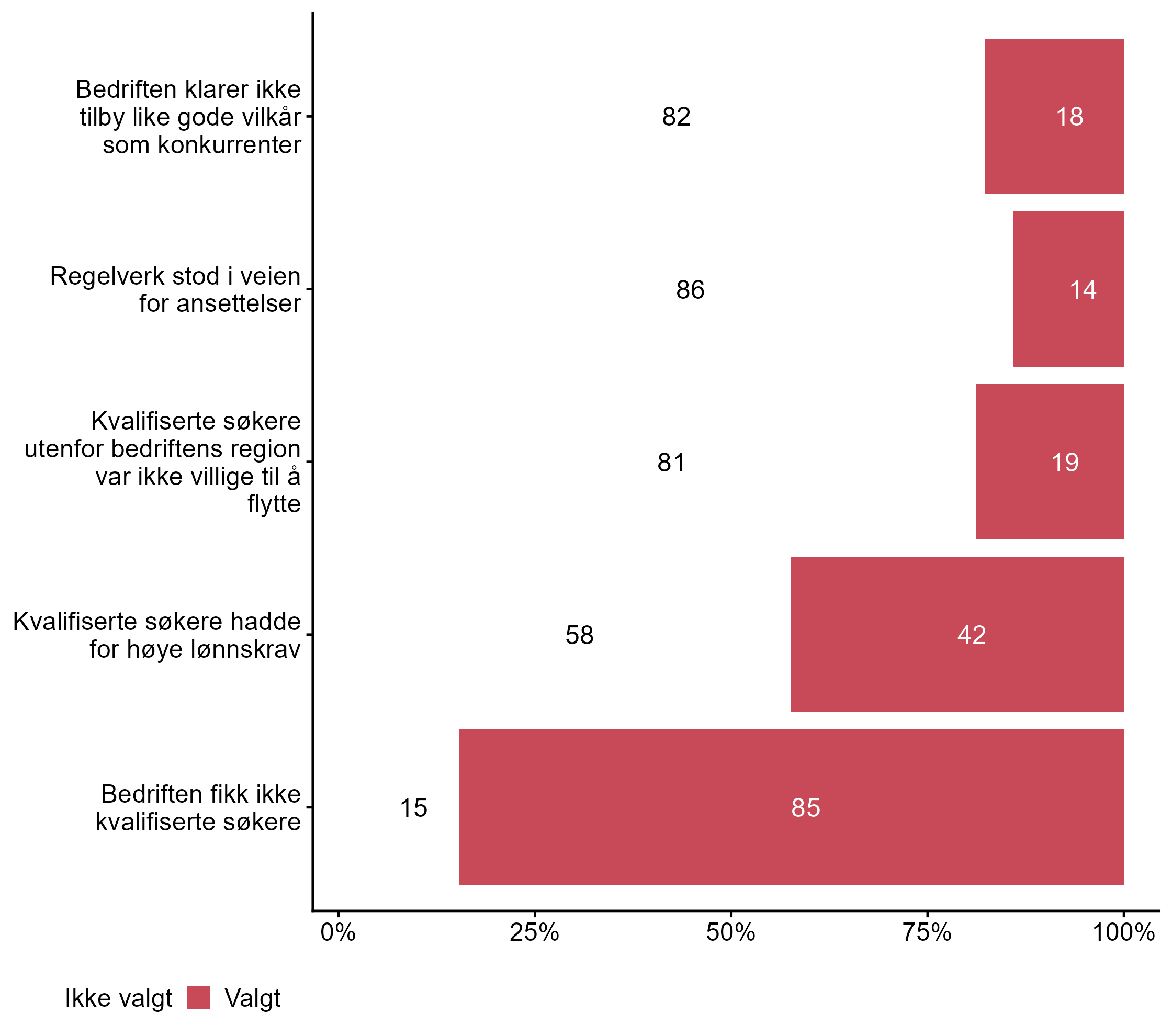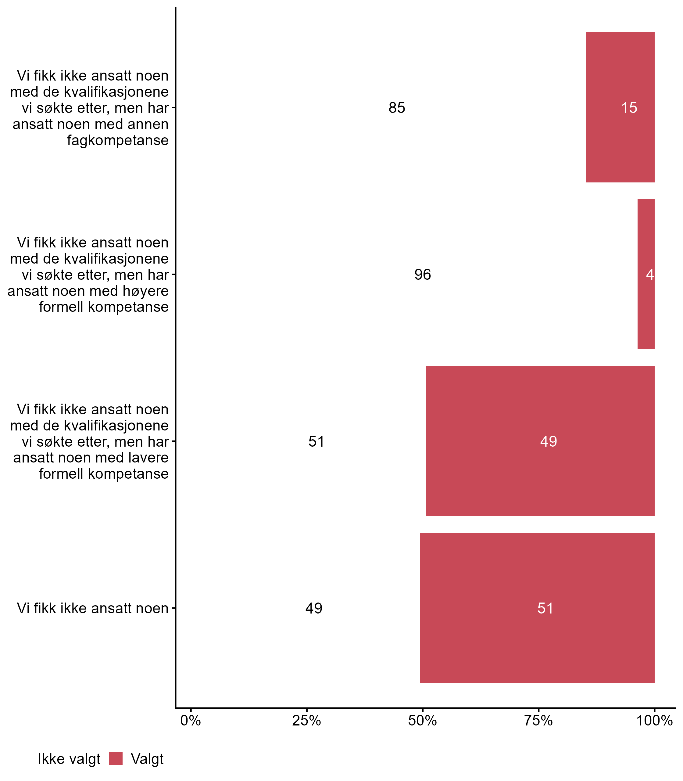 For påstanden Vi fikk ikke ansatt noen var det flere som svarte Valgt i målgruppen (0,51) enn blant andre (0,39). Færre respondenter svarte Valgt for Vi fikk ikke ansatt noen med de kvalifikasjonene vi søkte etter, men har ansatt noen med annen fagkompetanse i målgruppen (0,15) enn i andre grupper (0,26).