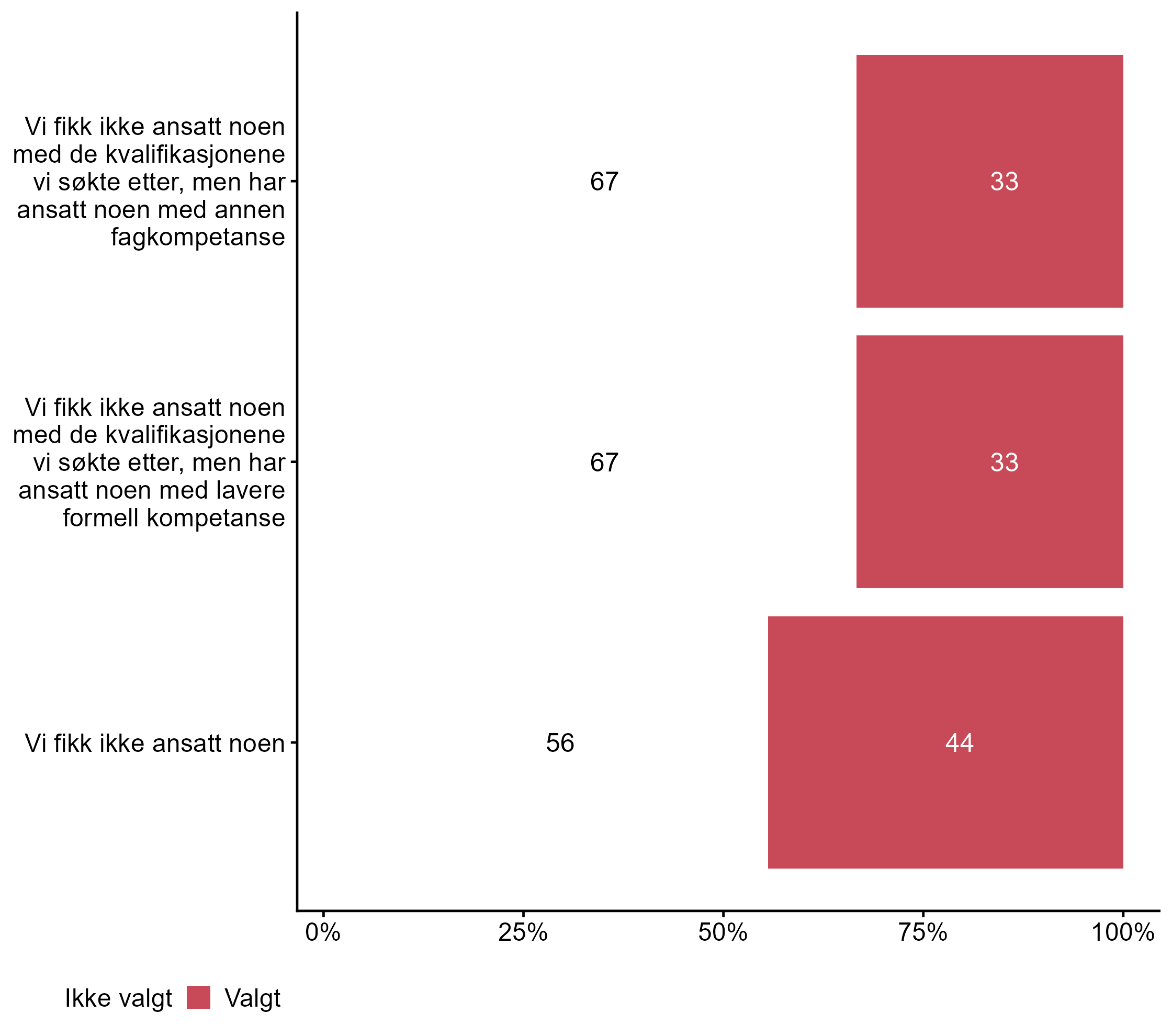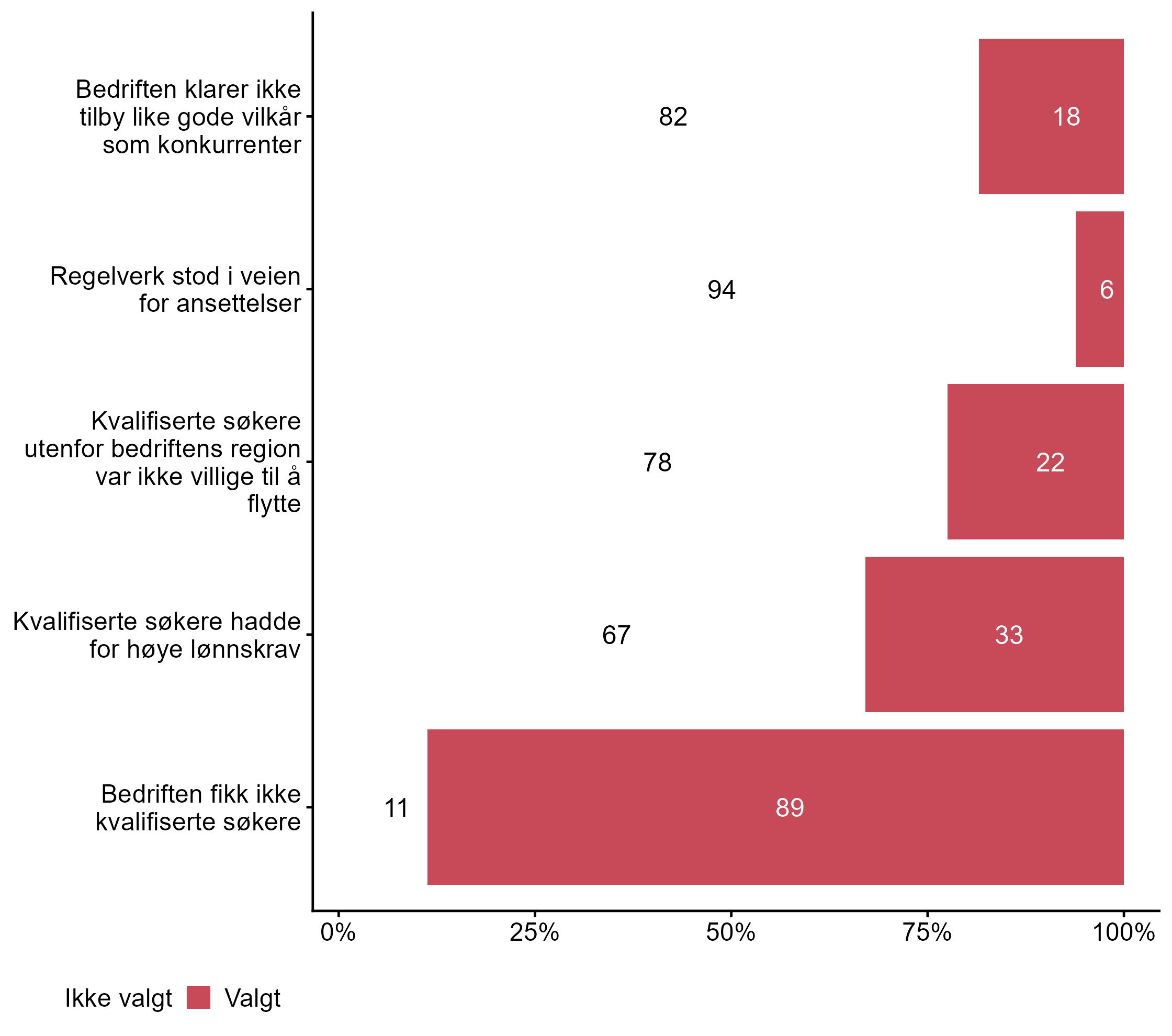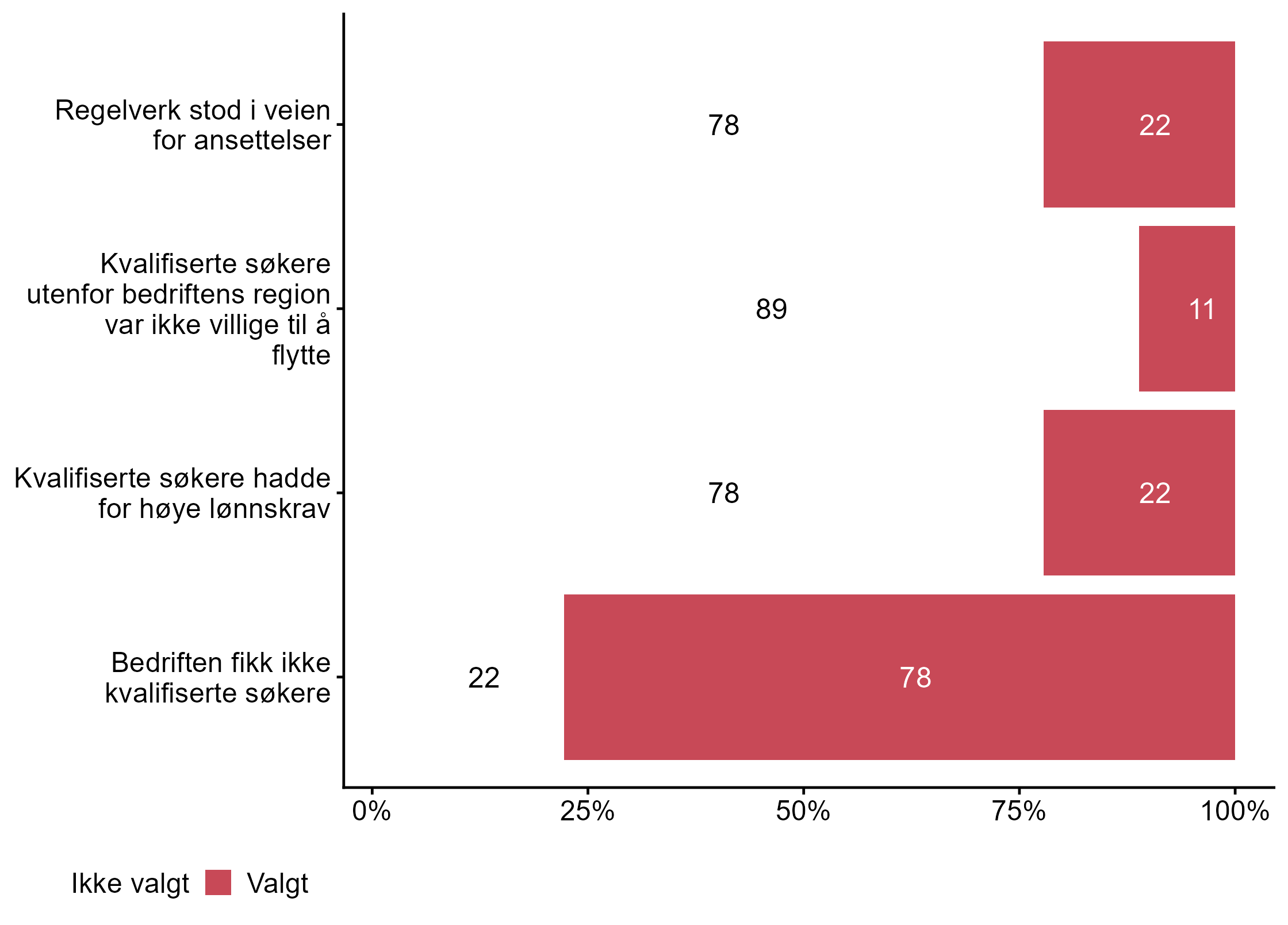 For Bedriften fikk ikke kvalifiserte søkere har målgruppen en lavere andel respondenter (0,78) enn alle andre (0,89) som svarte Valgt. For Kvalifiserte søkere hadde for høye lønnskrav har målgruppen en lavere andel respondenter (0,22) enn alle andre (0,33) som svarte Valgt. For Kvalifiserte søkere utenfor bedriftens region var ikke villige til å flytte har målgruppen en lavere andel respondenter (0,11) enn alle andre (0,22) som svarte Valgt. Flere respondenter svarte Valgt på Regelverk stod i veien for ansettelser i målgruppen (0,22) enn for alle andre (0,06).