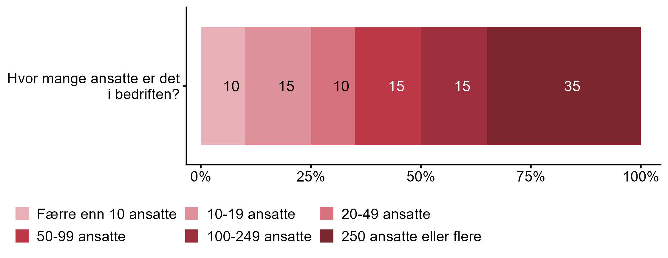 For Hvor mange ansatte er det i bedriften? har målgruppen en høyere andel respondenter (0,5) enn alle andre (0,23) som svarte 100-249 ansatte eller 250 ansatte eller flere.