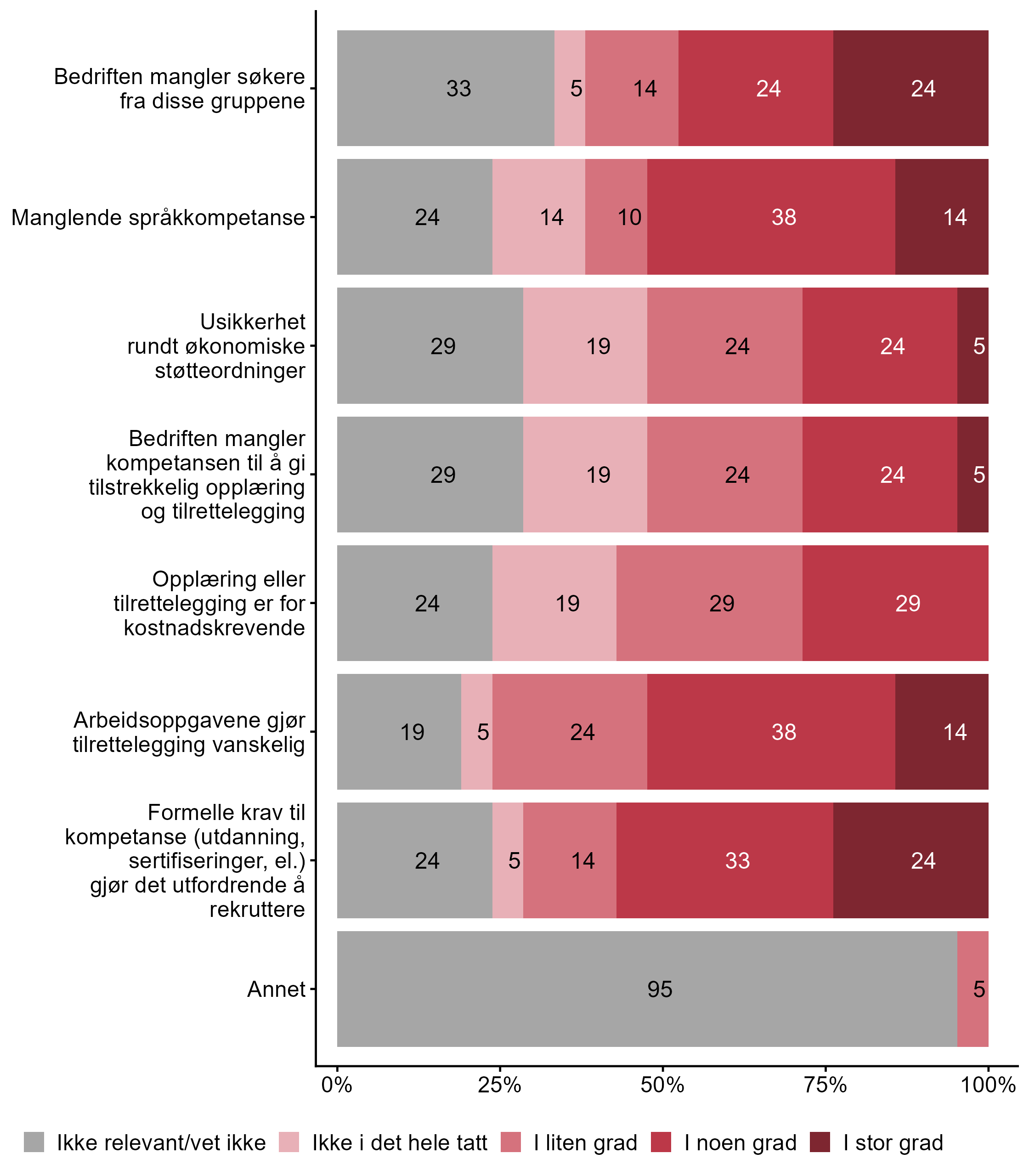 5.2 I hvilken grad opplever bedriften følgende barrierer når det gjelder å rekruttere personer fra disse gruppene?