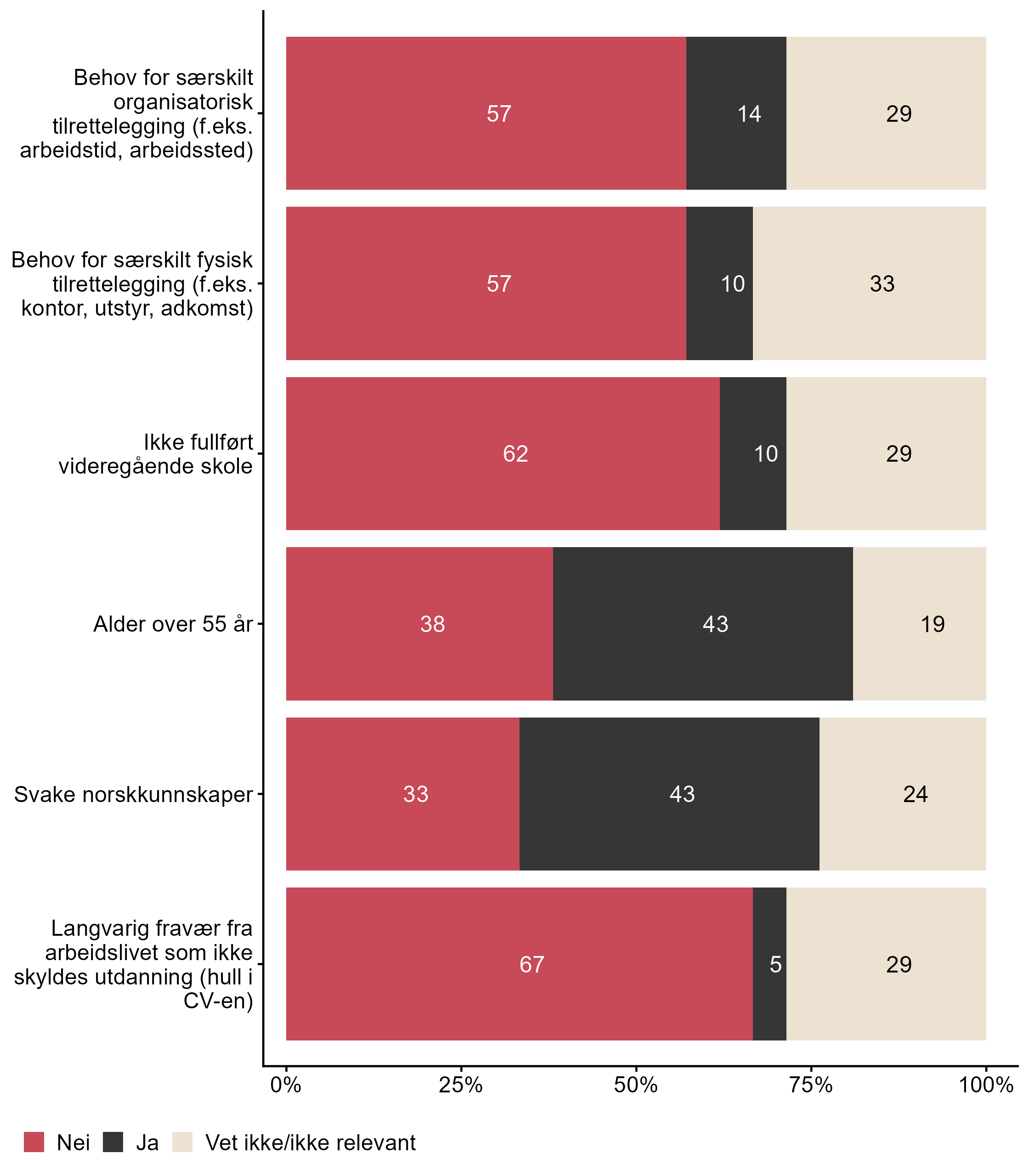 For påstanden Svake norskkunnskaper var det flere som svarte Ja eller Vet ikke/ikke relevant i målgruppen (0,67) enn blant andre (0,52). For påstanden Alder over 55 år var det flere som svarte Ja eller Vet ikke/ikke relevant i målgruppen (0,62) enn blant andre (0,41). For påstanden Behov for særskilt fysisk tilrettelegging (f.eks. kontor, utstyr, adkomst) var det flere som svarte Ja eller Vet ikke/ikke relevant i målgruppen (0,43) enn blant andre (0,21). For påstanden Behov for særskilt organisatorisk tilrettelegging (f.eks. arbeidstid, arbeidssted) var det flere som svarte Ja eller Vet ikke/ikke relevant i målgruppen (0,43) enn blant andre (0,32).