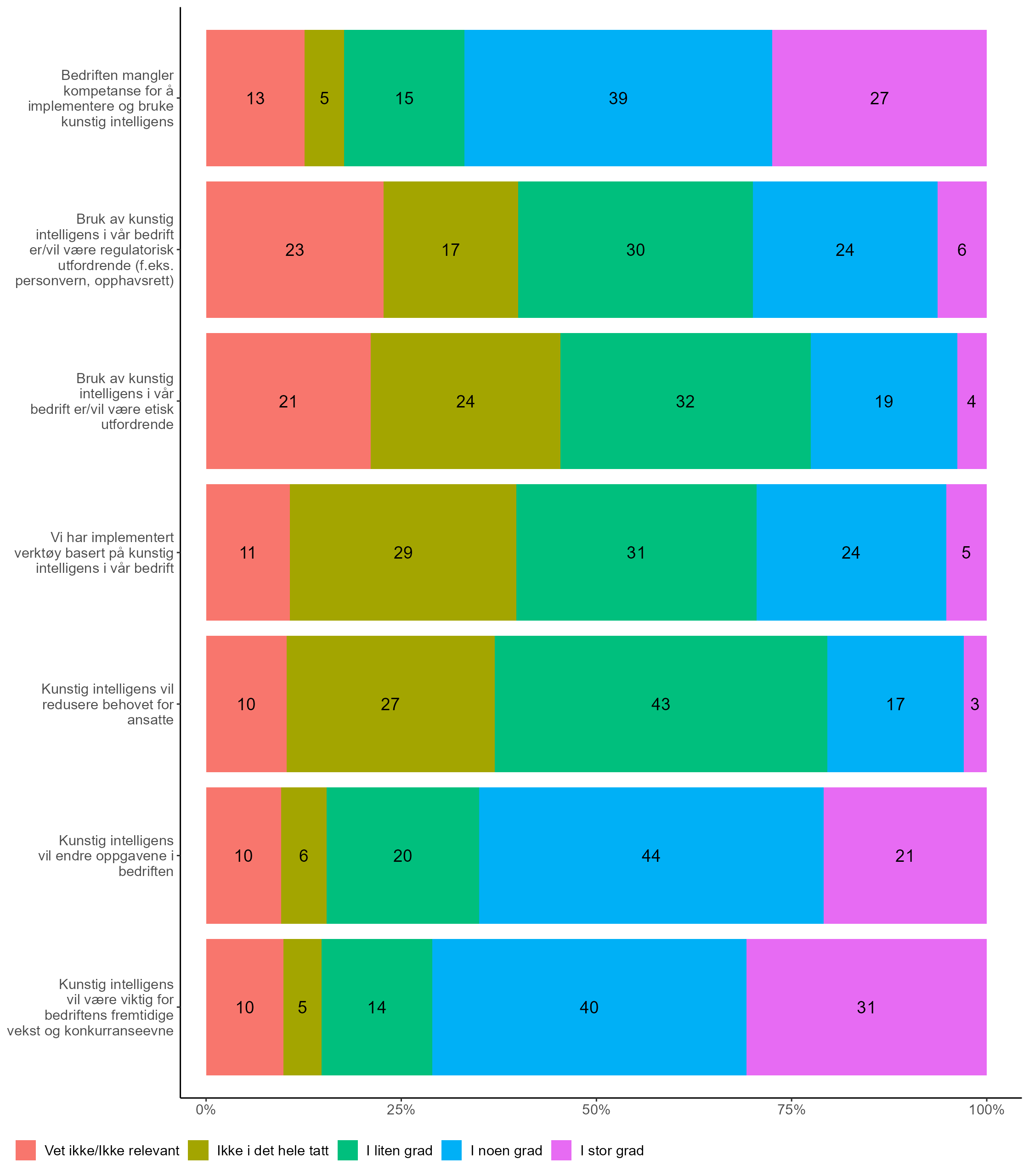 Bedriftene ble bedt om å krysse av for hvilke påstander som beskriver utfordringer knyttet til kompetansebehov og digital teknologi, figur 6.7 viser den overordnede svarfordelingen.