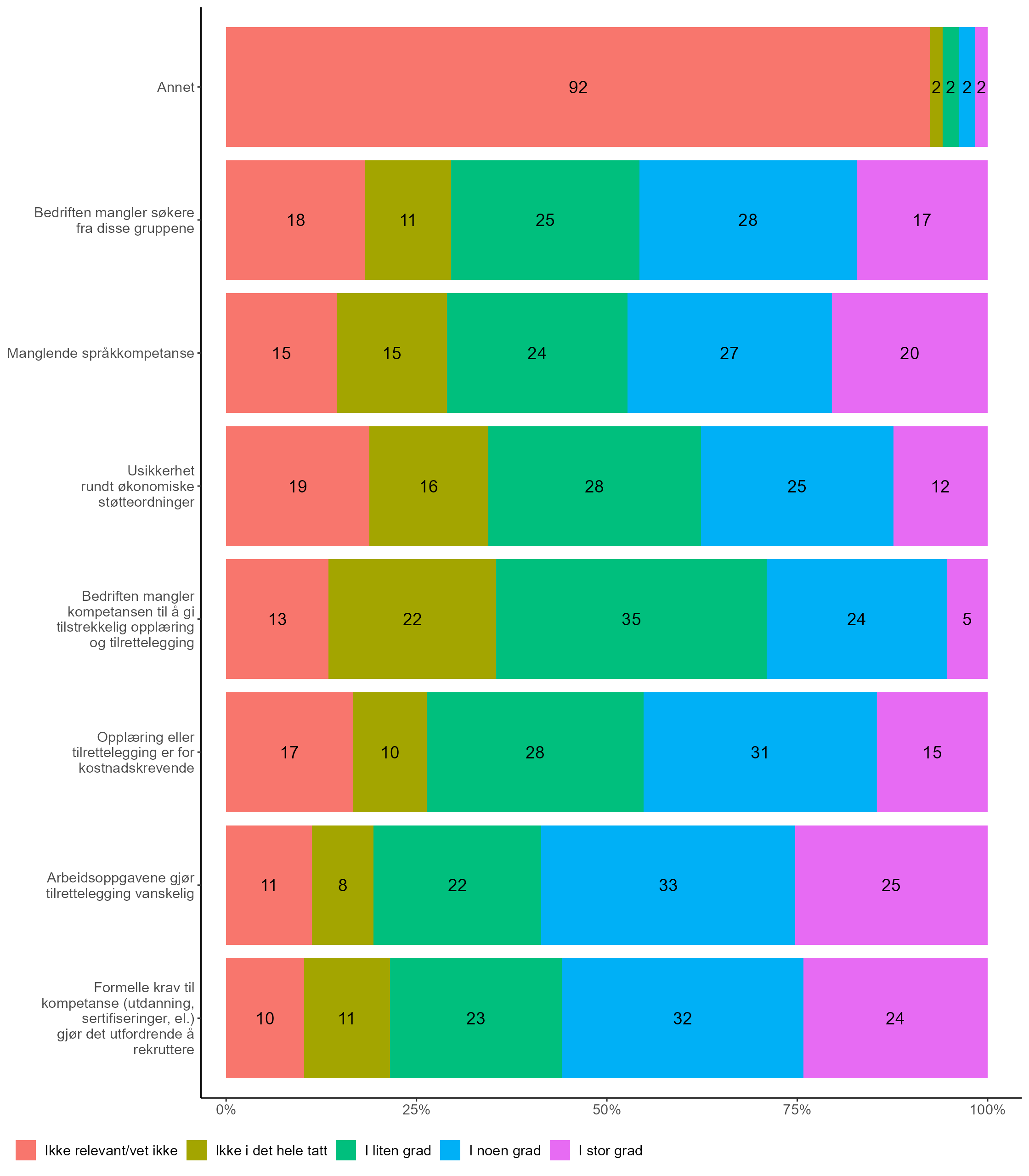 I figur 5.2 viser vi i hvilke grad bedrifter opplever barrierer når det kommer til å rekruttere personer fra disse gruppene.