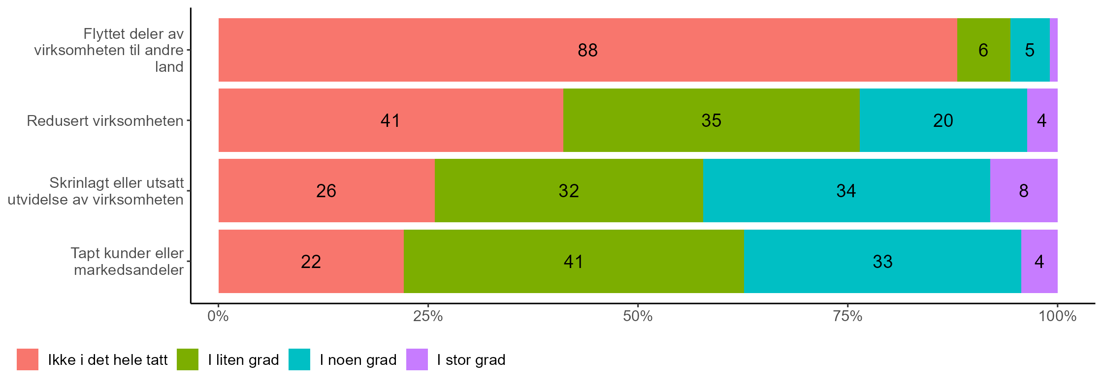 De som svarte “I noen grad” eller “I stor grad” på spørsmål om bedriften har et udekket kompetansebehov i dag fikk også spørsmål i hvilken grad de har blitt utsatt for konsekvenser av mangel på kompetanse på en skala fra 1 (ikke i det hele tatt) til 4 (i stor grad). Overordnet svarfordeling blir presentert i figur 3.6.