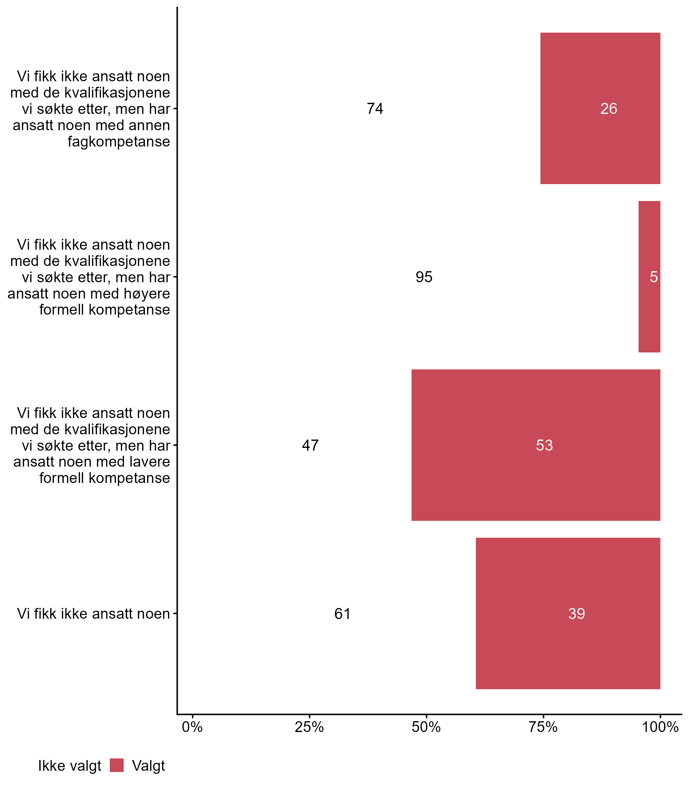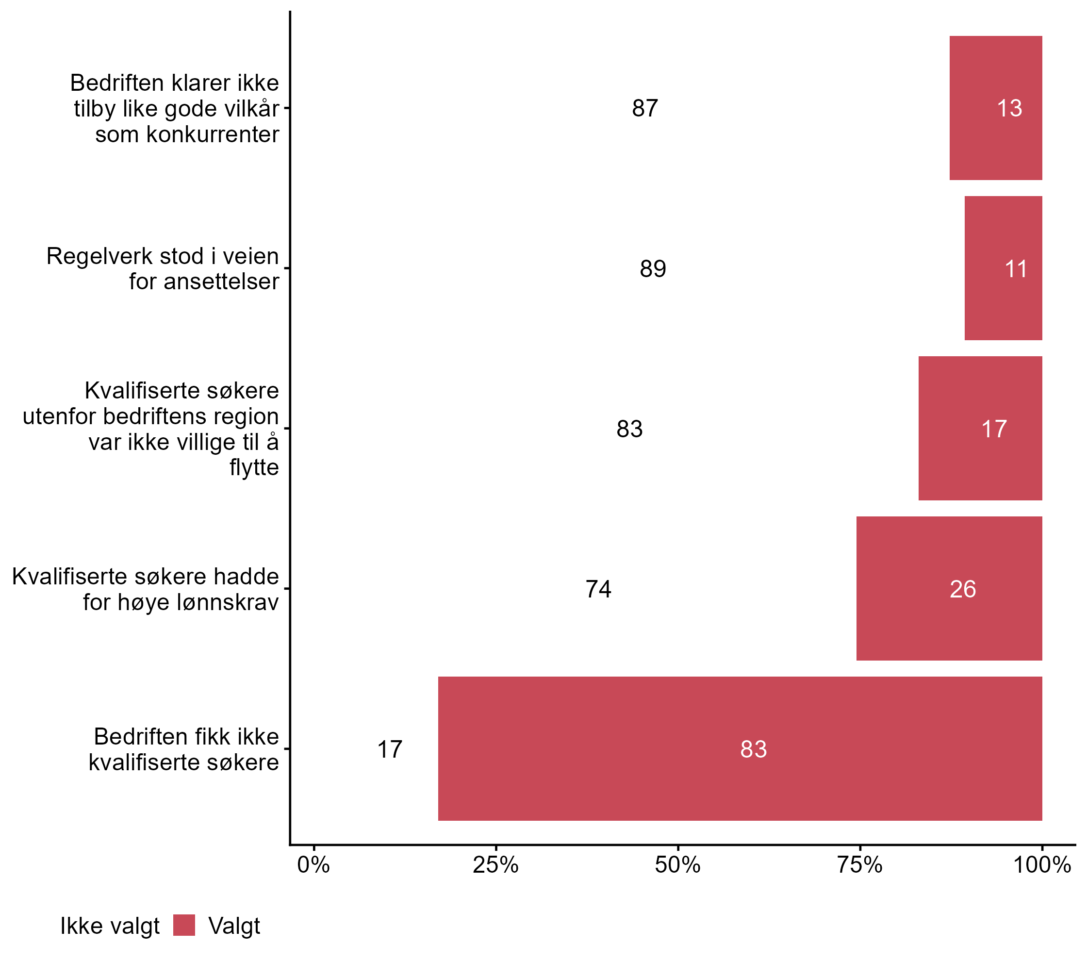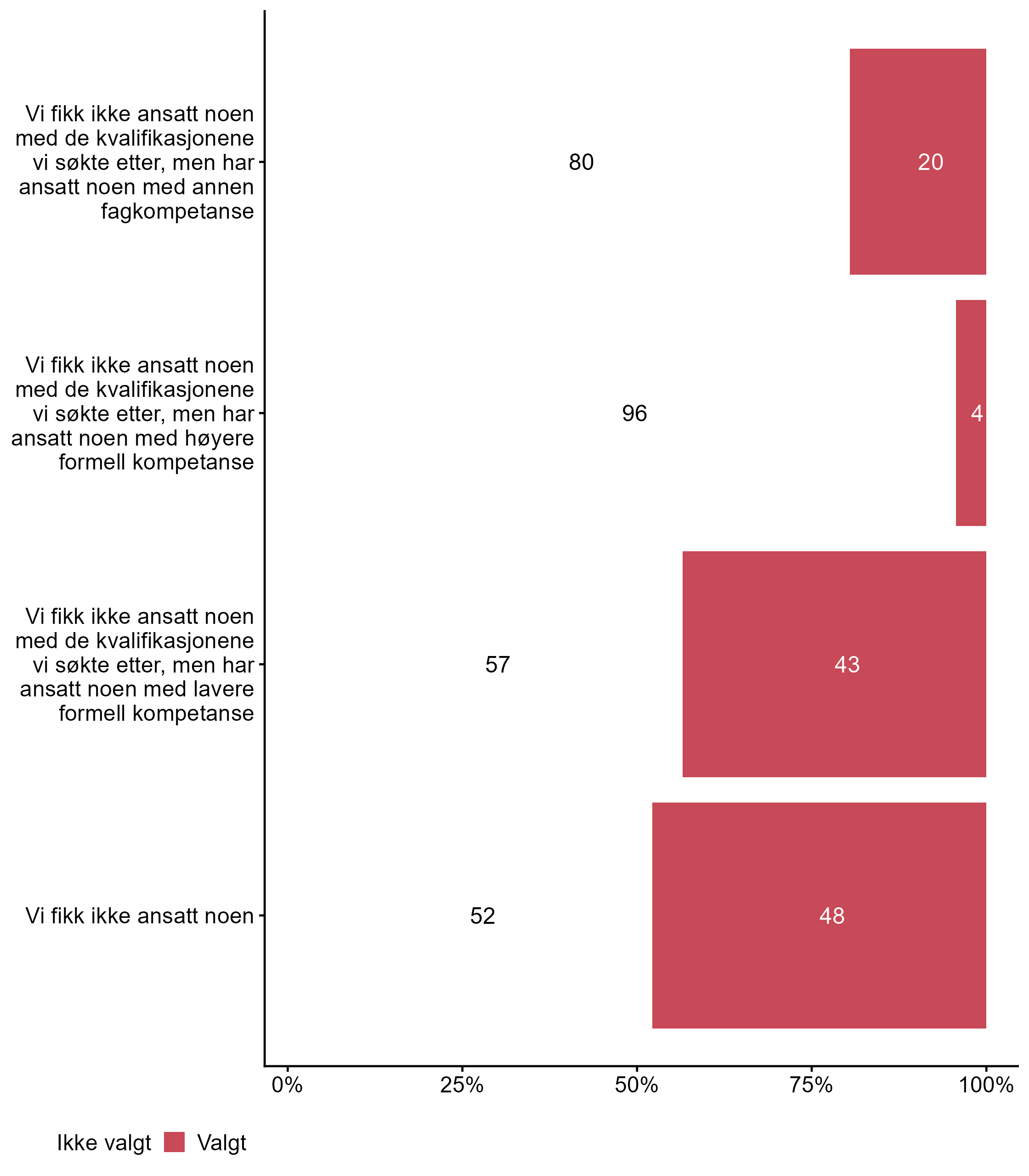 4.3 Du har svart at bedriften har forsøkt å rekruttere personer det siste året uten å få tak i ønsket kompetanse. Hva er årsaken(e) til at bedriften ikke fikk ansatt noen med ønsket kompetanse?