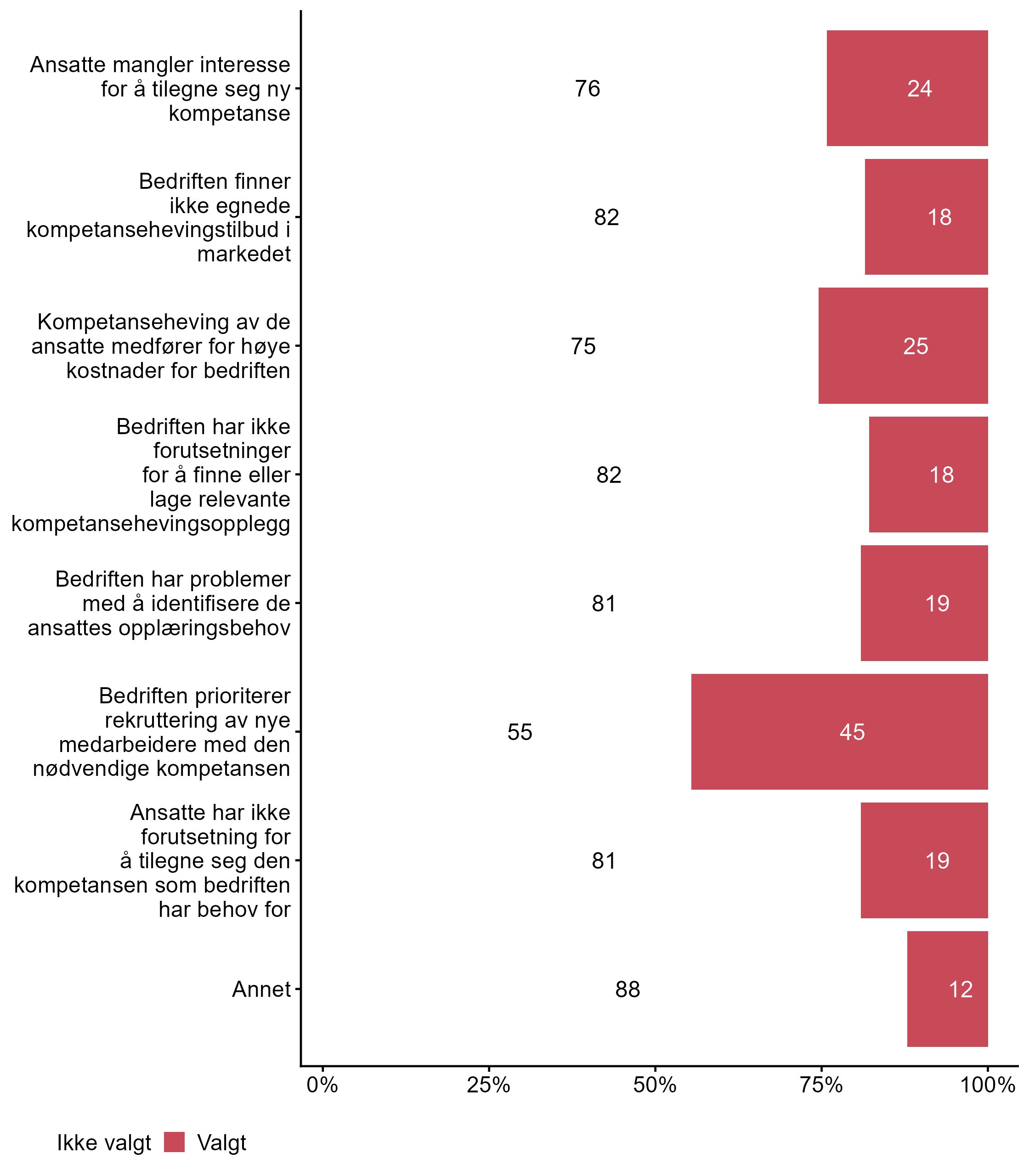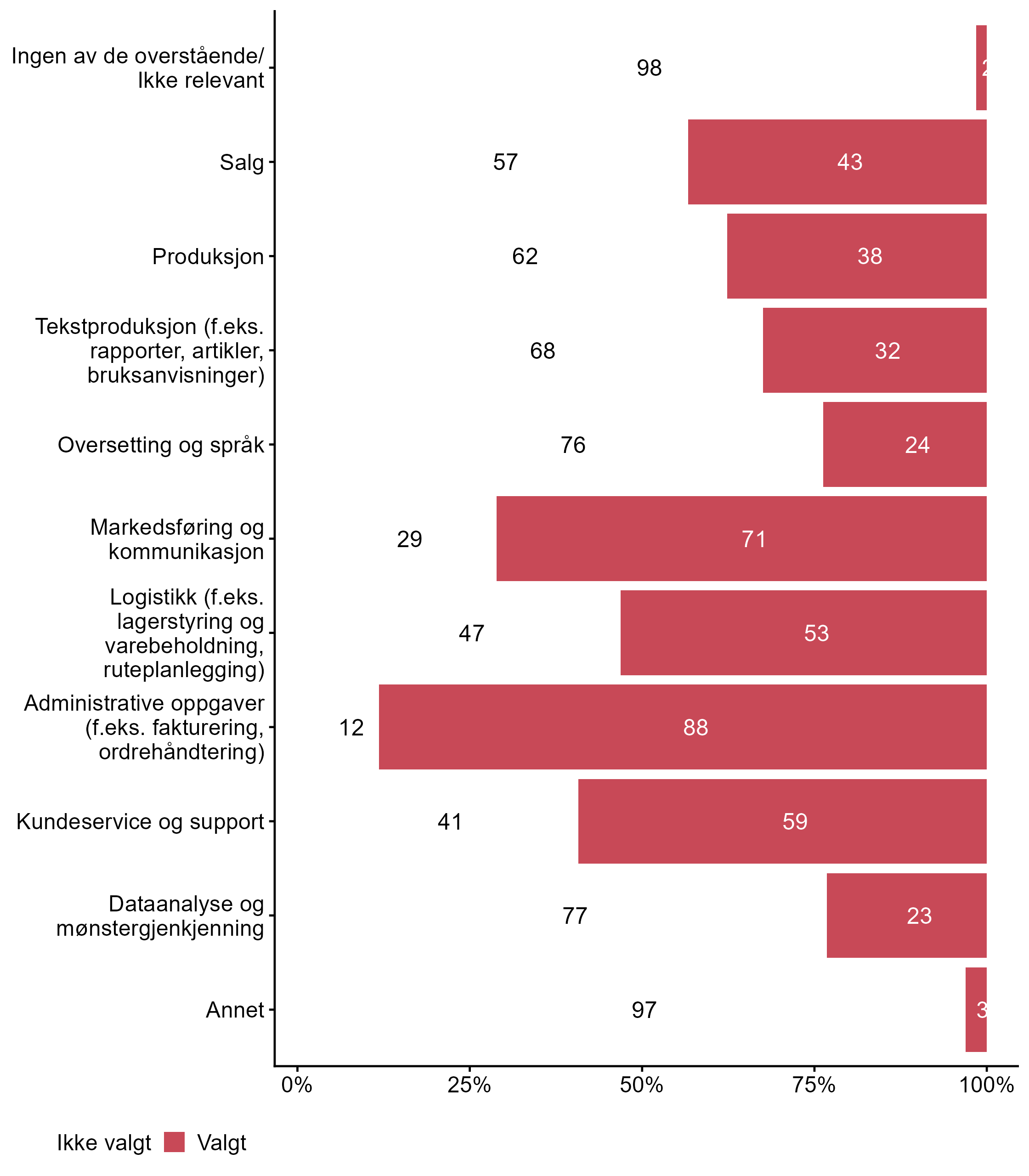 | .variable_label | Ikke valgt (%) | Valgt (%) | Totalt (N) |