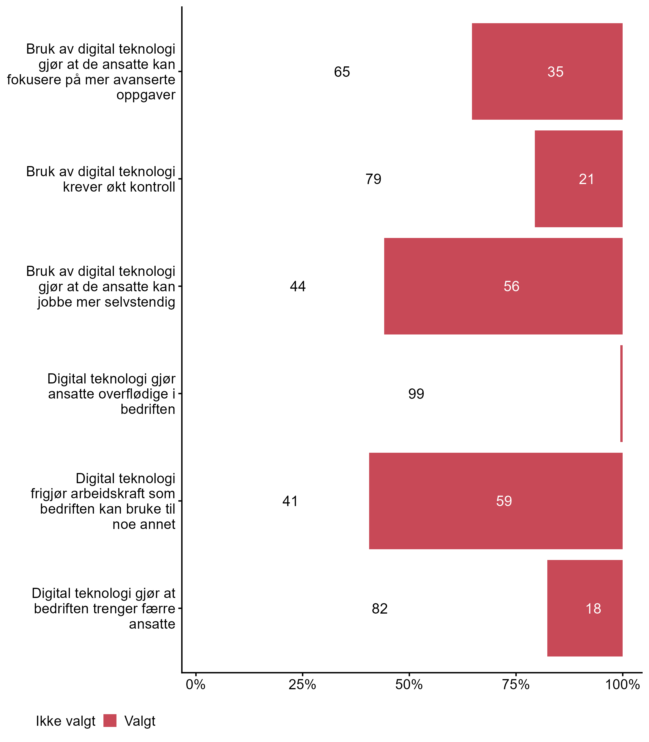 For Bruk av digital teknologi gjør at de ansatte kan fokusere på mer avanserte oppgaver har målgruppen en lavere andel respondenter (0,35) enn alle andre (0,5) som svarte Valgt.