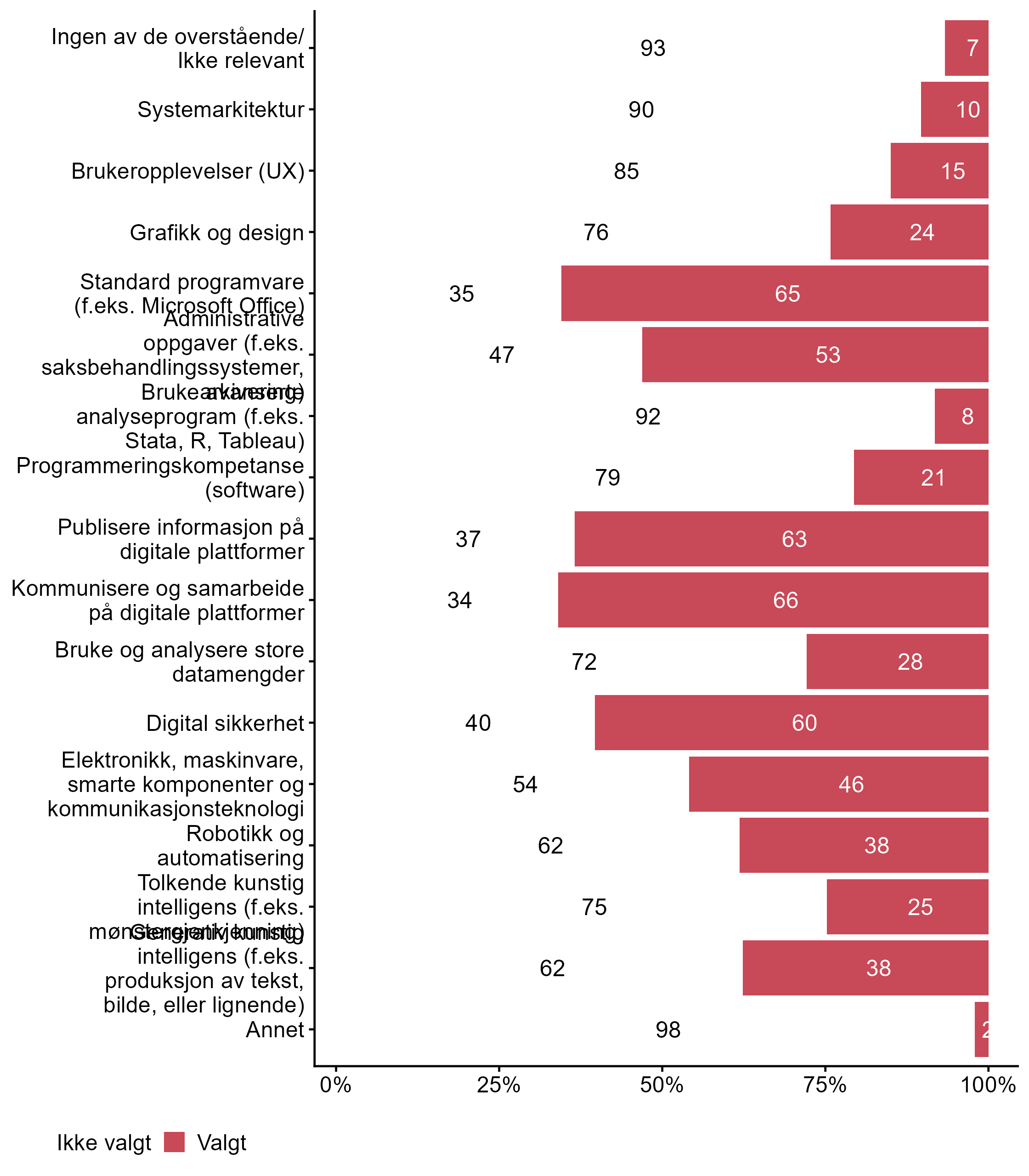 | Bruke avanserte analyseprogram (f.eks. Stata, R, Tableau) Spesialisert IKT-kompetanse | 36 | 64 | 11 |