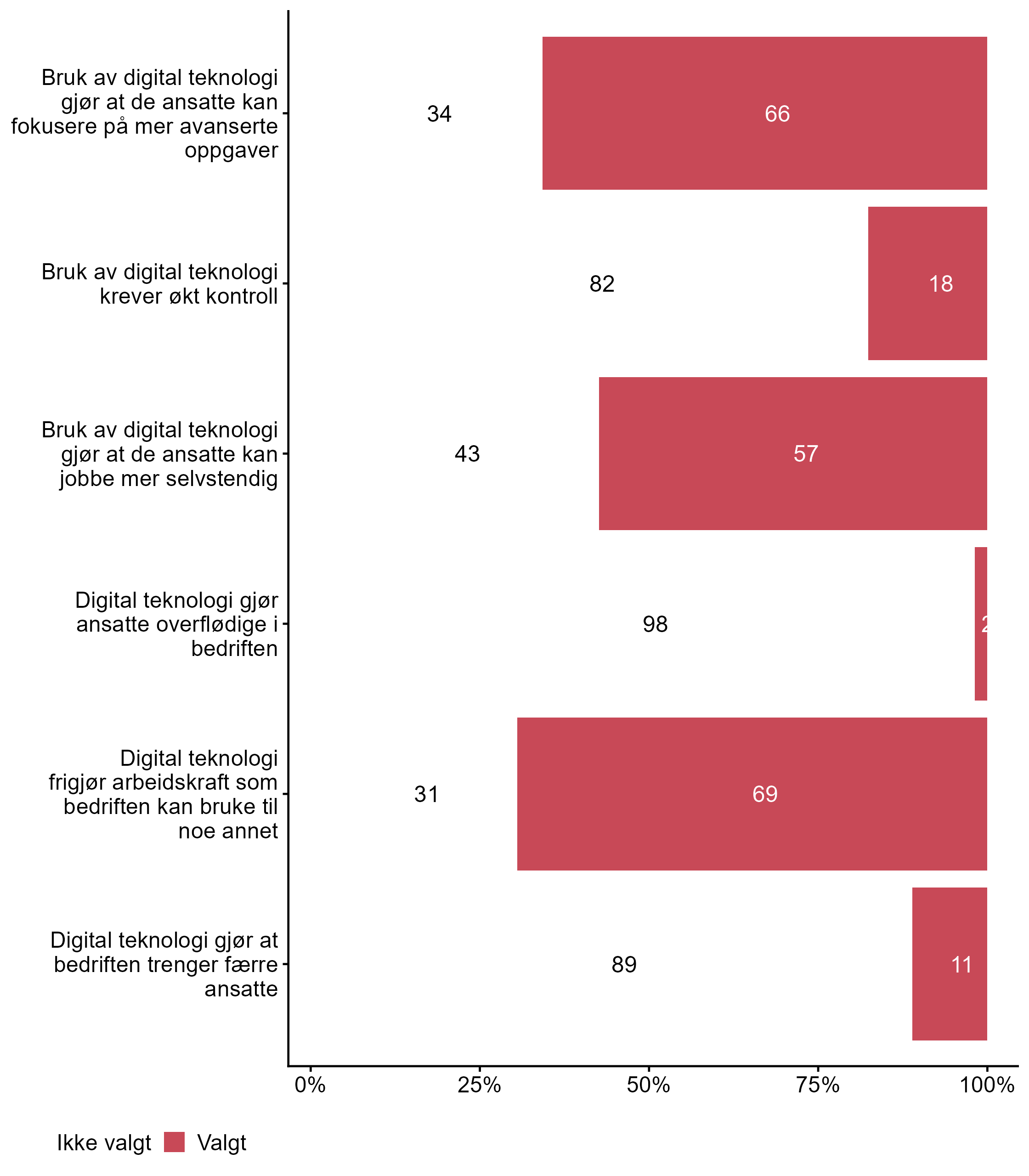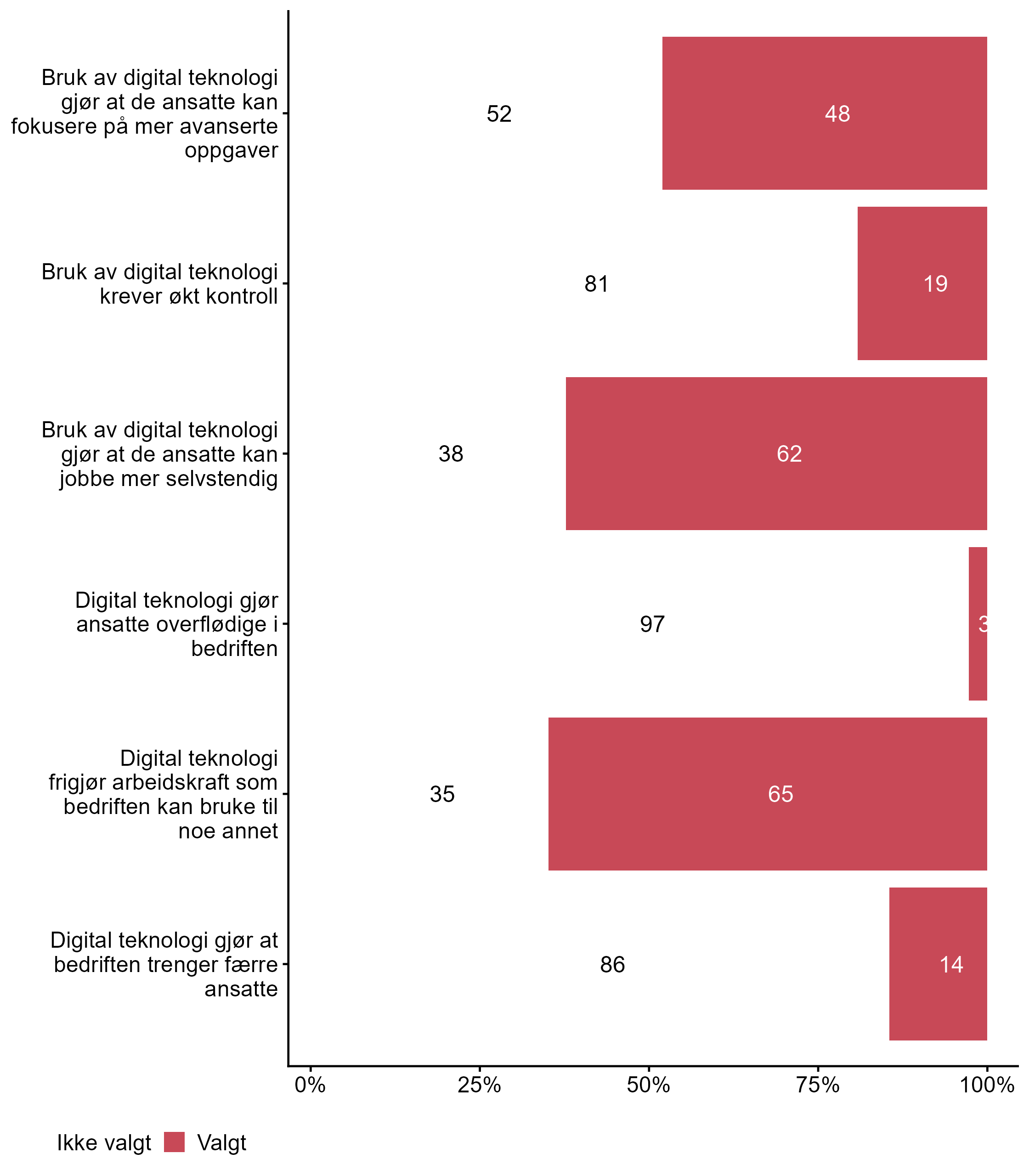 Flere respondenter svarte Valgt på Bruk av digital teknologi gjør at de ansatte kan fokusere på mer avanserte oppgaver i målgruppen (0,66) enn for alle andre (0,48).