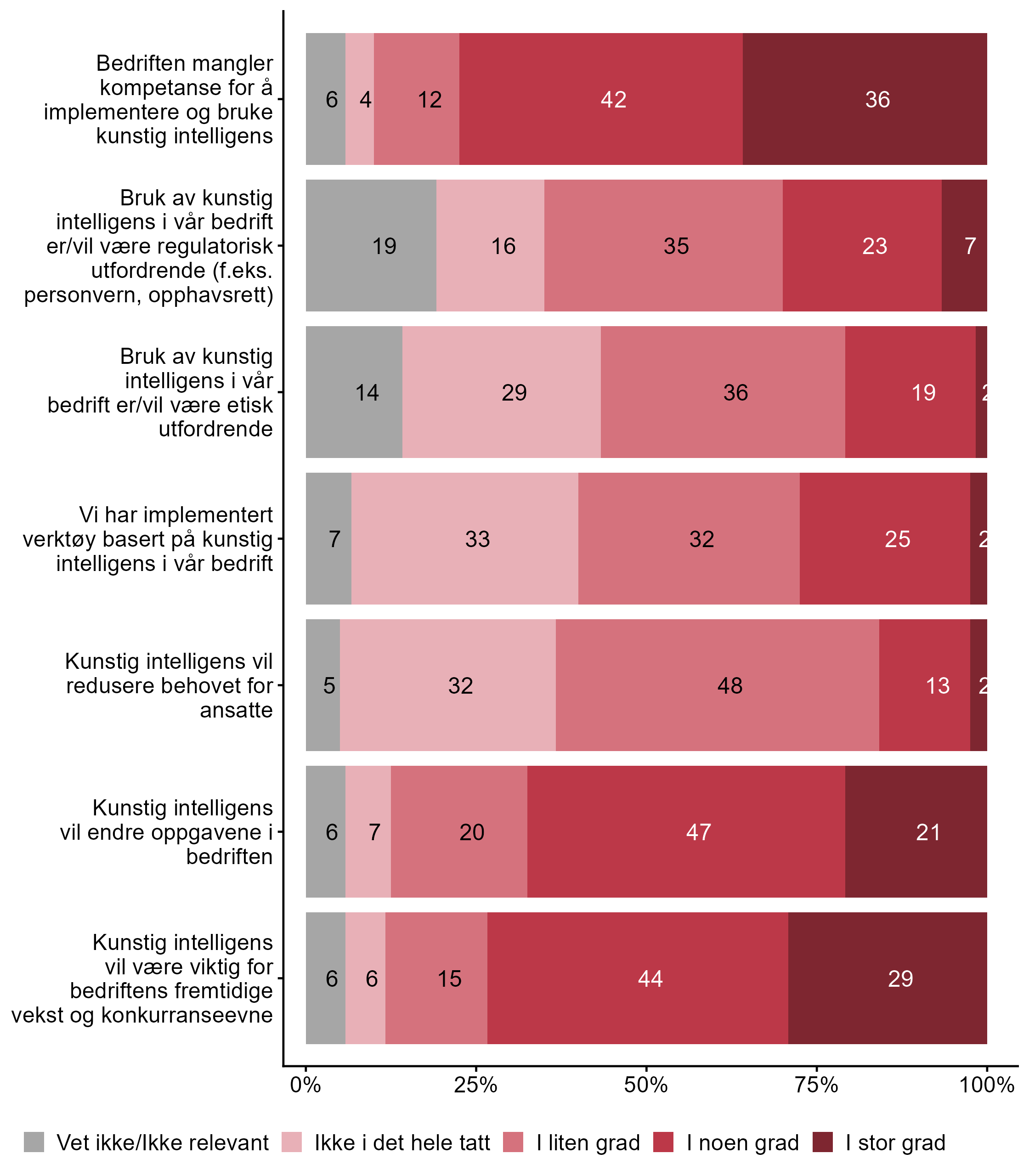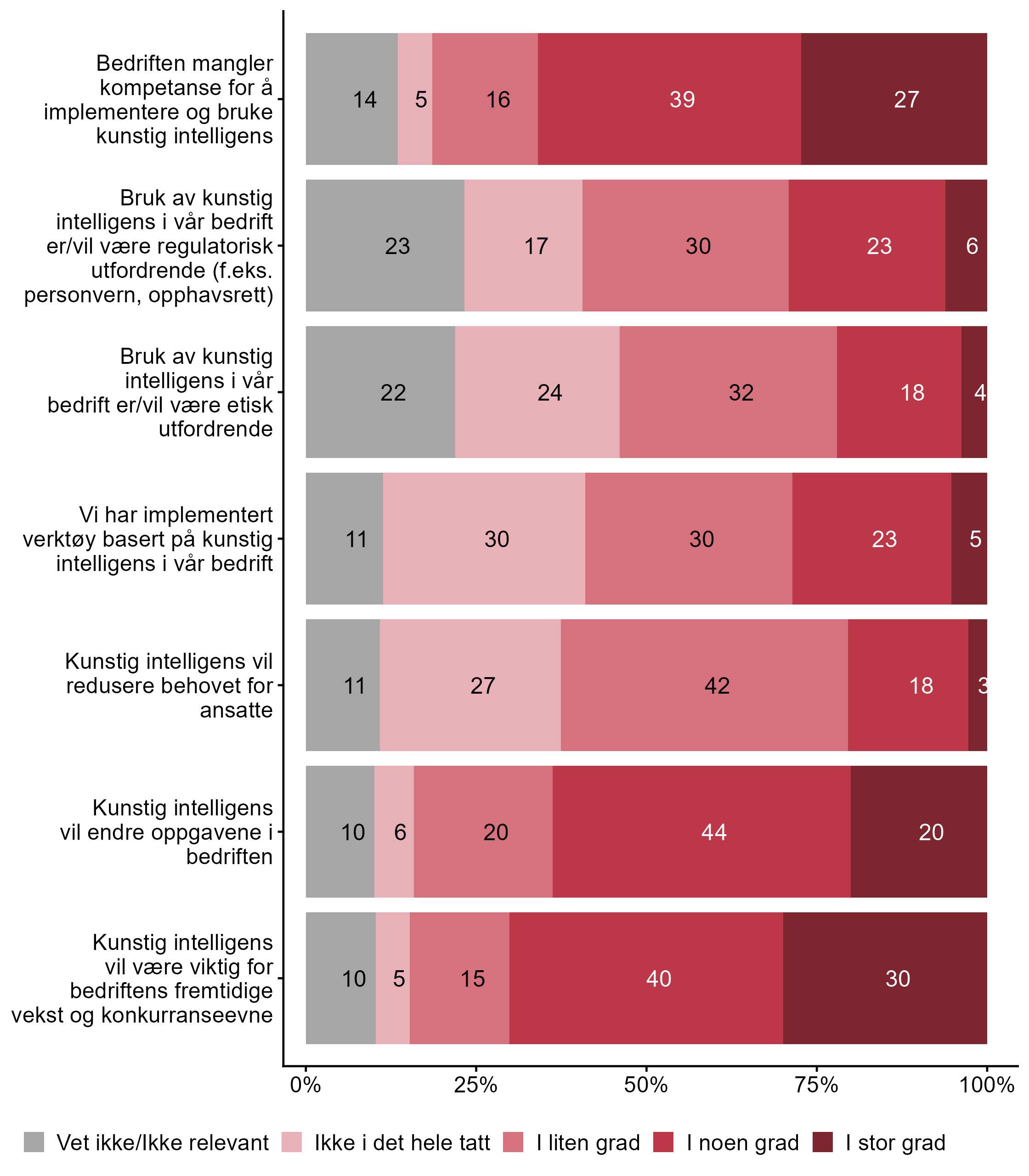 | Generativ kunstig intelligens (f.eks. produksjon av tekst, bilde, eller lignende) Generell IKT-kompetanse blant de ansatte | 17 | 83 | 42 |