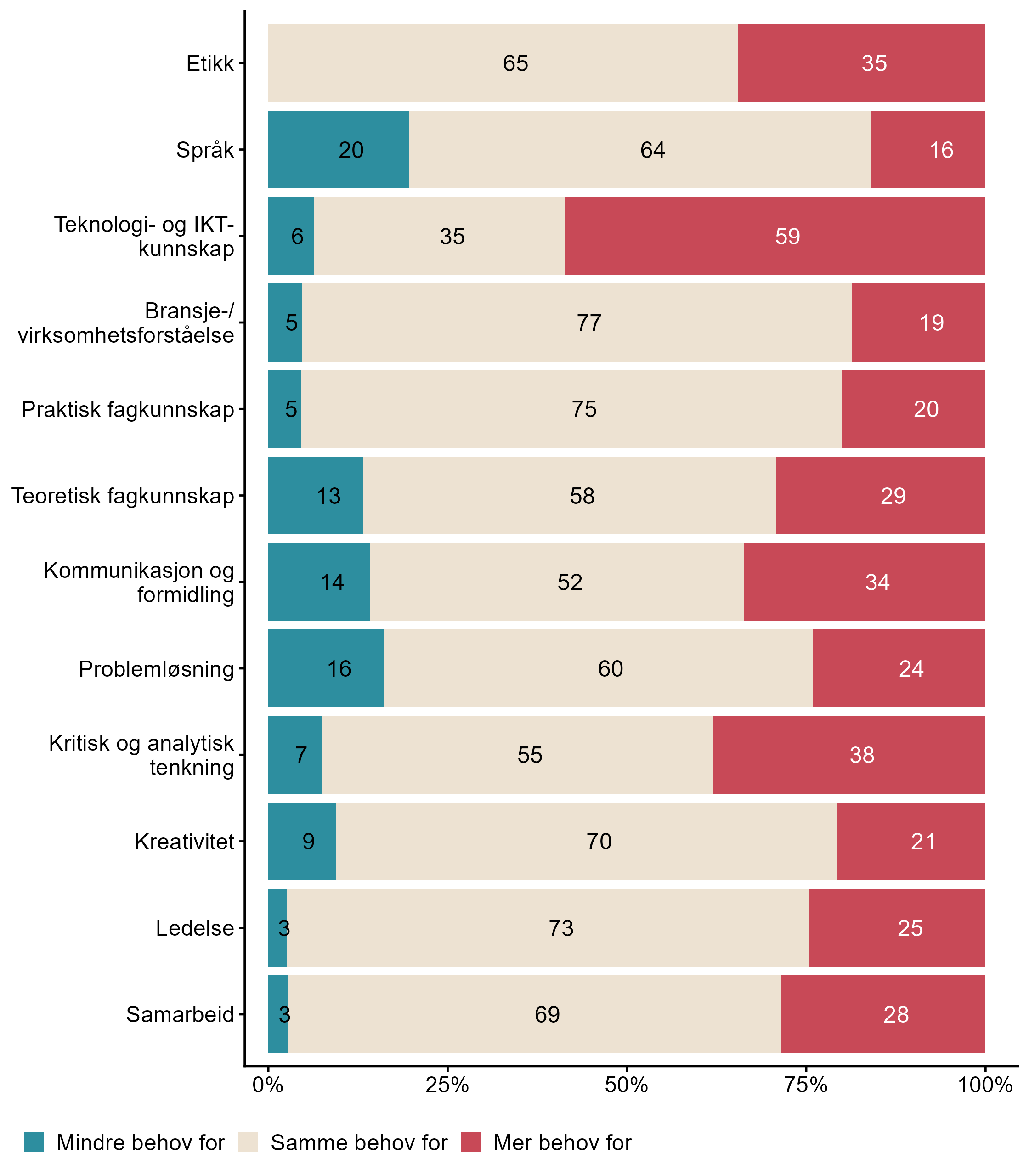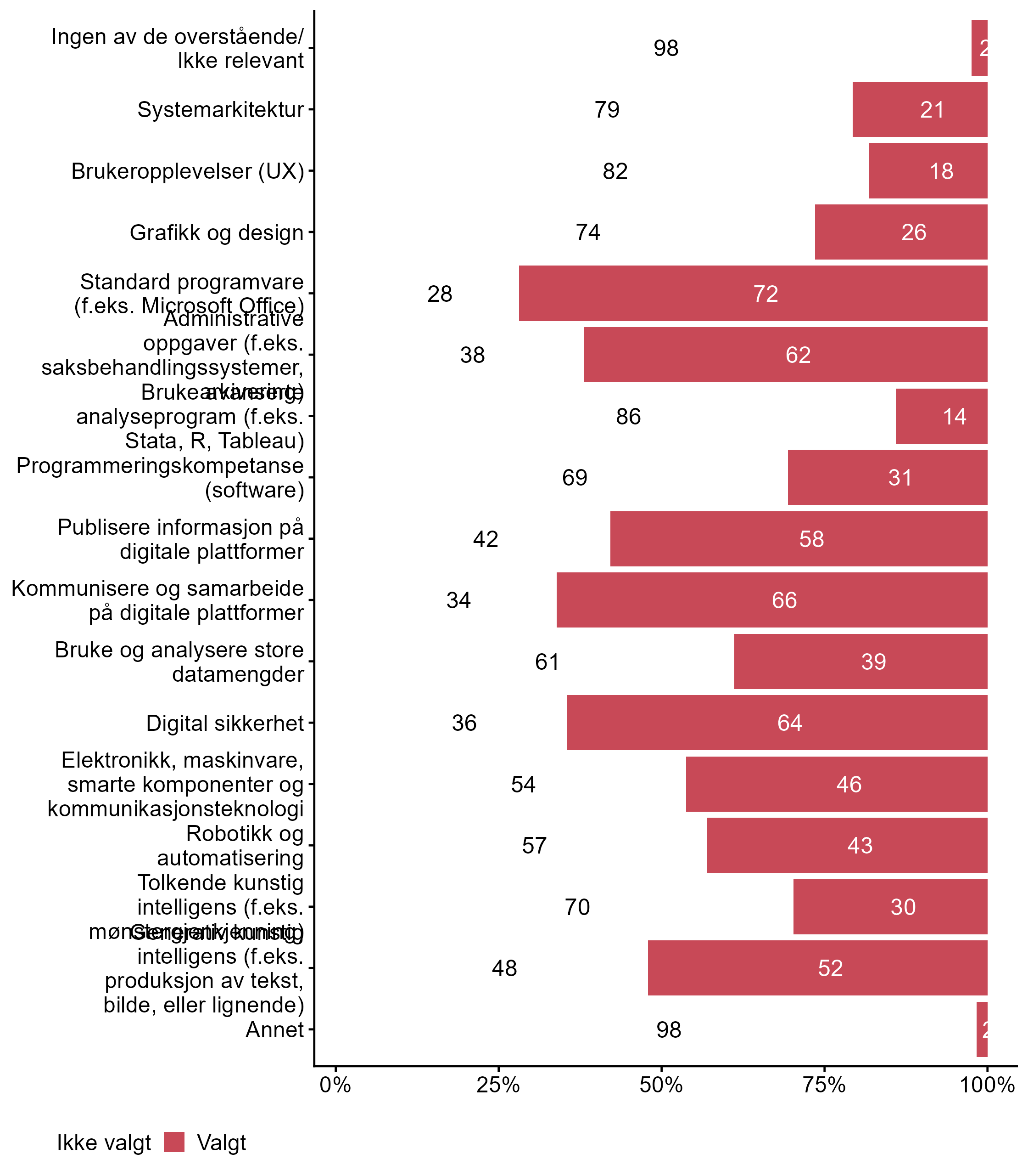 | Generativ kunstig intelligens (f.eks. produksjon av tekst, bilde, eller lignende) Spesialisert IKT-kompetanse | 67 | 33 | 42 |