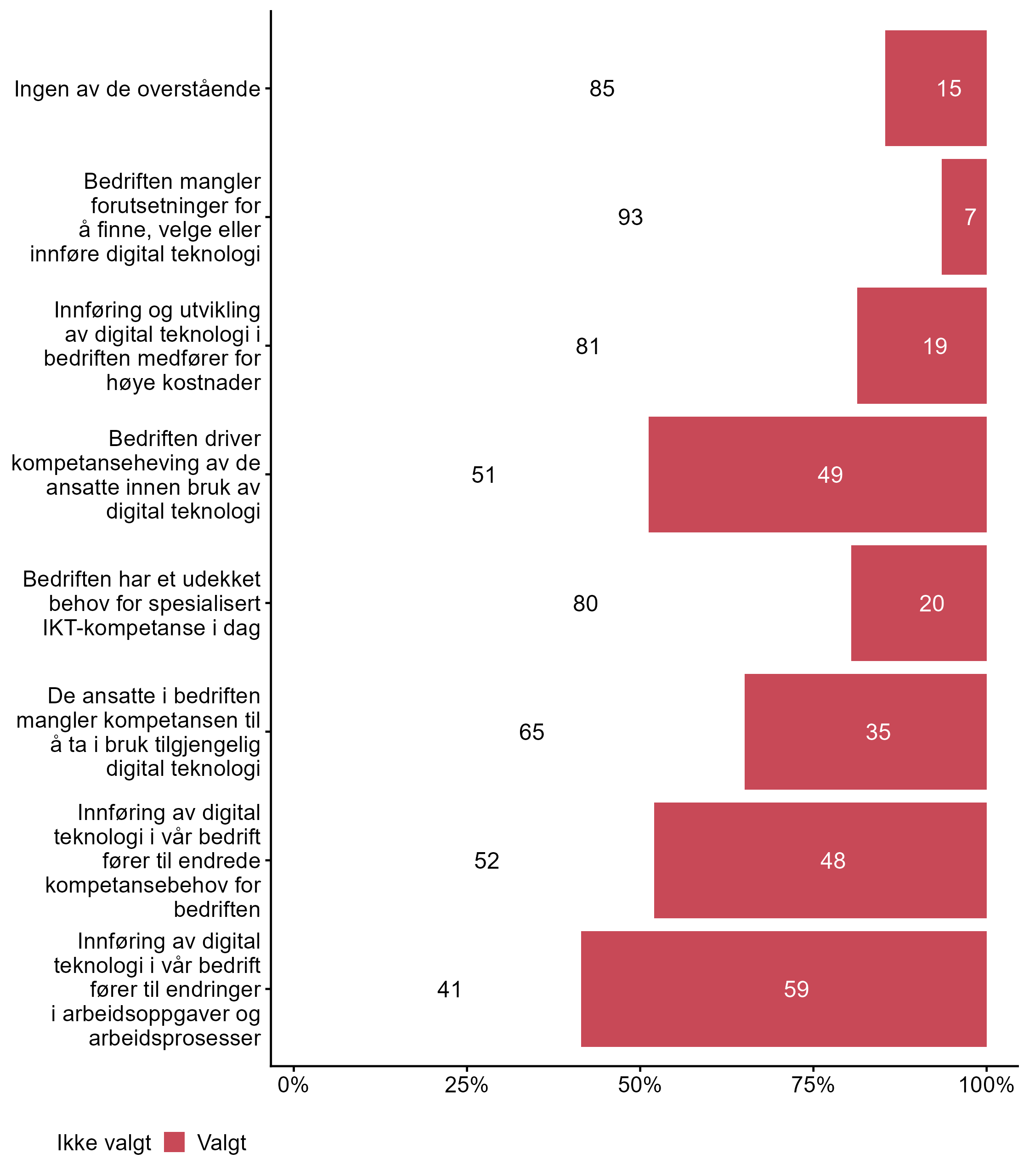 Bedriftene i undersøkelsen fikk spørsmål om IKT og digitalisering, hvilke eventuelle endringer det fører til i bedriften, relevante digitale teknologier, og hvordan digital teknologi påvirker kompetansebehovet for bedriften. I tillegg fikk respondentene en rekke påstander om kunstig intelligens og utfordringer bedriften har knyttet til kompetansebehov innen digital teknologi.