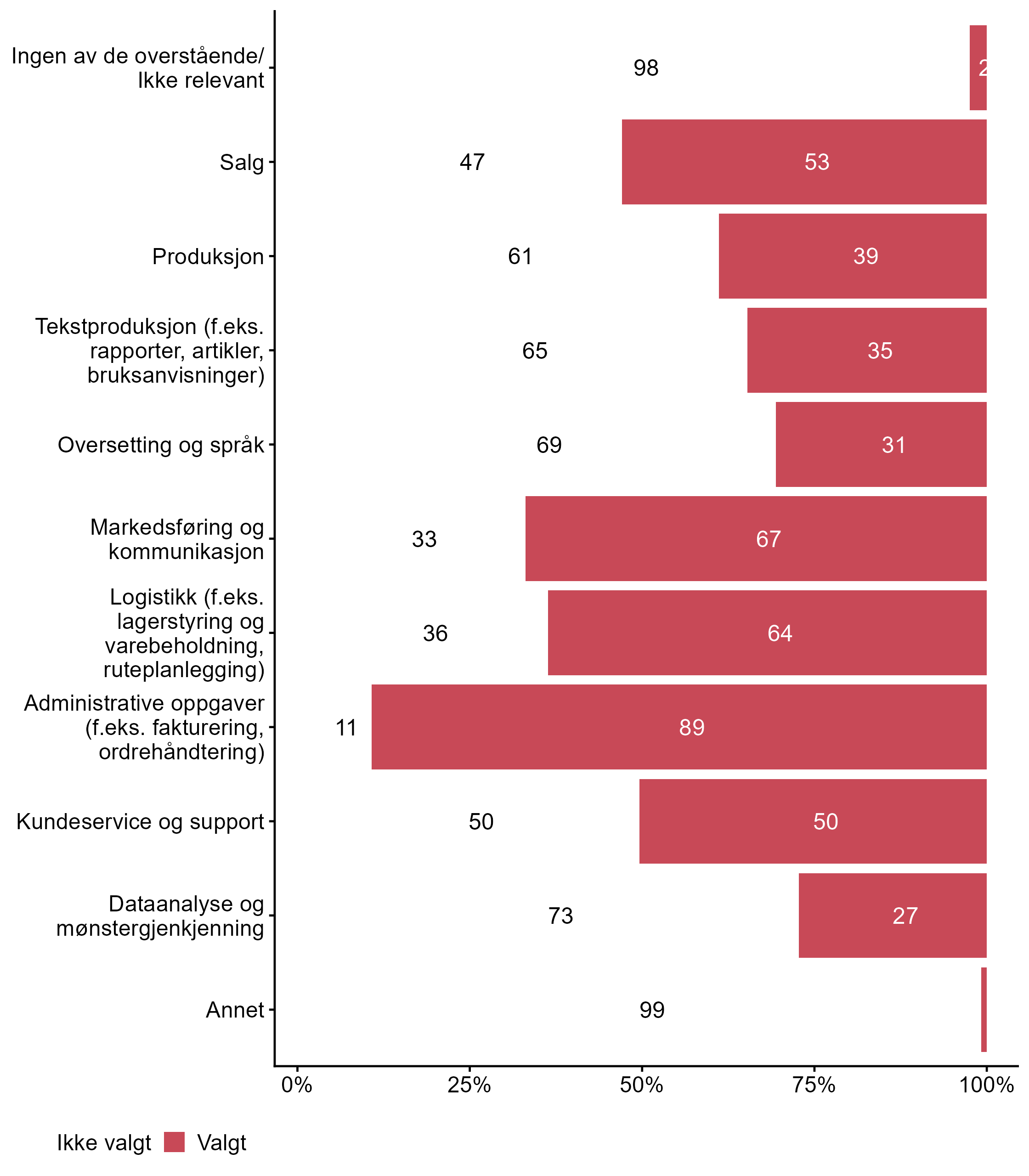 For Logistikk (f.eks. lagerstyring og varebeholdning, ruteplanlegging) har målgruppen en høyere andel respondenter (0,64) enn alle andre (0,49) som svarte Valgt.