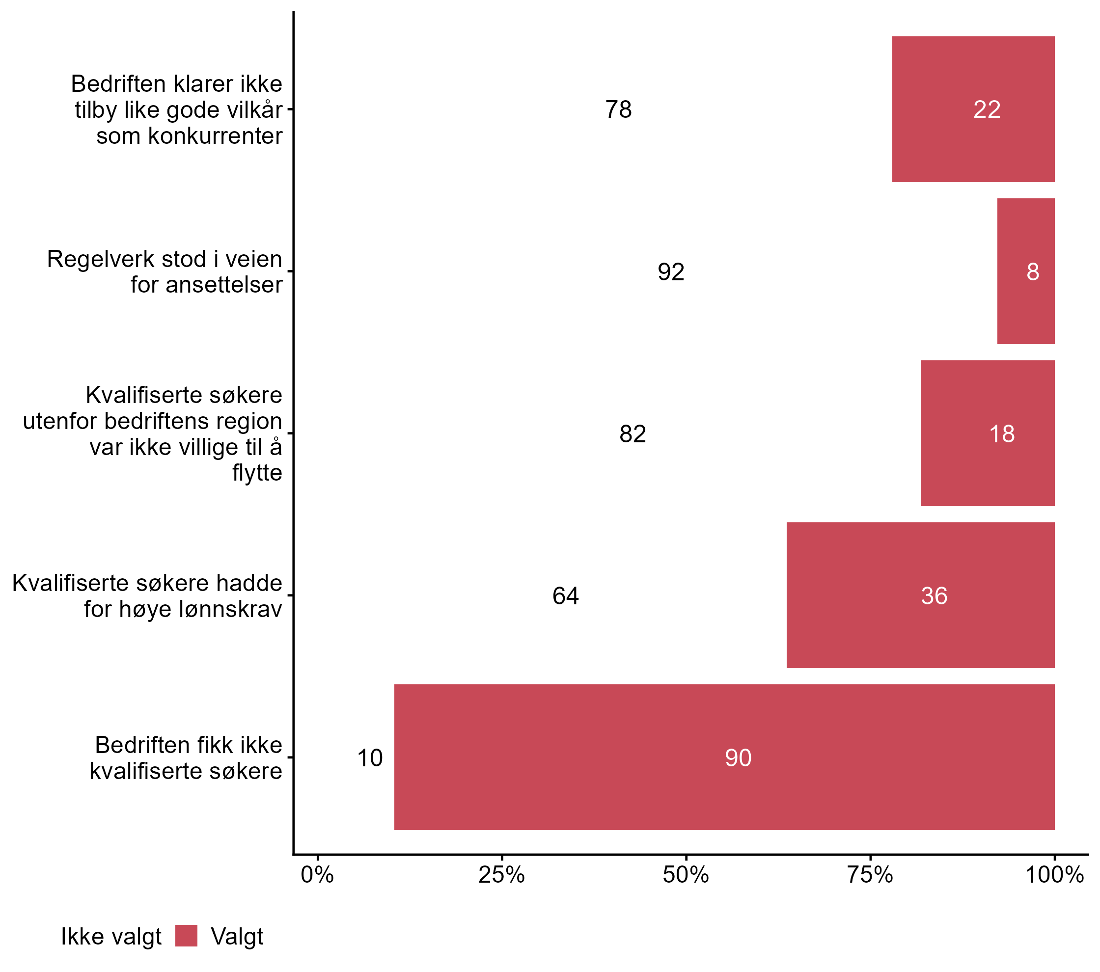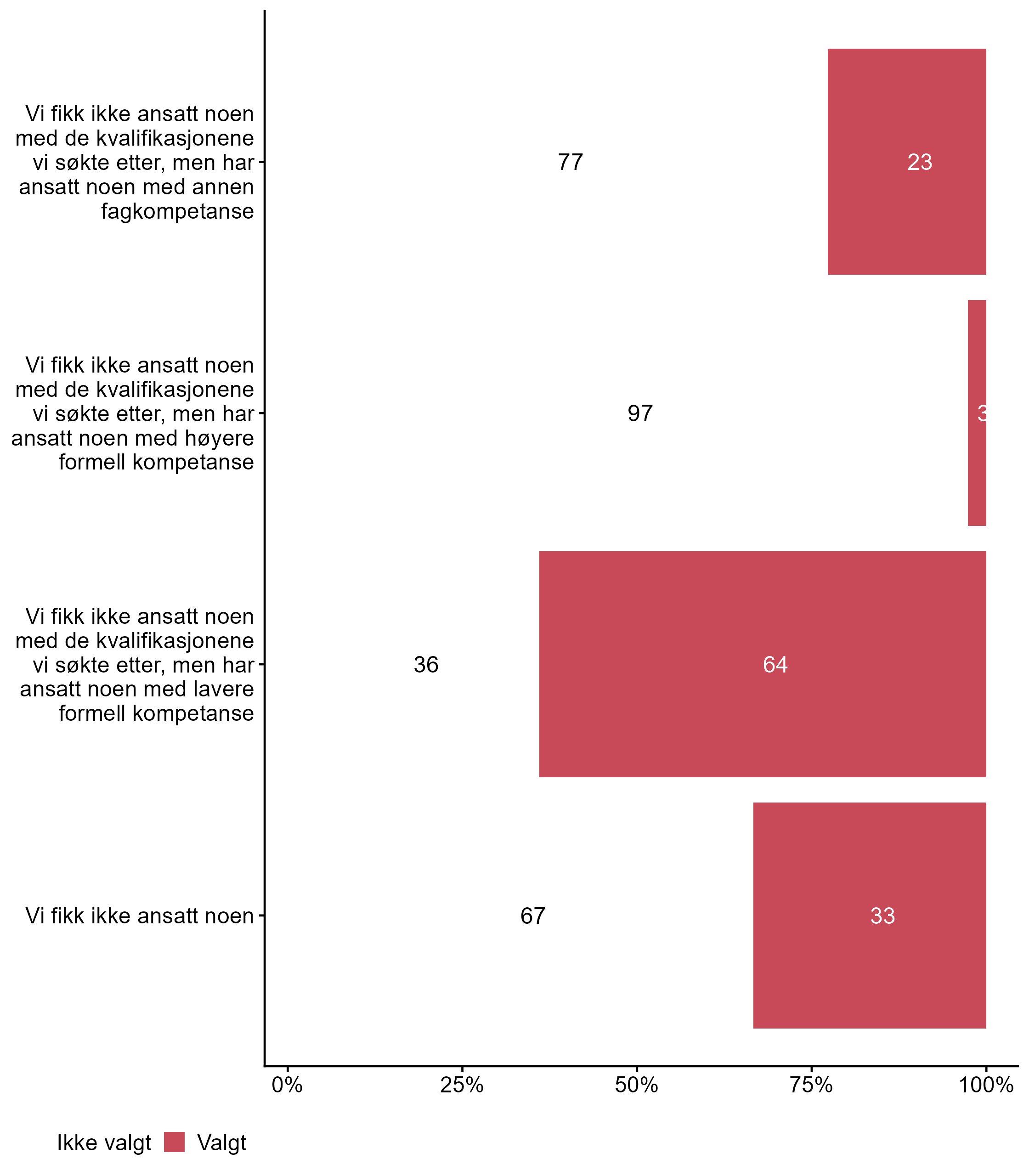 Flere respondenter svarte Valgt på Vi fikk ikke ansatt noen med de kvalifikasjonene vi søkte etter, men har ansatt noen med lavere formell kompetanse i målgruppen (0,64) enn for alle andre (0,52).