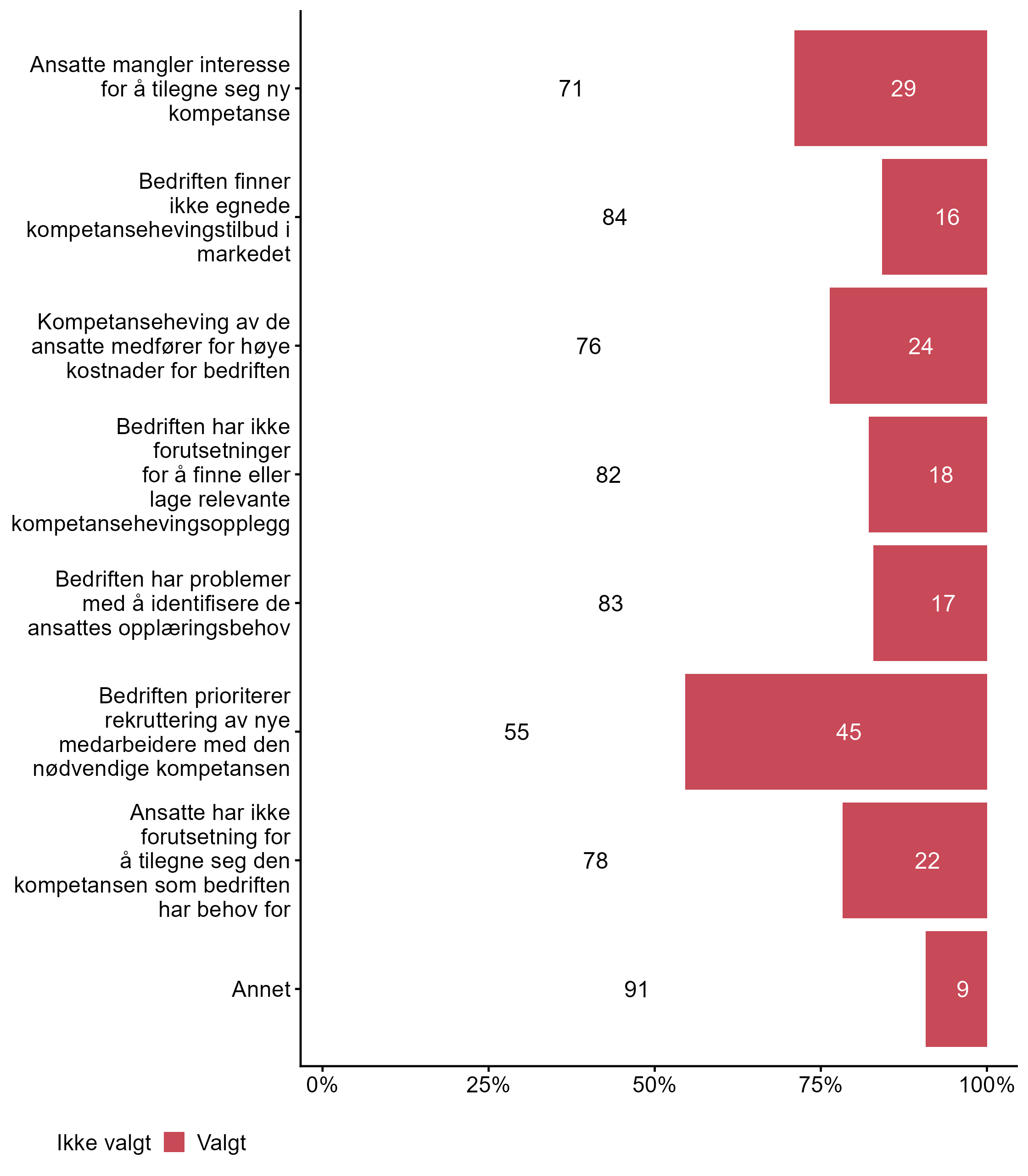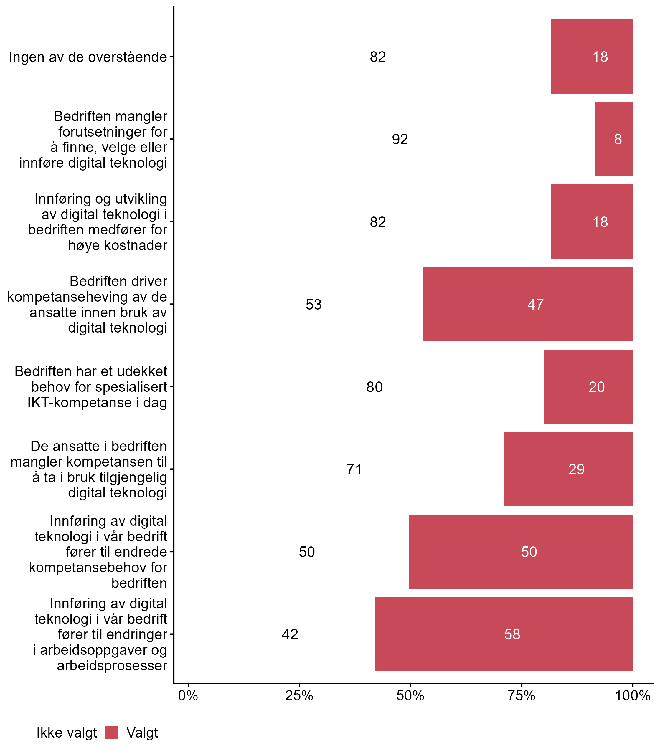 | .variable_label | Ikke valgt (%) | Valgt (%) | Totalt (N) |