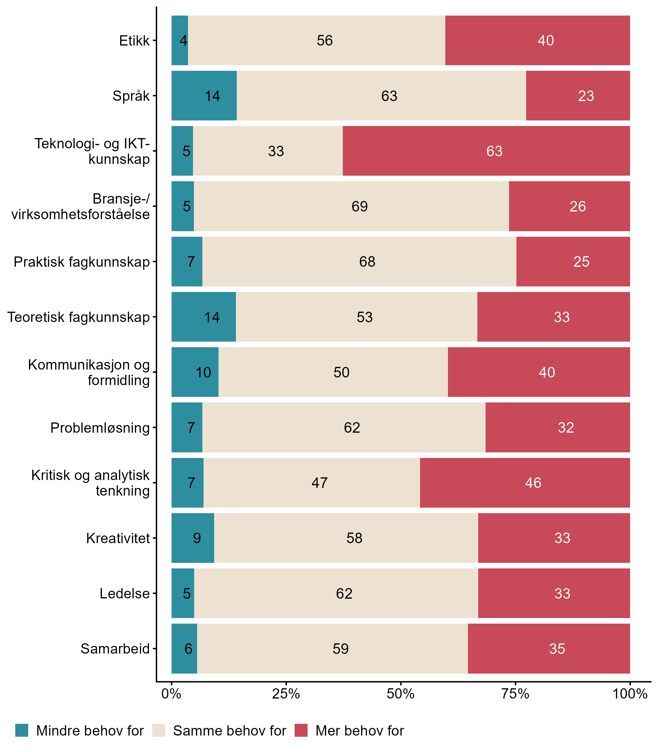 | Generativ kunstig intelligens (f.eks. produksjon av tekst, bilde, eller lignende) Spesialisert IKT-kompetanse | 72 | 28 | 53 |