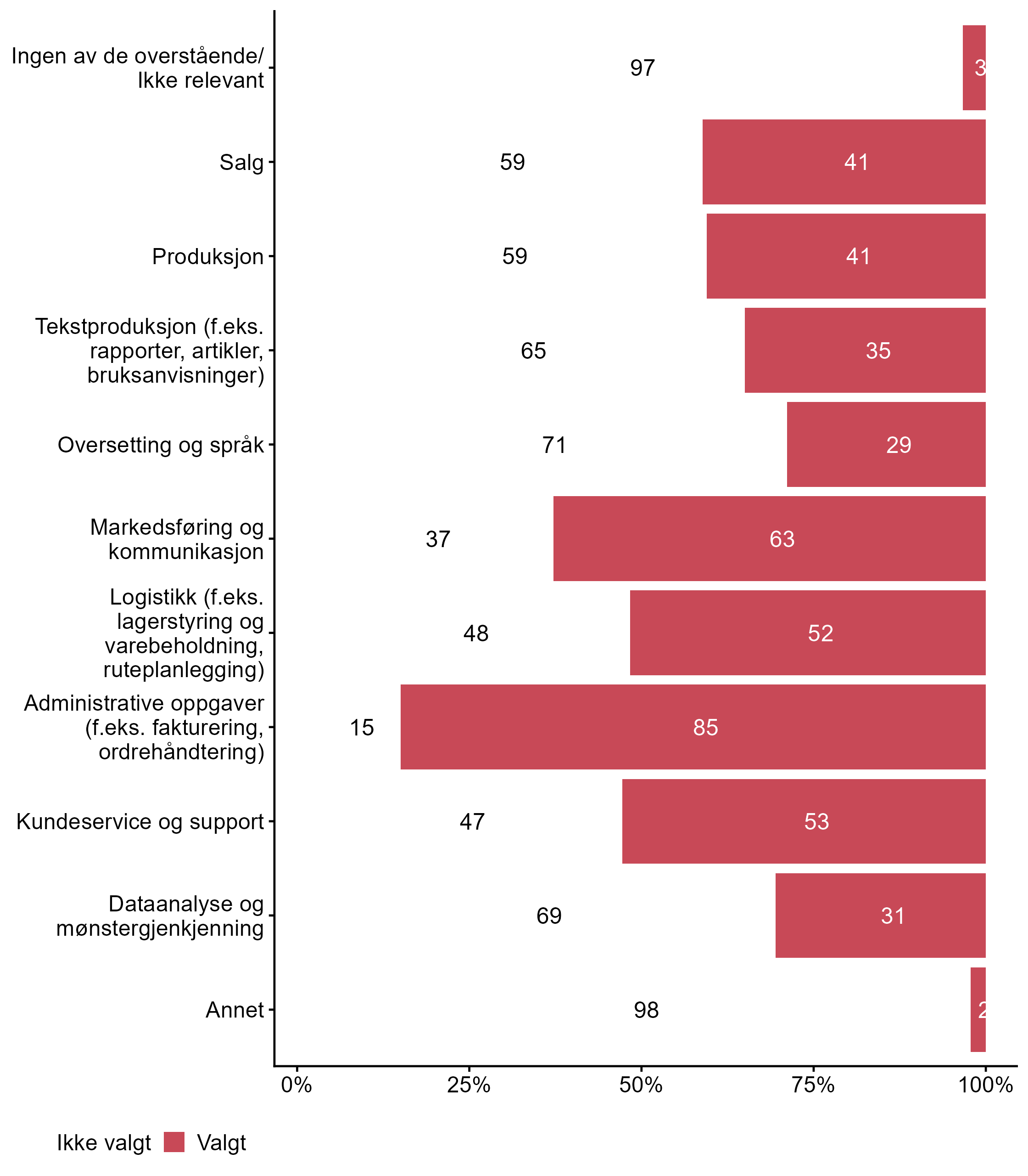 | Administrative oppgaver (f.eks. saksbehandlingssystemer, arkivering) Spesialisert IKT-kompetanse | 90 | 10 | 49 |