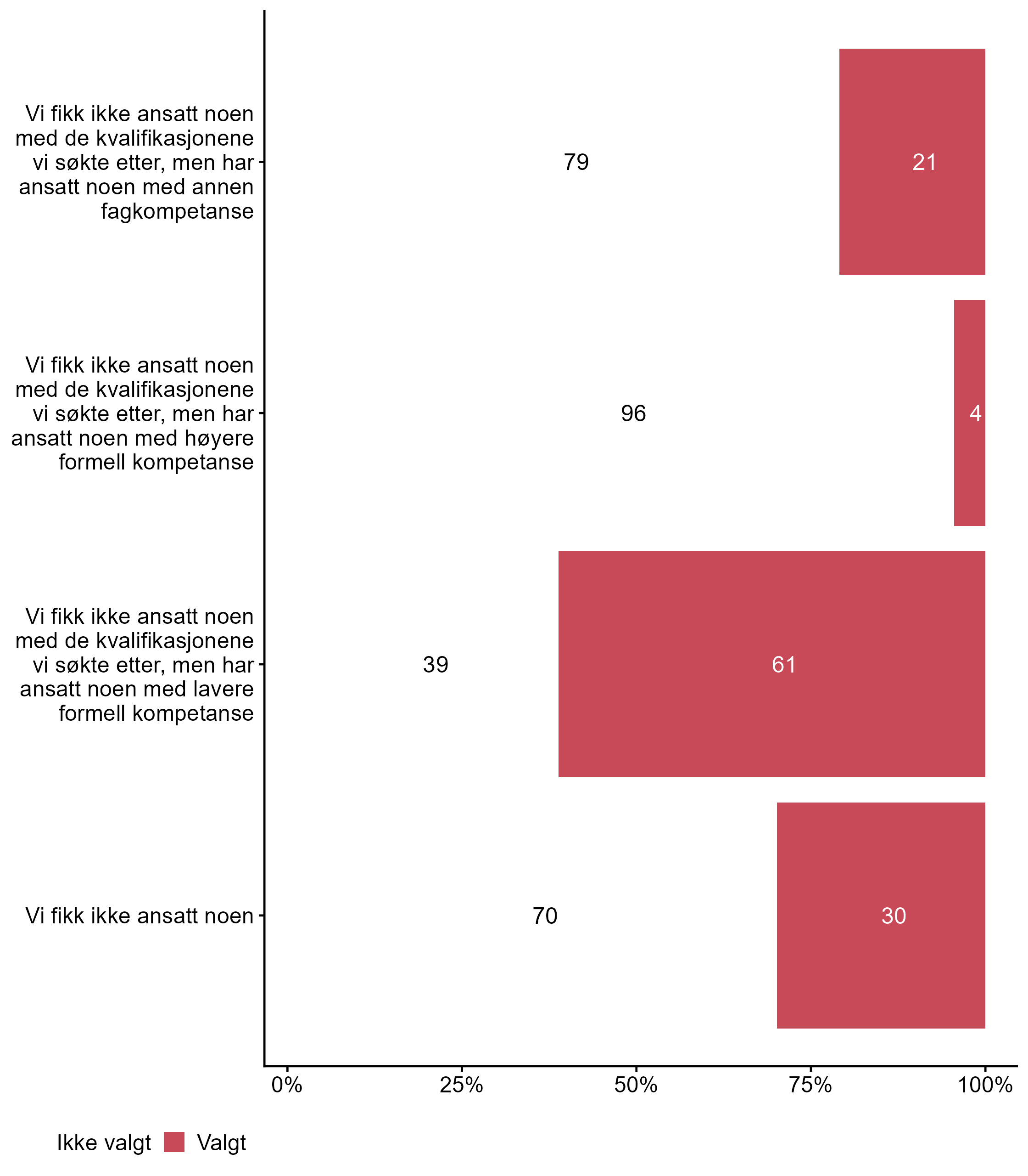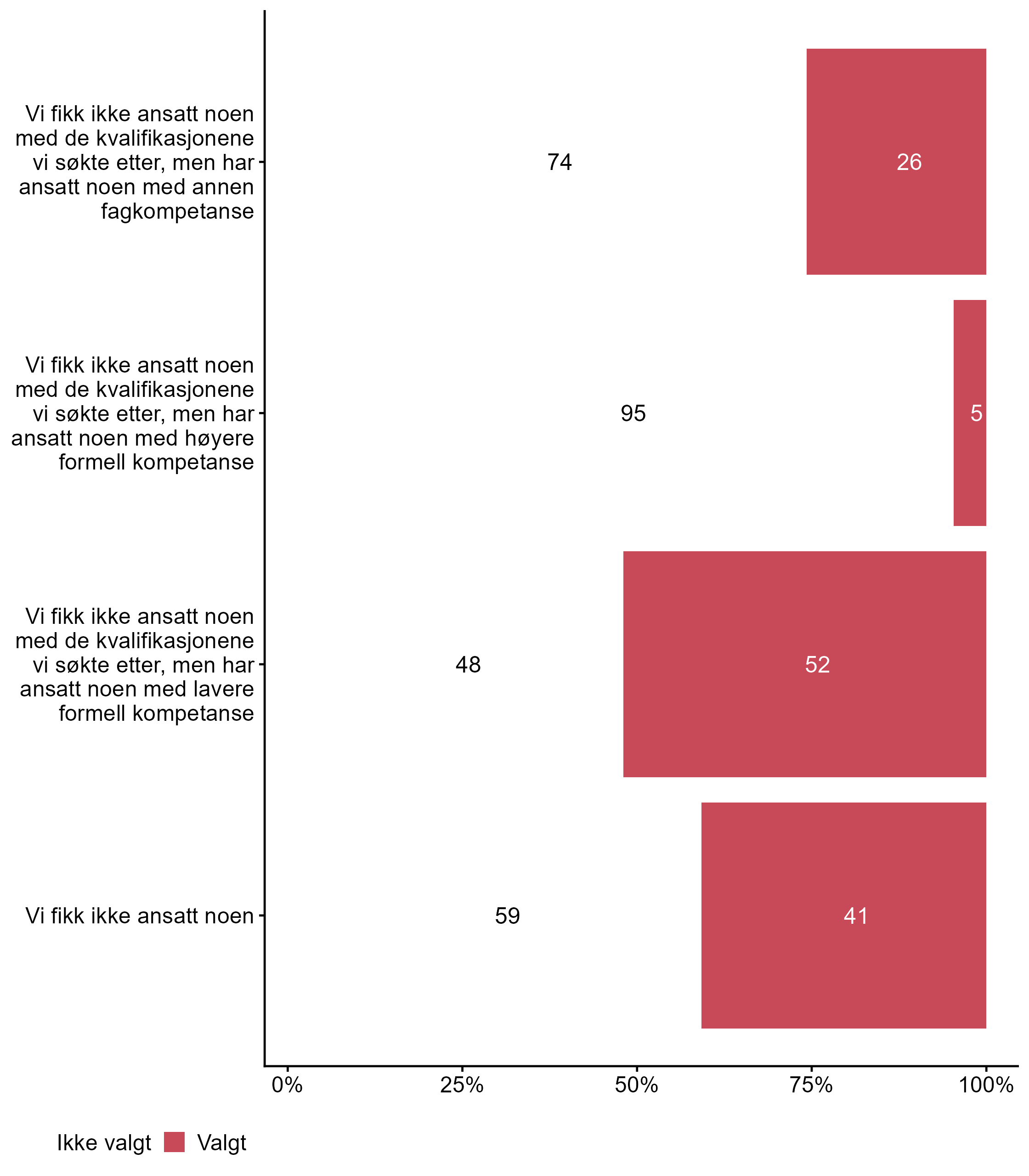 For påstanden Vi fikk ikke ansatt noen var det færre som svarte Valgt i målgruppen (0,3) enn blant andre (0,41).