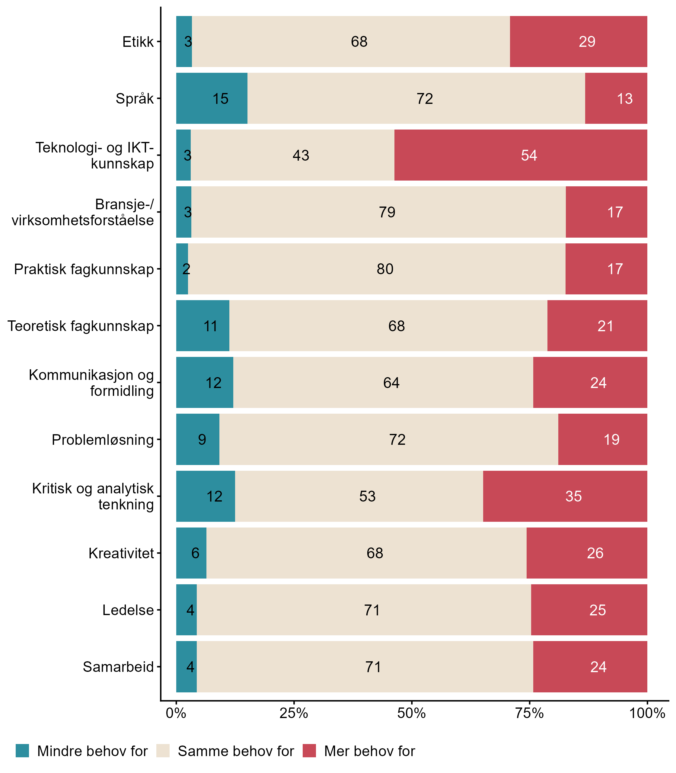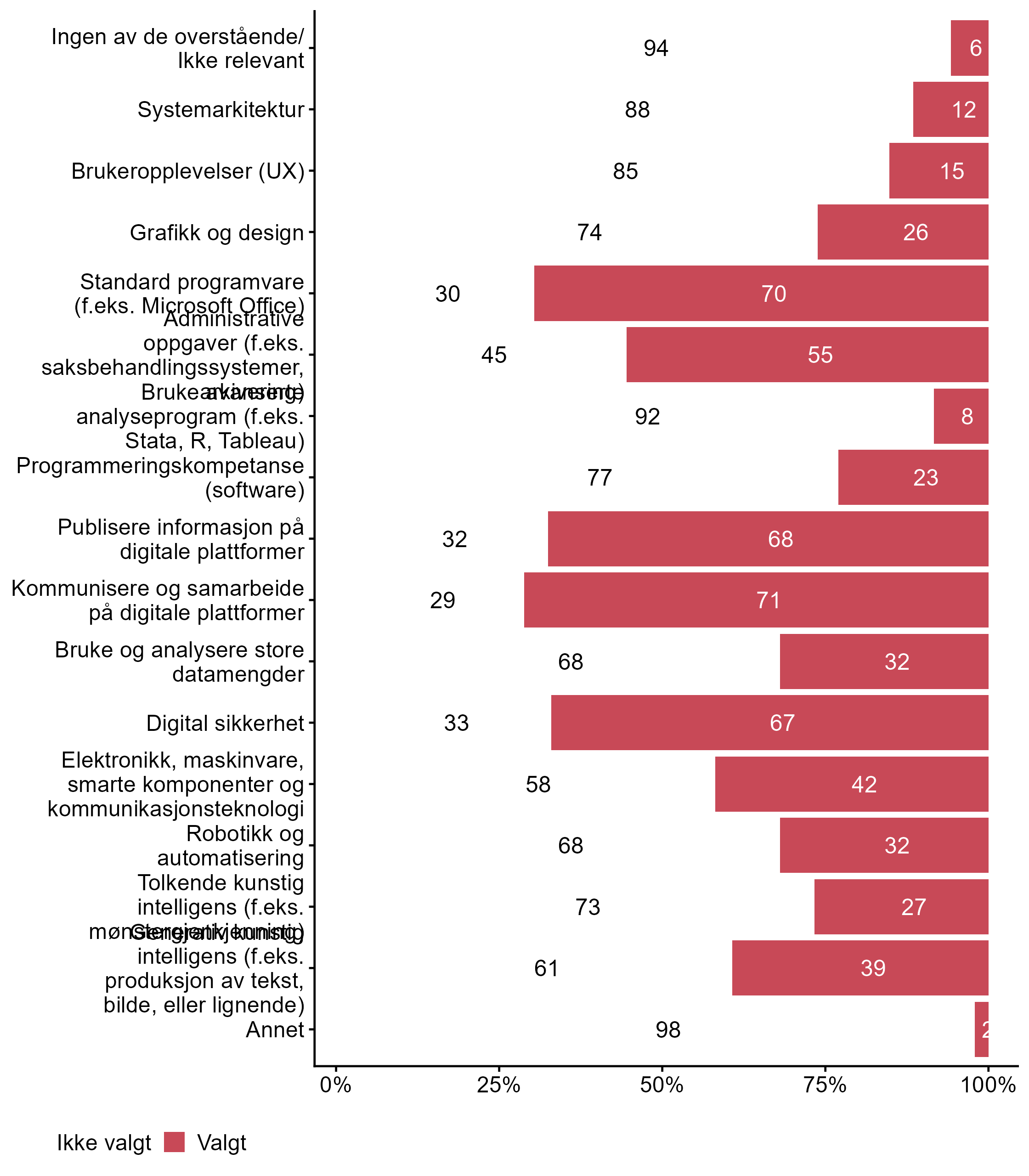 | Generativ kunstig intelligens (f.eks. produksjon av tekst, bilde, eller lignende) Spesialisert IKT-kompetanse | 75 | 25 | 52 |