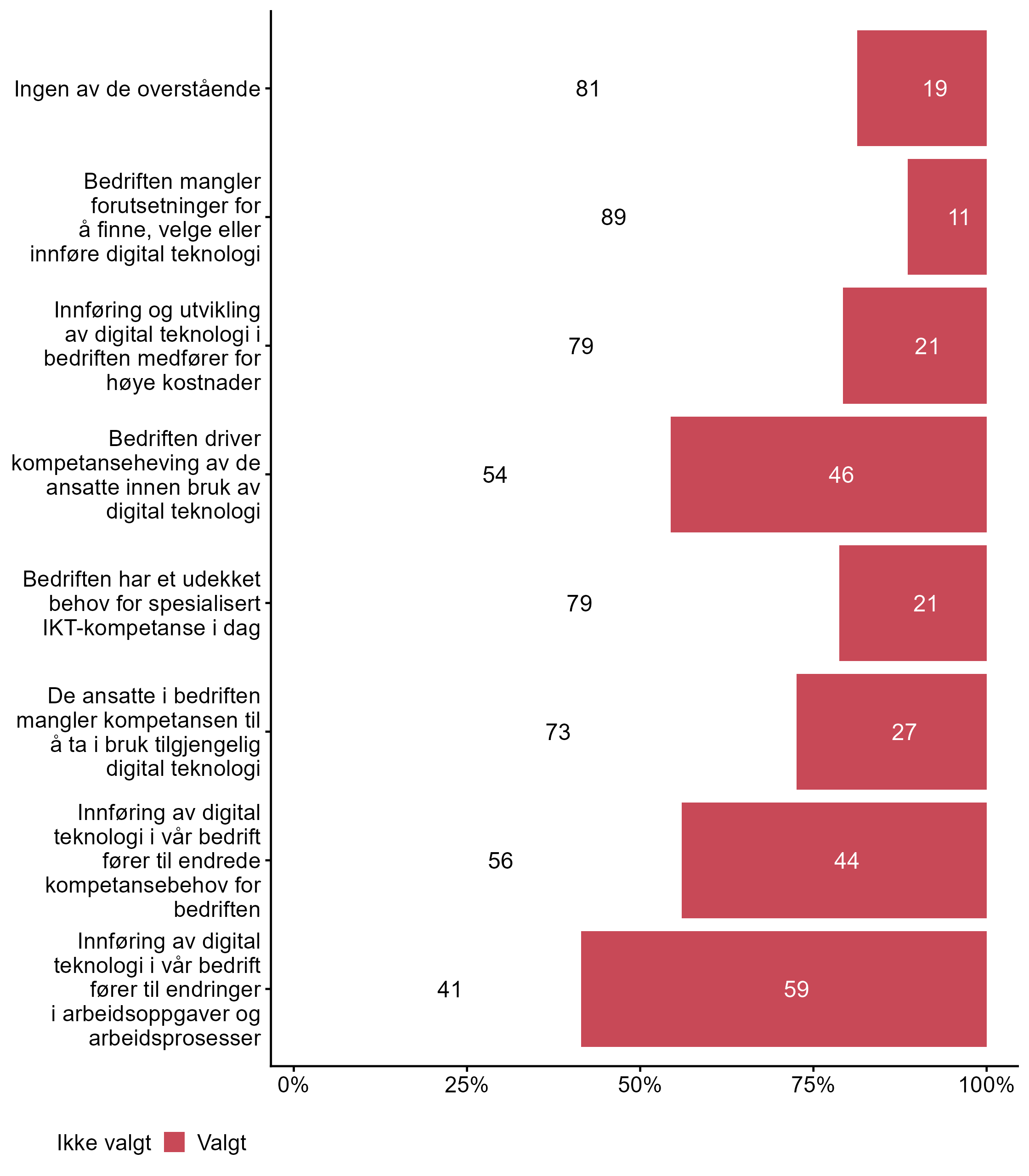 Bedriftene i undersøkelsen fikk spørsmål om IKT og digitalisering, hvilke eventuelle endringer det fører til i bedriften, relevante digitale teknologier, og hvordan digital teknologi påvirker kompetansebehovet for bedriften. I tillegg fikk respondentene en rekke påstander om kunstig intelligens og utfordringer bedriften har knyttet til kompetansebehov innen digital teknologi.