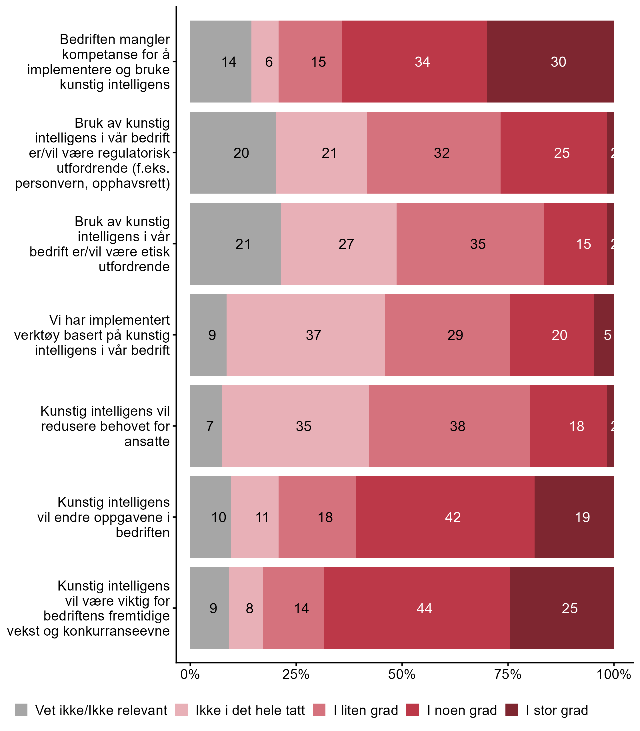 | Generativ kunstig intelligens (f.eks. produksjon av tekst, bilde, eller lignende) Generell IKT-kompetanse blant de ansatte | 16 | 84 | 696 |