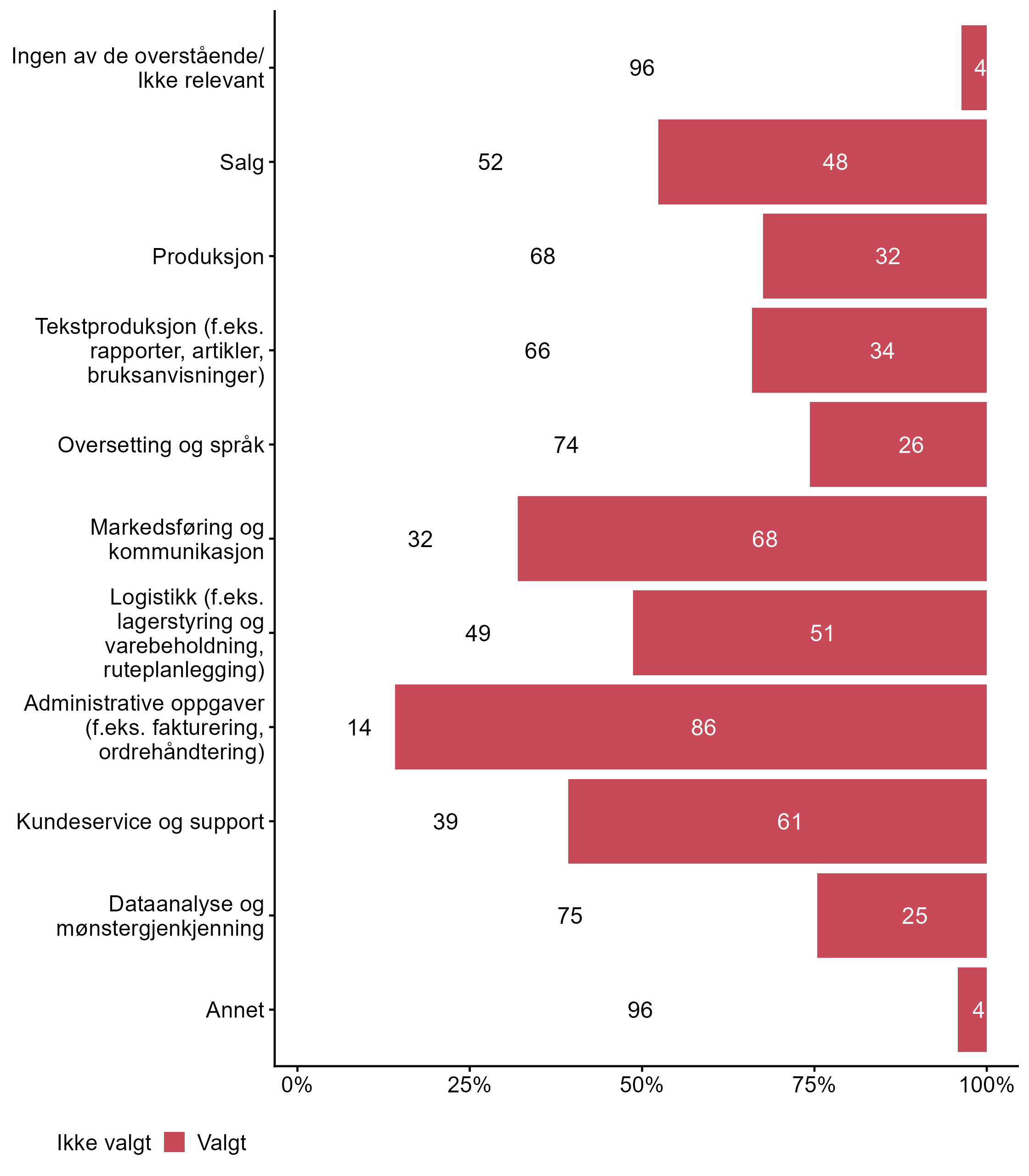| Tolkende kunstig intelligens (f.eks. mønstergjenkjenning) Generell IKT-kompetanse blant de ansatte | 31 | 69 | 366 |