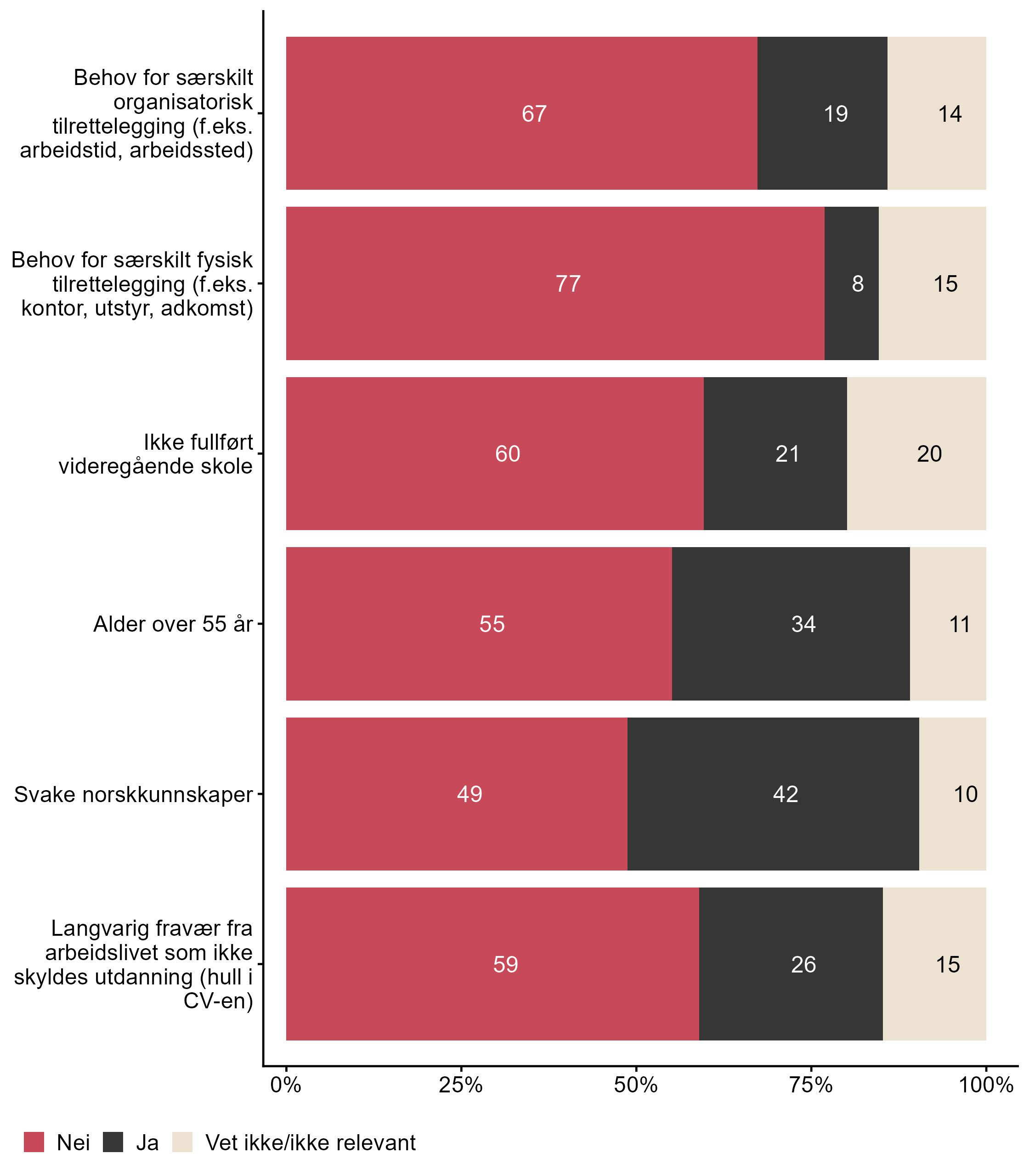 I dette kapittelet kan du sammenligne svar fra NHO Vestfold og Telemark med andre bedrifter som svarte på undersøkelsen, og tar for seg spørsmål som går på om bedriften har ansatt personer fra grupper som har svake norskkunnskaper, er 55 år eller eldre, har langvarig fravær fra arbeidslivet som ikke skyldes utdanning, ikke fullført videregående skole, har behov for særskilt organisatorisk eller fysisk tilrettelegging.