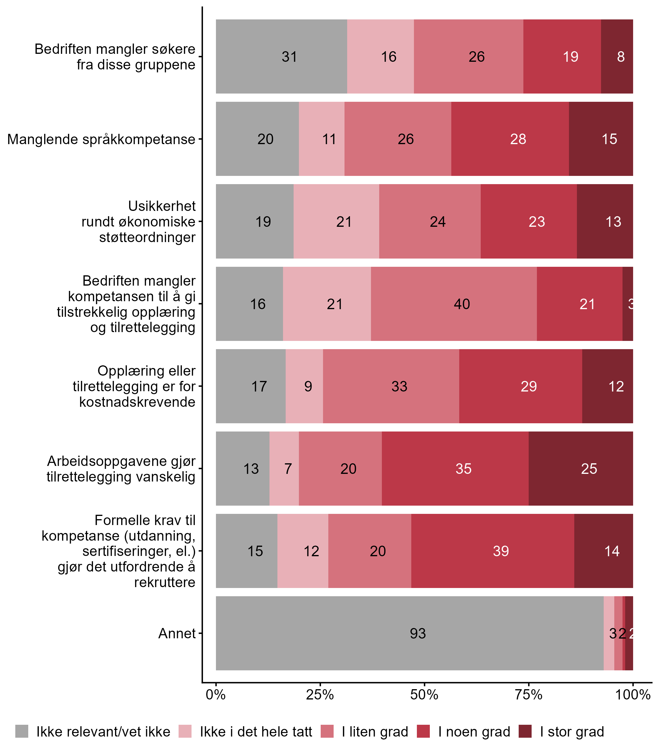 5.2 I hvilken grad opplever bedriften følgende barrierer når det gjelder å rekruttere personer fra disse gruppene?