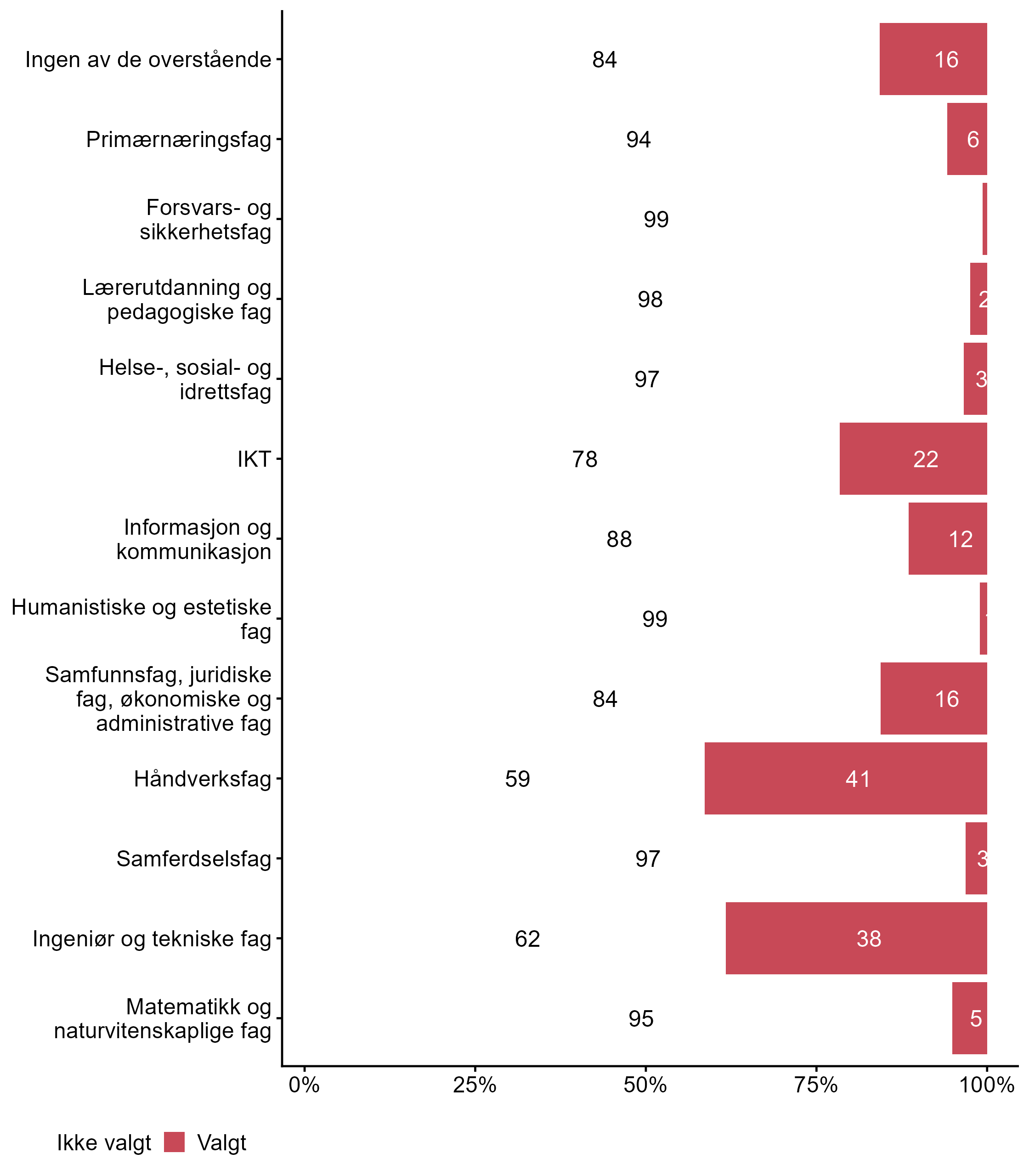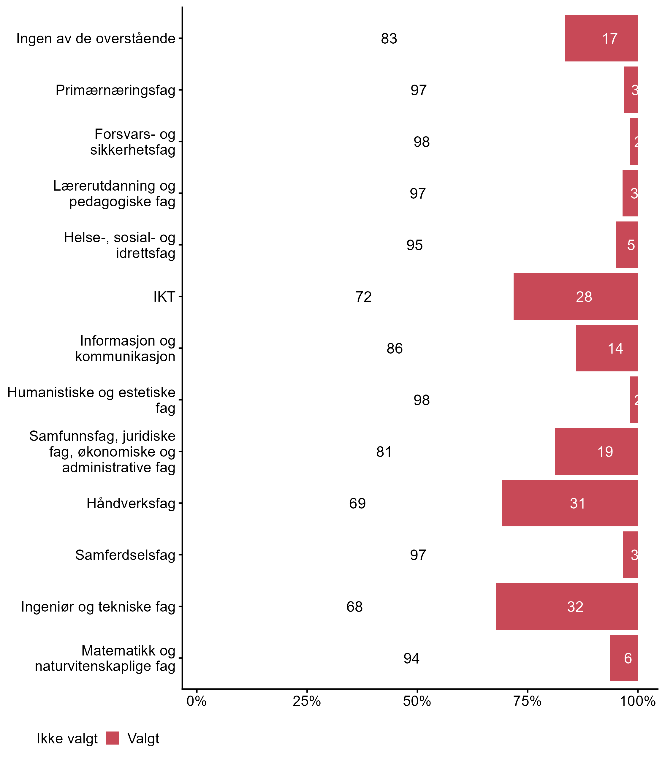 Færre respondenter svarte Valgt for Håndverksfag i målgruppen (0,31) enn i andre grupper (0,41).