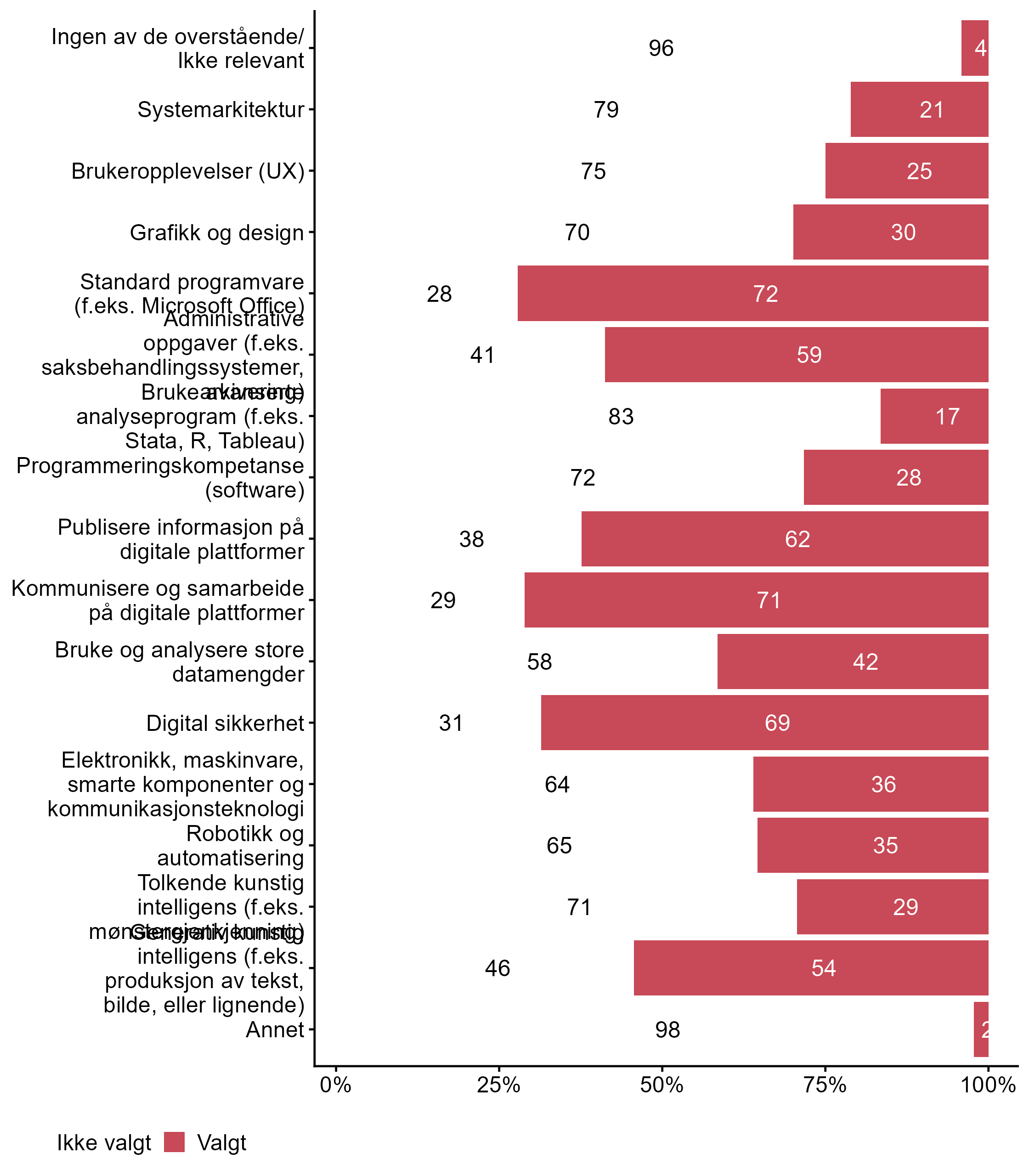 | Bruke avanserte analyseprogram (f.eks. Stata, R, Tableau) Spesialisert IKT-kompetanse | 29 | 71 | 58 |
