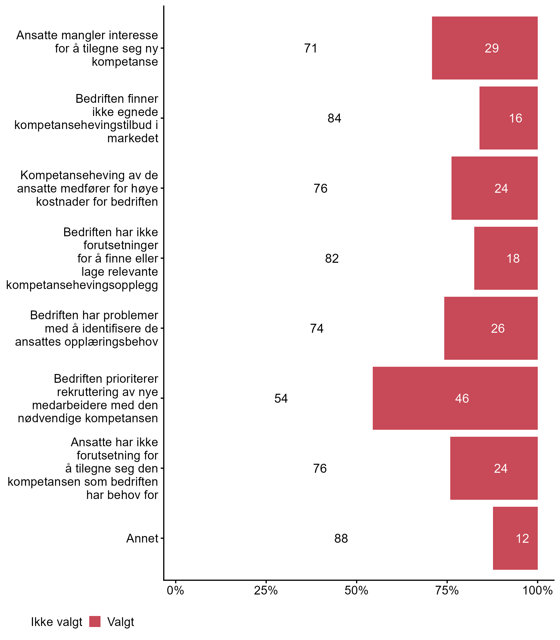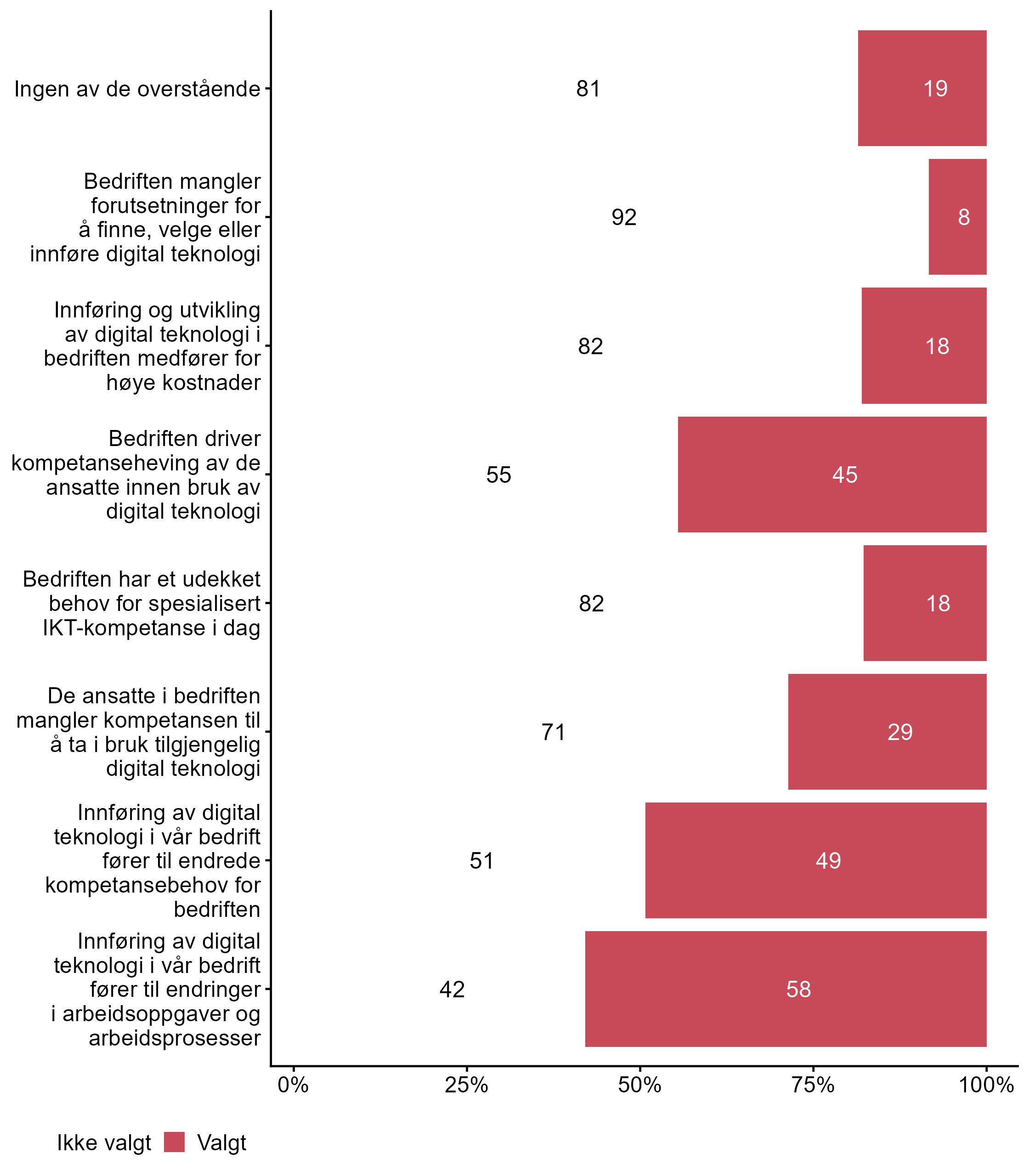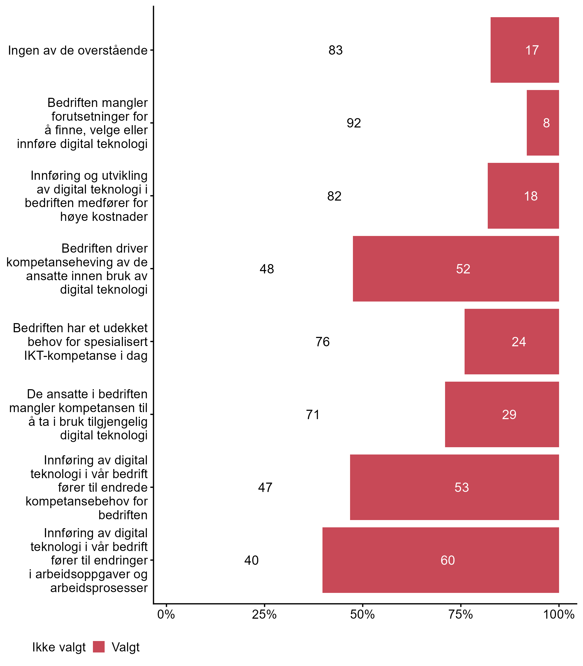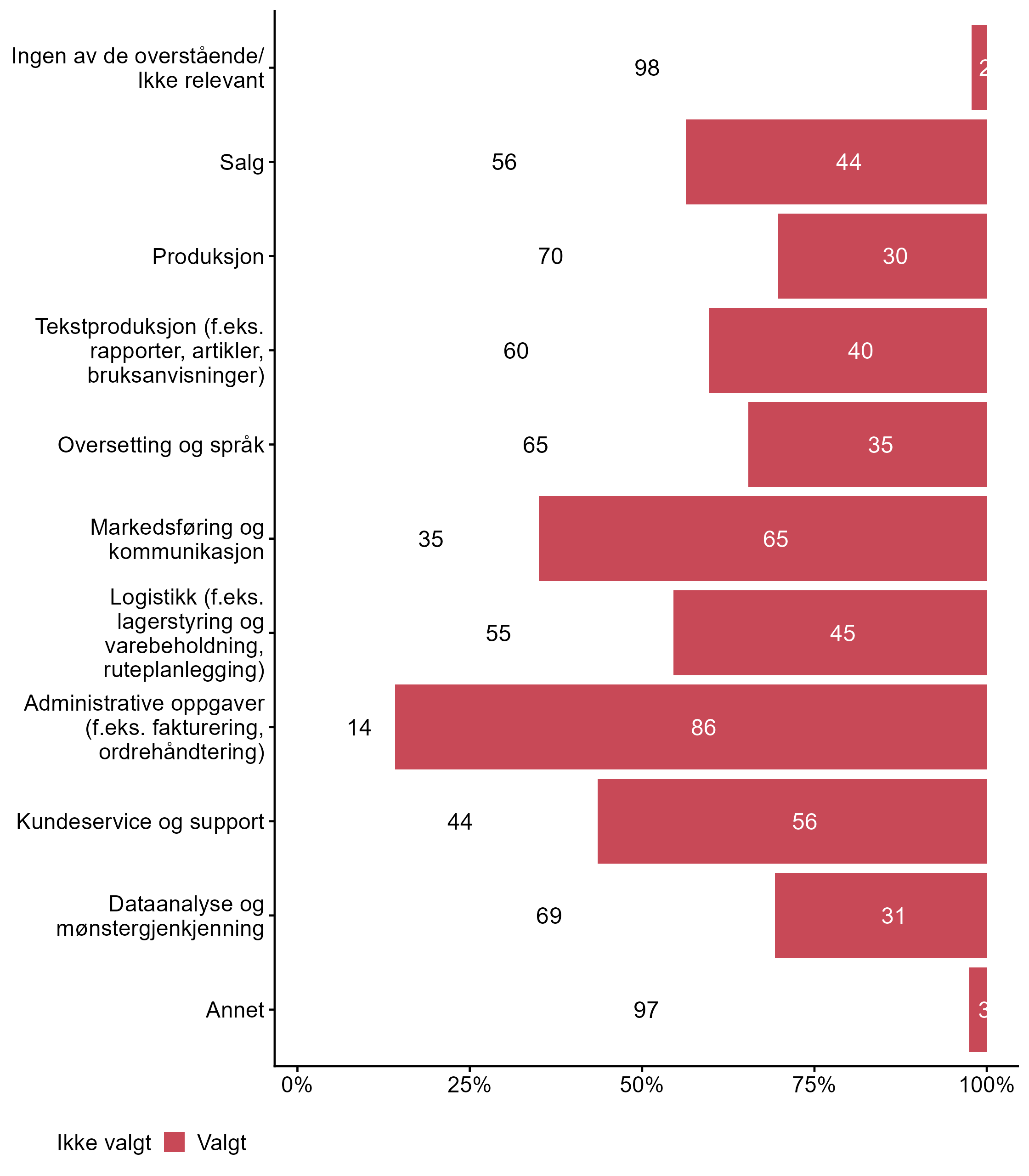 | .variable_label | Ikke valgt (%) | Valgt (%) | Totalt (N) |
