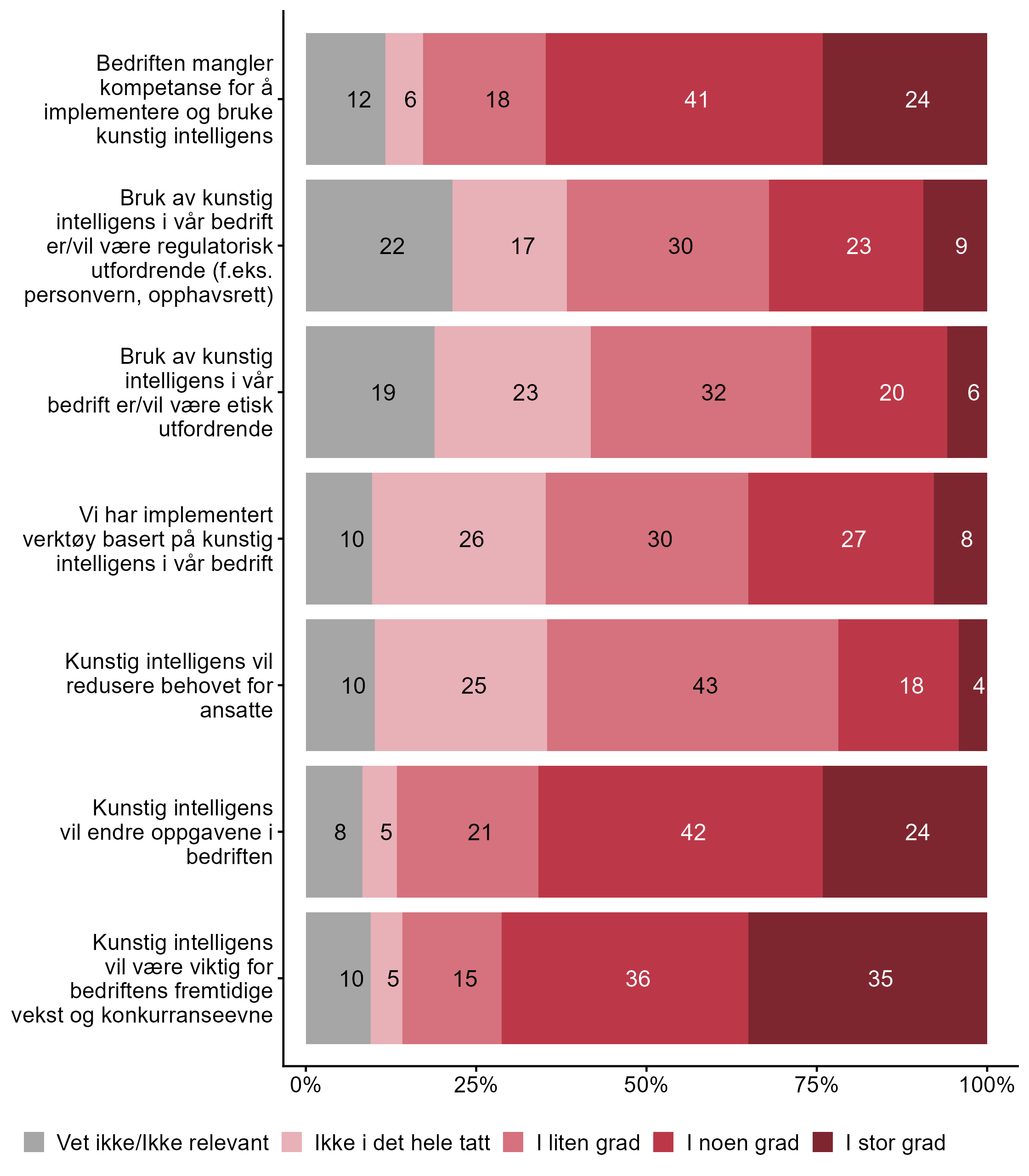 | Generativ kunstig intelligens (f.eks. produksjon av tekst, bilde, eller lignende) Generell IKT-kompetanse blant de ansatte | 17 | 83 | 277 |