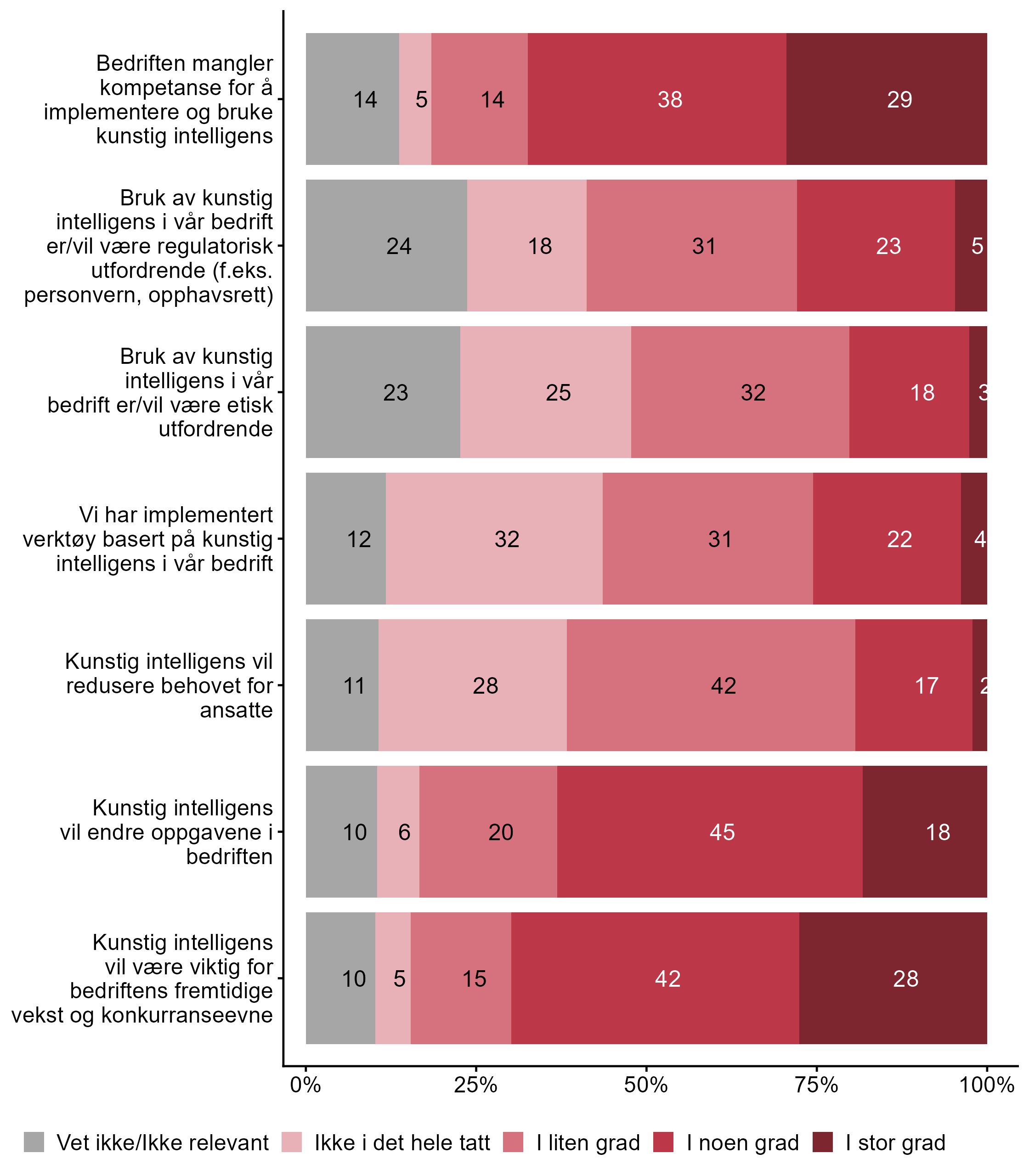 | Generativ kunstig intelligens (f.eks. produksjon av tekst, bilde, eller lignende) Generell IKT-kompetanse blant de ansatte | 14 | 86 | 471 |