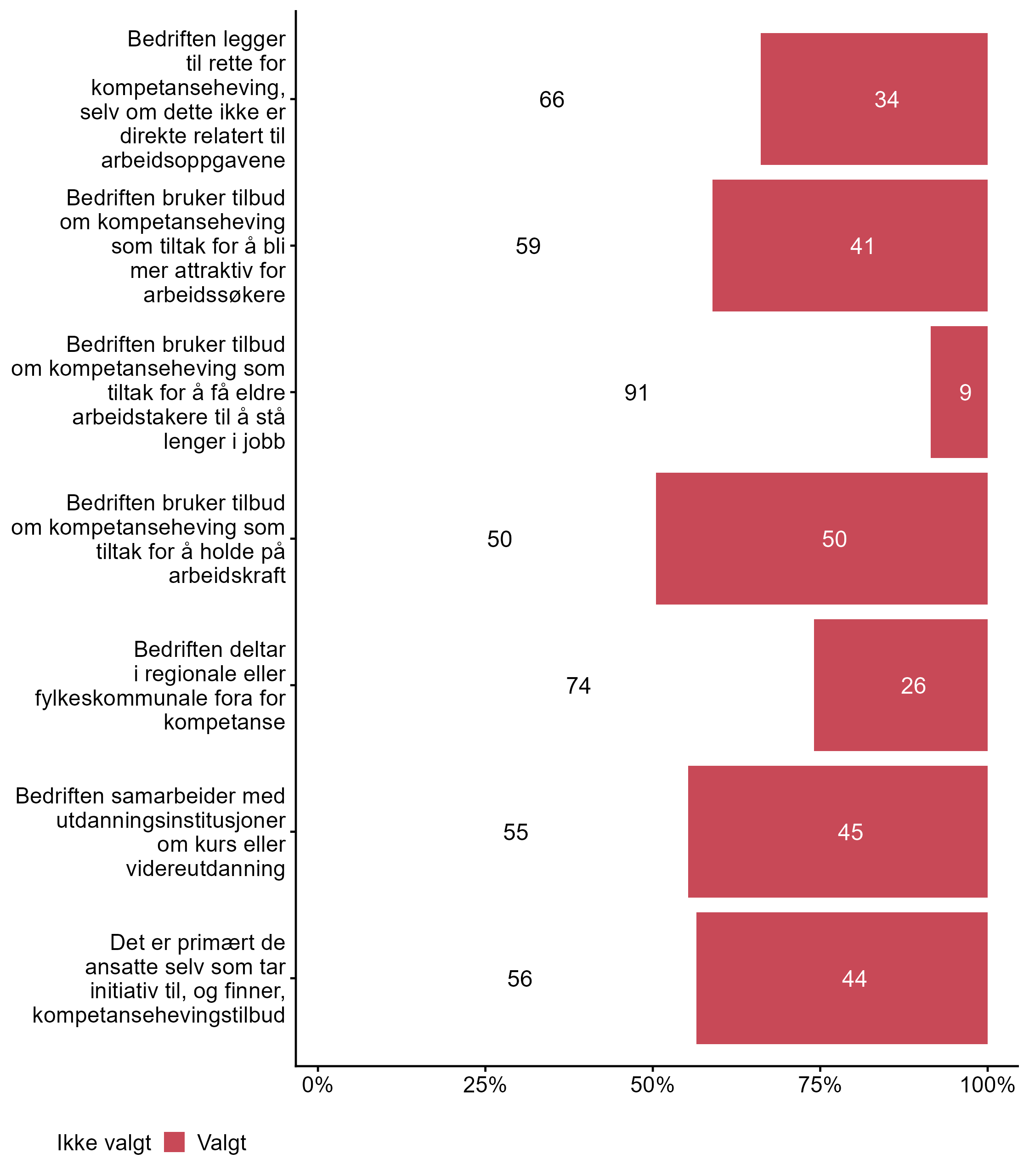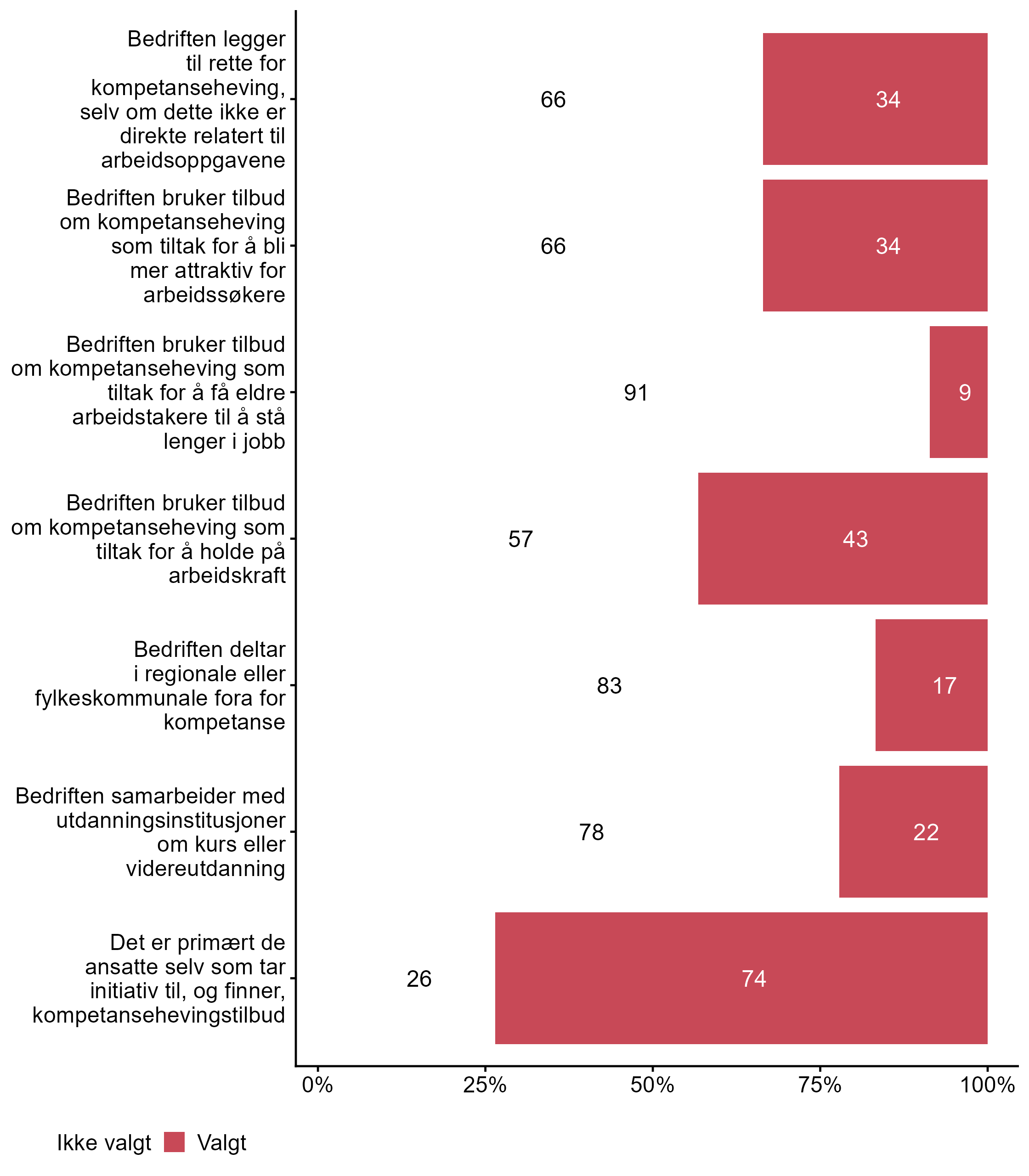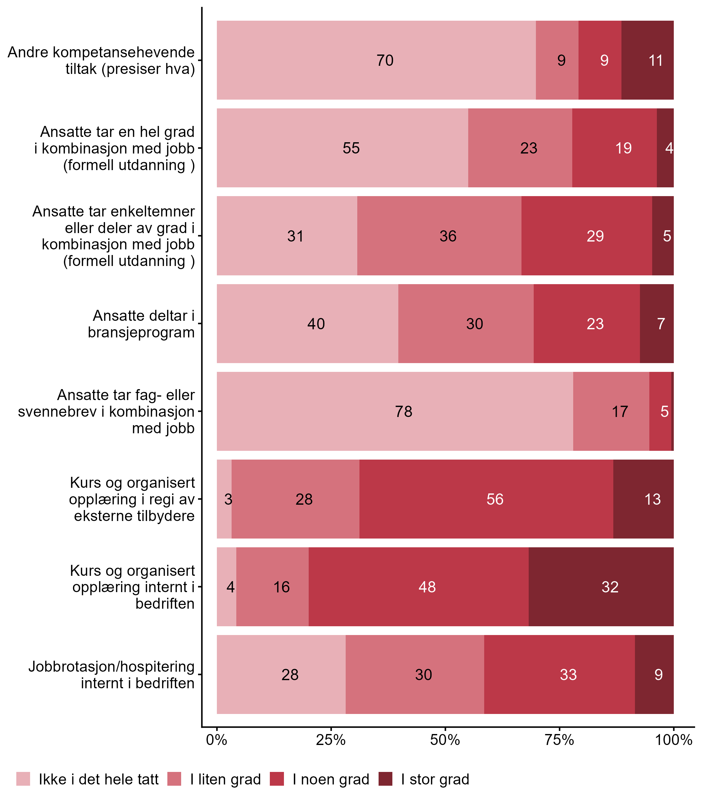 Vi stilte også spørsmål om hvilke tiltak bedriften har hatt for kompetanseutvikling det siste året, svarfordelingen vises i figur 2.
