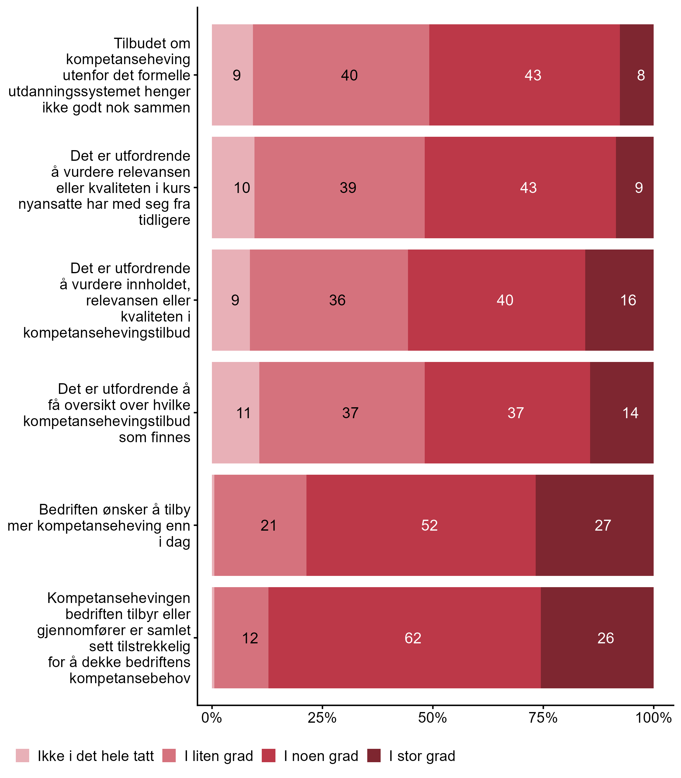 I figur 3 viser vi fordelingen av svar på en rekke påstander knyttet til utfordringer i etter- og videreutdanning.
