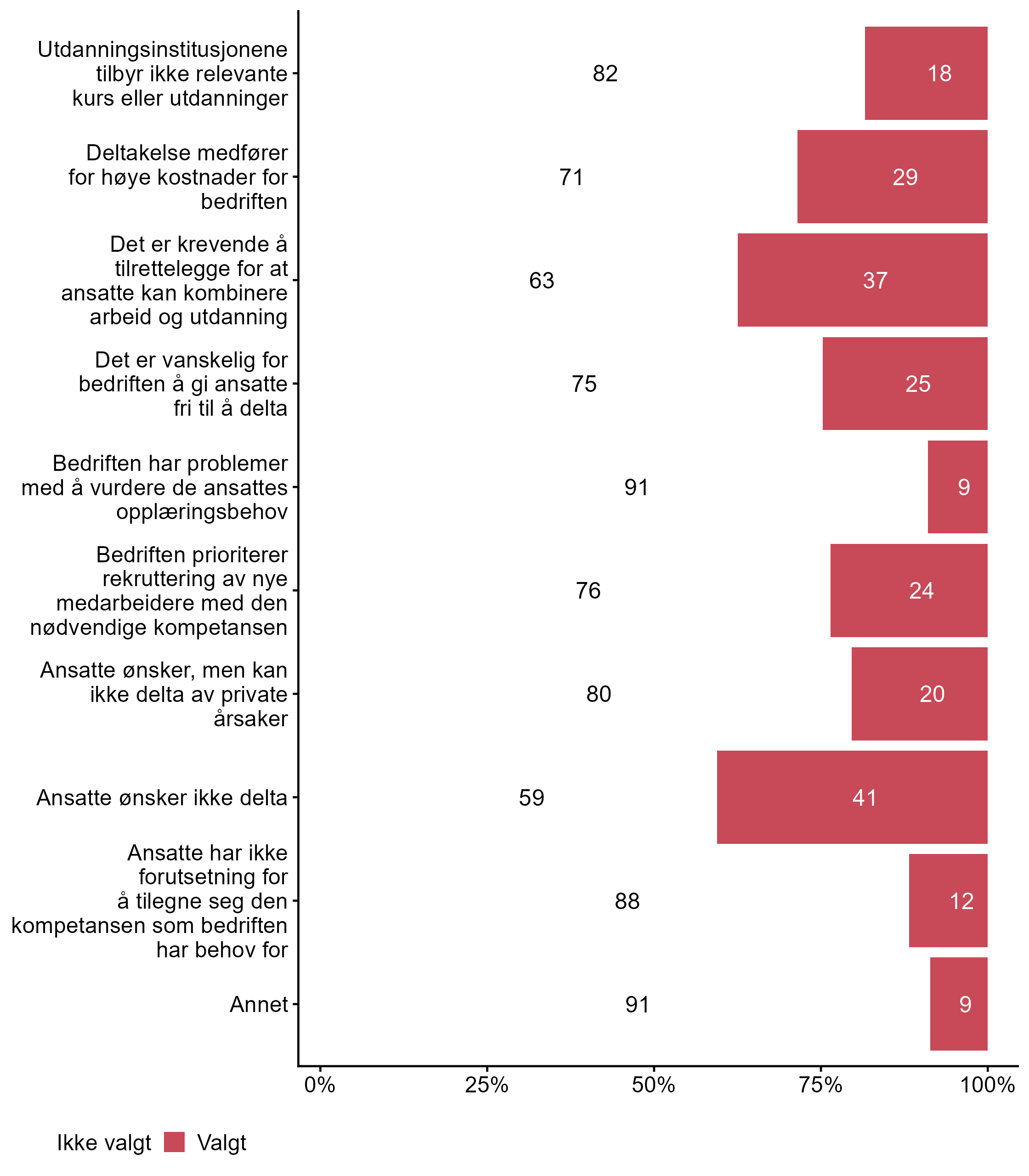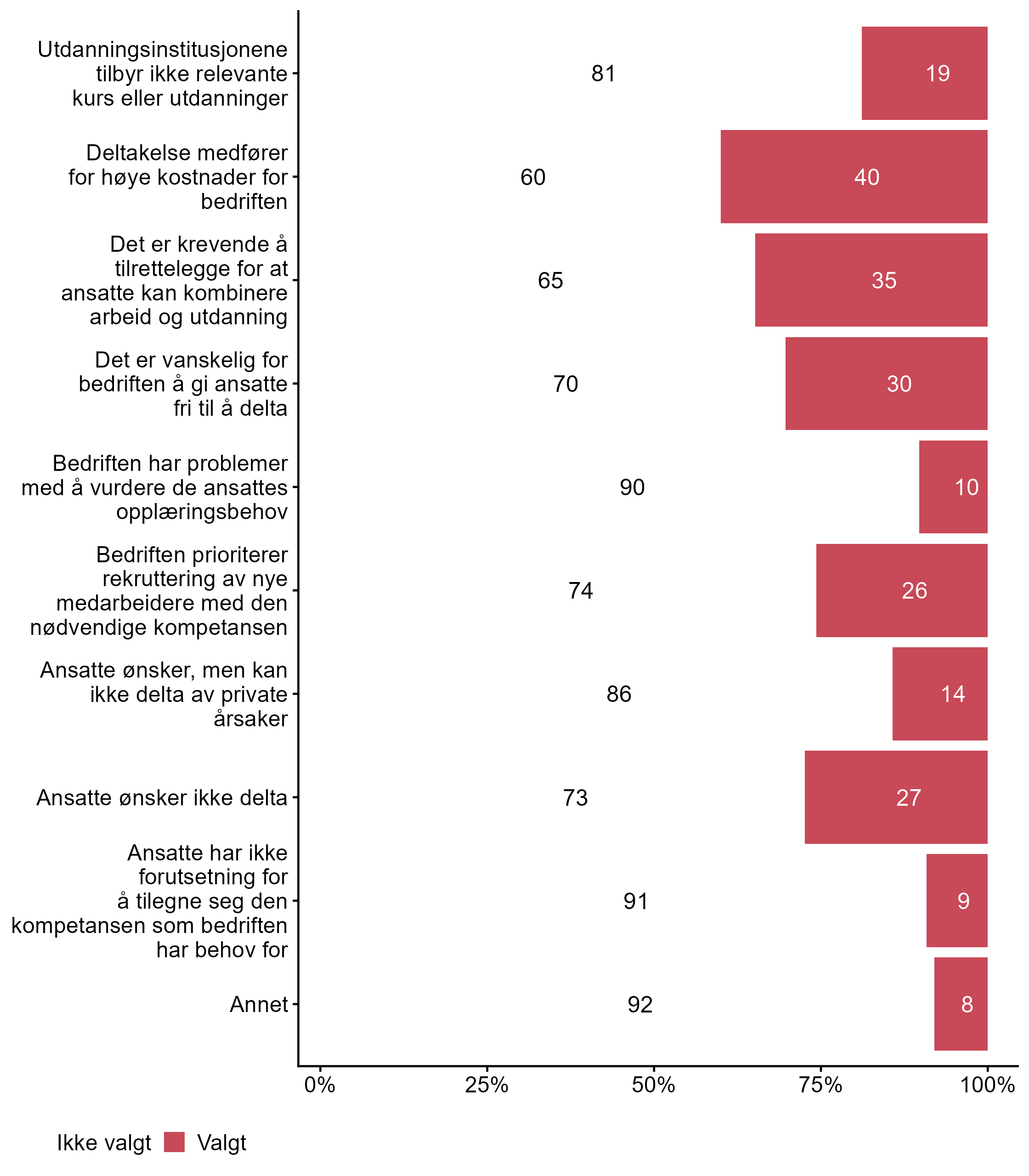 Vi ba bedriftene også krysse av for påstander som beskriver hvorfor ansatte i bedriften begrenser eller ikke deltar i etter- og videreutdanning, svarfordelingen vises i figur 5.