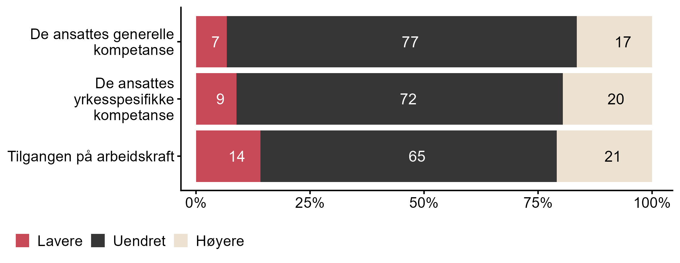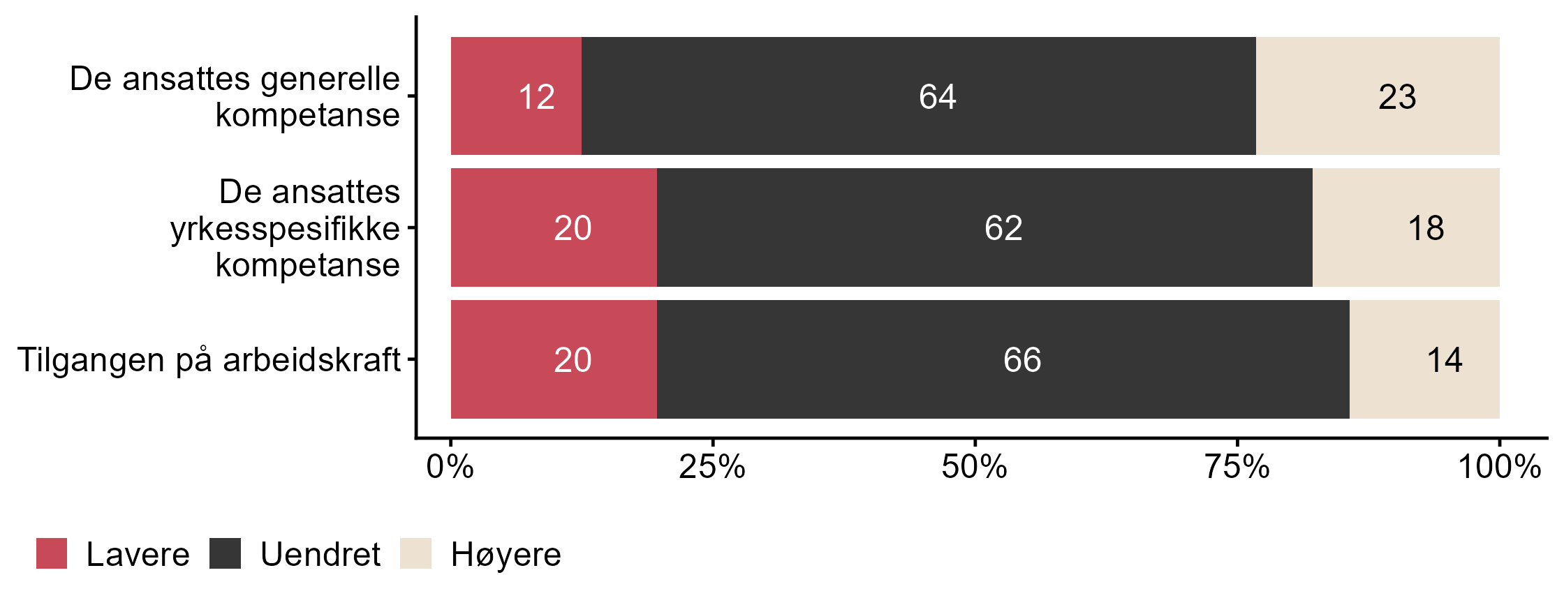 I dette kapittelet kan du sammenligne Fornybar Norge med andre bedrifters svar på spørsmål om endring i kompetansebehov. Dette inkluderer om det udekte kompetansebehovet har blitt høyere, lavere eller uendret de siste tolv månedene, og spørsmål om hvilke områder som i størst grad har påvirket kompetansebehovet til bedriften. Resultatene vises i figur 1 og figur 2