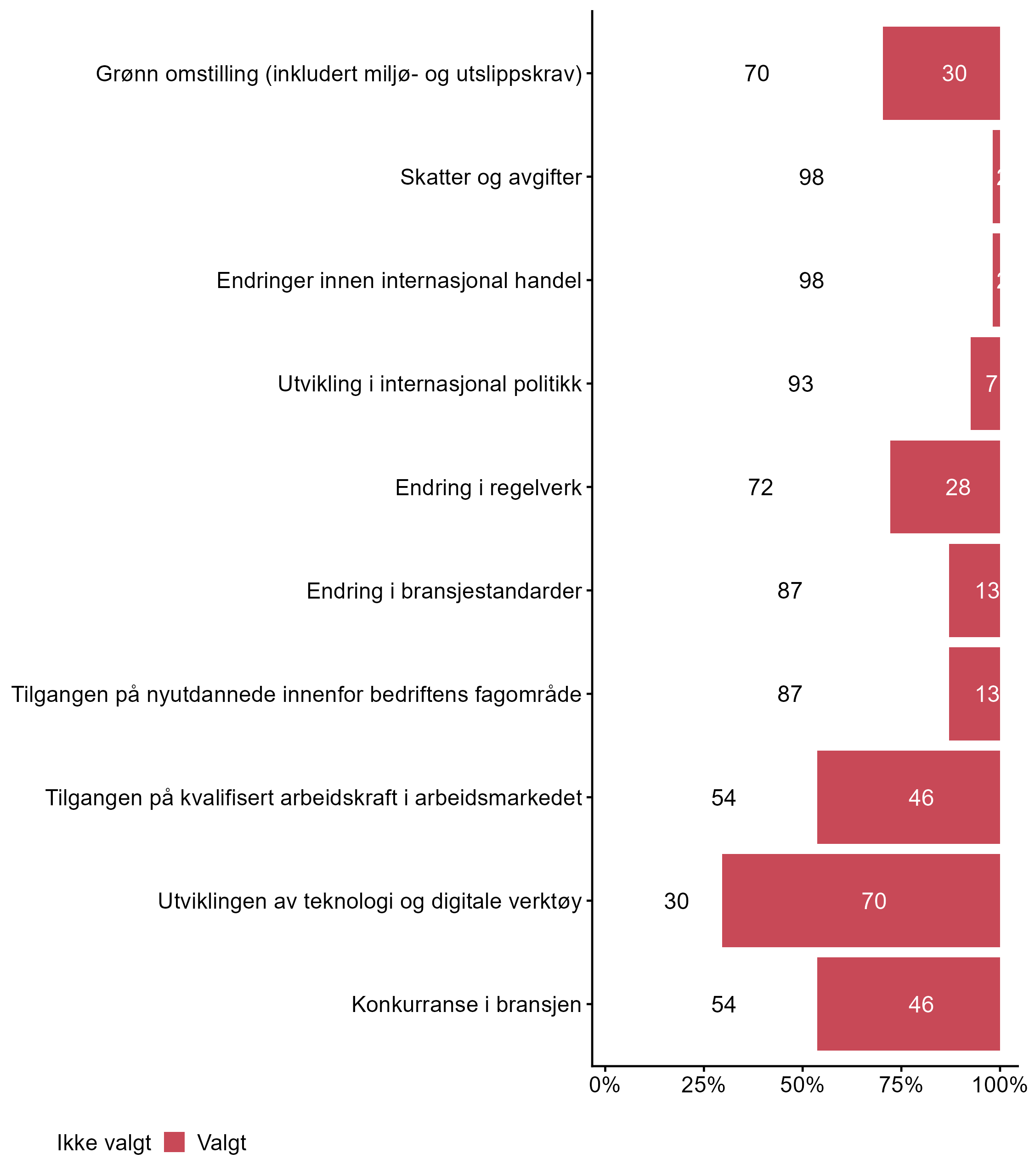 For påstanden _ Utviklingen av teknologi og digitale verktøy_ var det flere som svarte Valgt i målgruppen (0,7) enn blant andre (0,42). Færre respondenter svarte Valgt for _ Tilgangen på kvalifisert arbeidskraft i arbeidsmarkedet_ i målgruppen (0,46) enn i andre grupper (0,6). For påstanden _ Tilgangen på nyutdannede innenfor bedriftens fagområde_ var det færre som svarte Valgt i målgruppen (0,13) enn blant andre (0,24). For påstanden _ Grønn omstilling (inkludert miljø- og utslippskrav)_ var det flere som svarte Valgt i målgruppen (0,3) enn blant andre (0,14).
