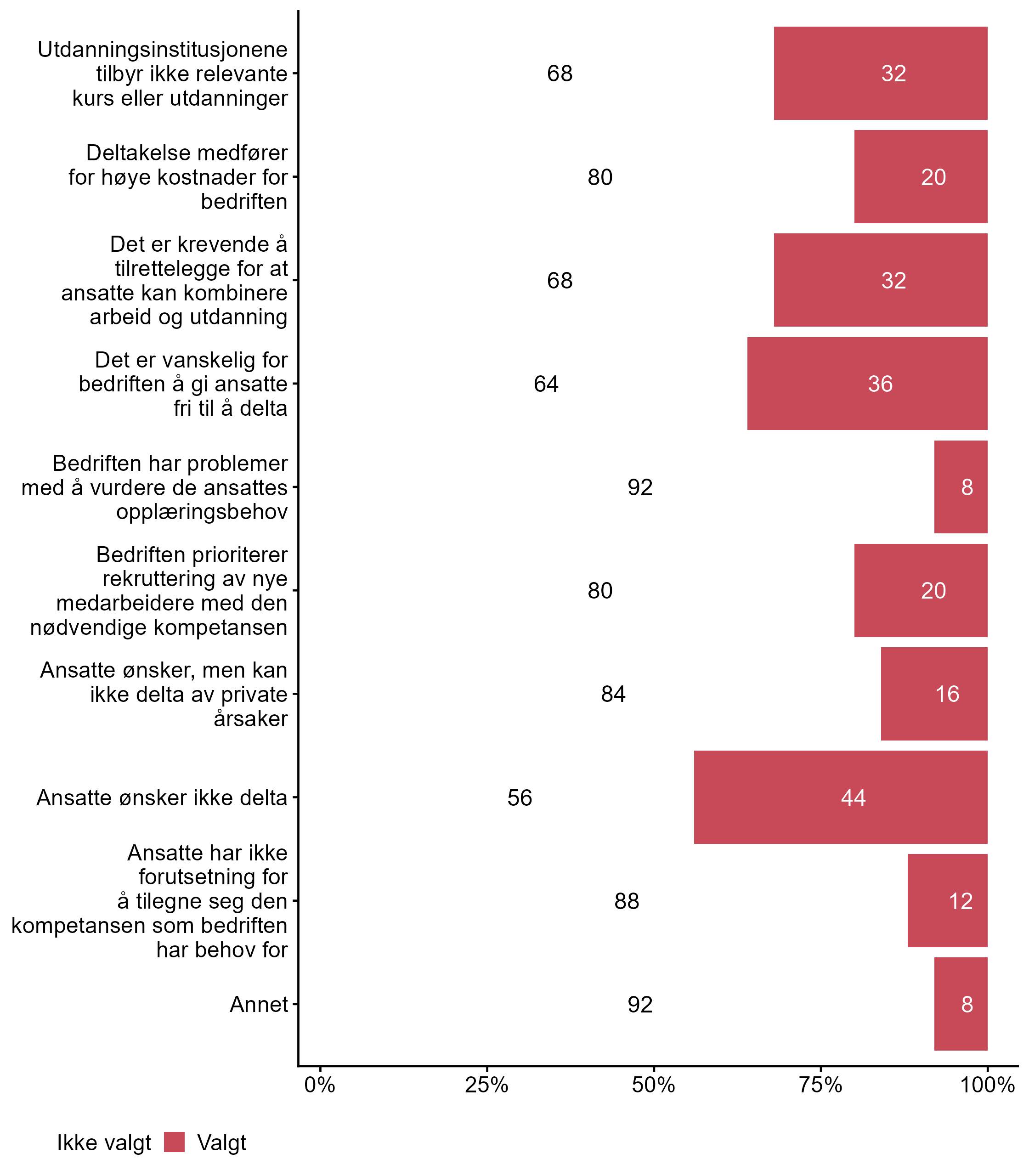 Vi ba bedriftene også krysse av for påstander som beskriver hvorfor ansatte i bedriften begrenser eller ikke deltar i etter- og videreutdanning, svarfordelingen vises i figur 5.