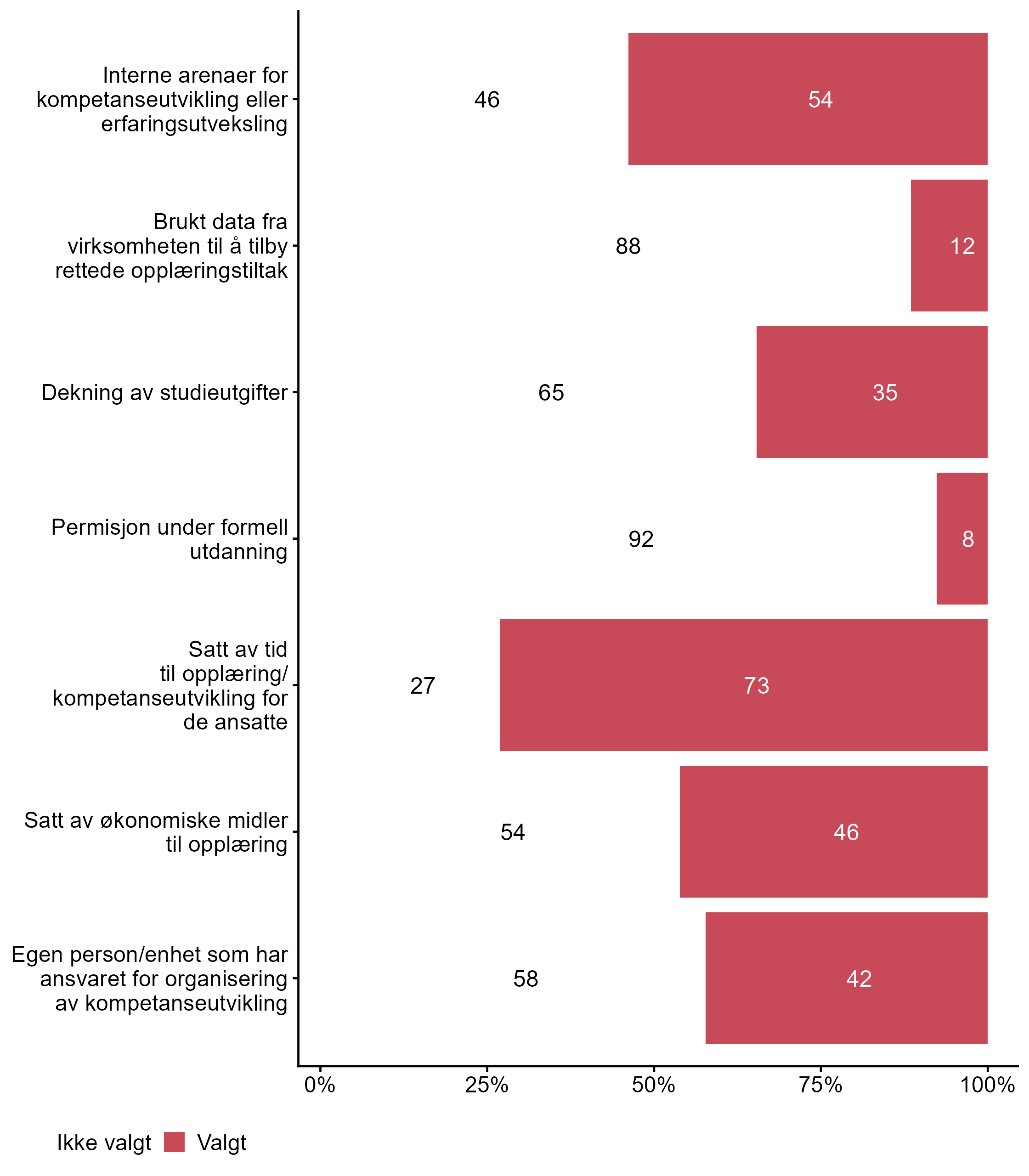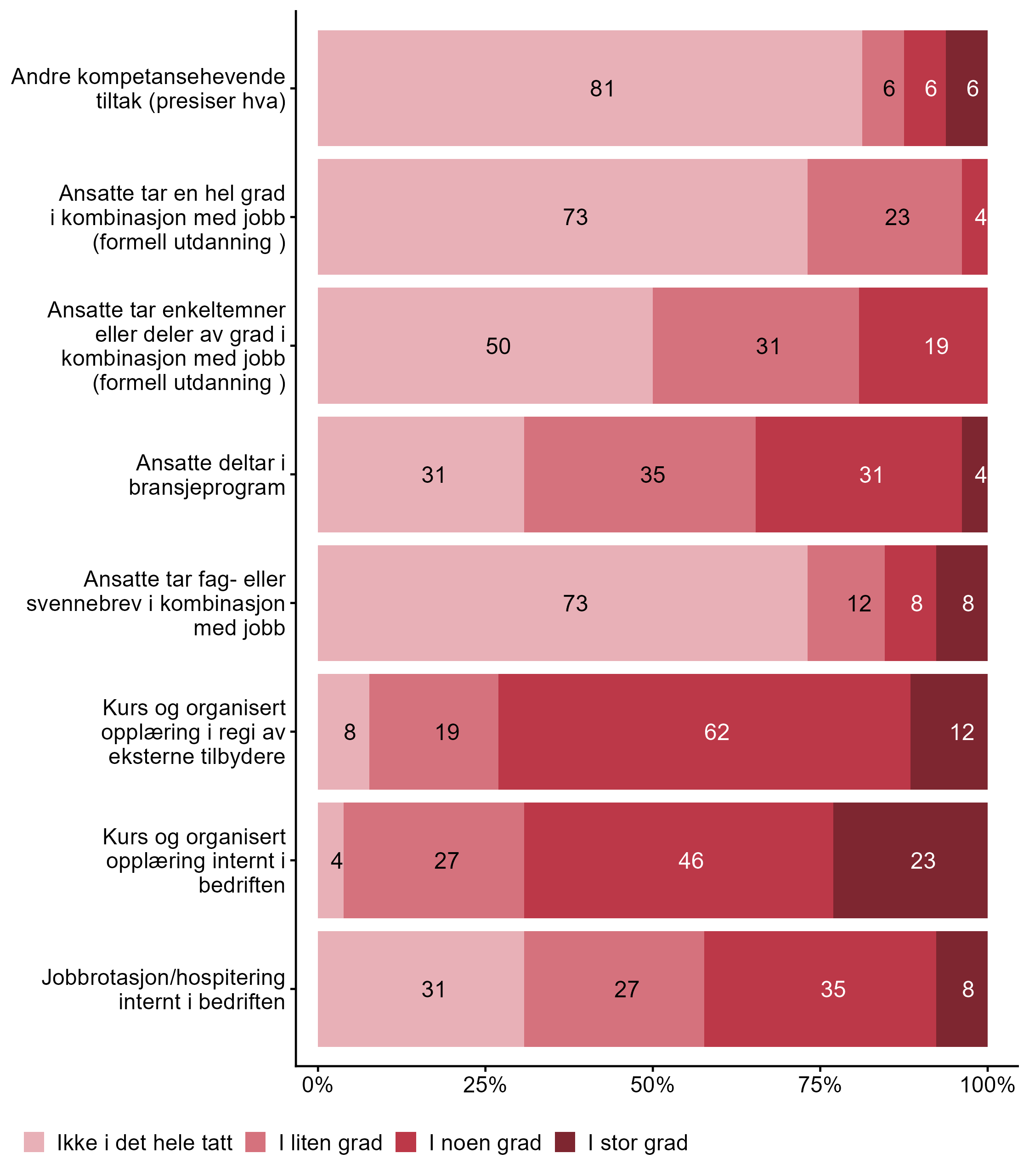 Vi stilte også spørsmål om hvilke tiltak bedriften har hatt for kompetanseutvikling det siste året, svarfordelingen vises i figur 2.