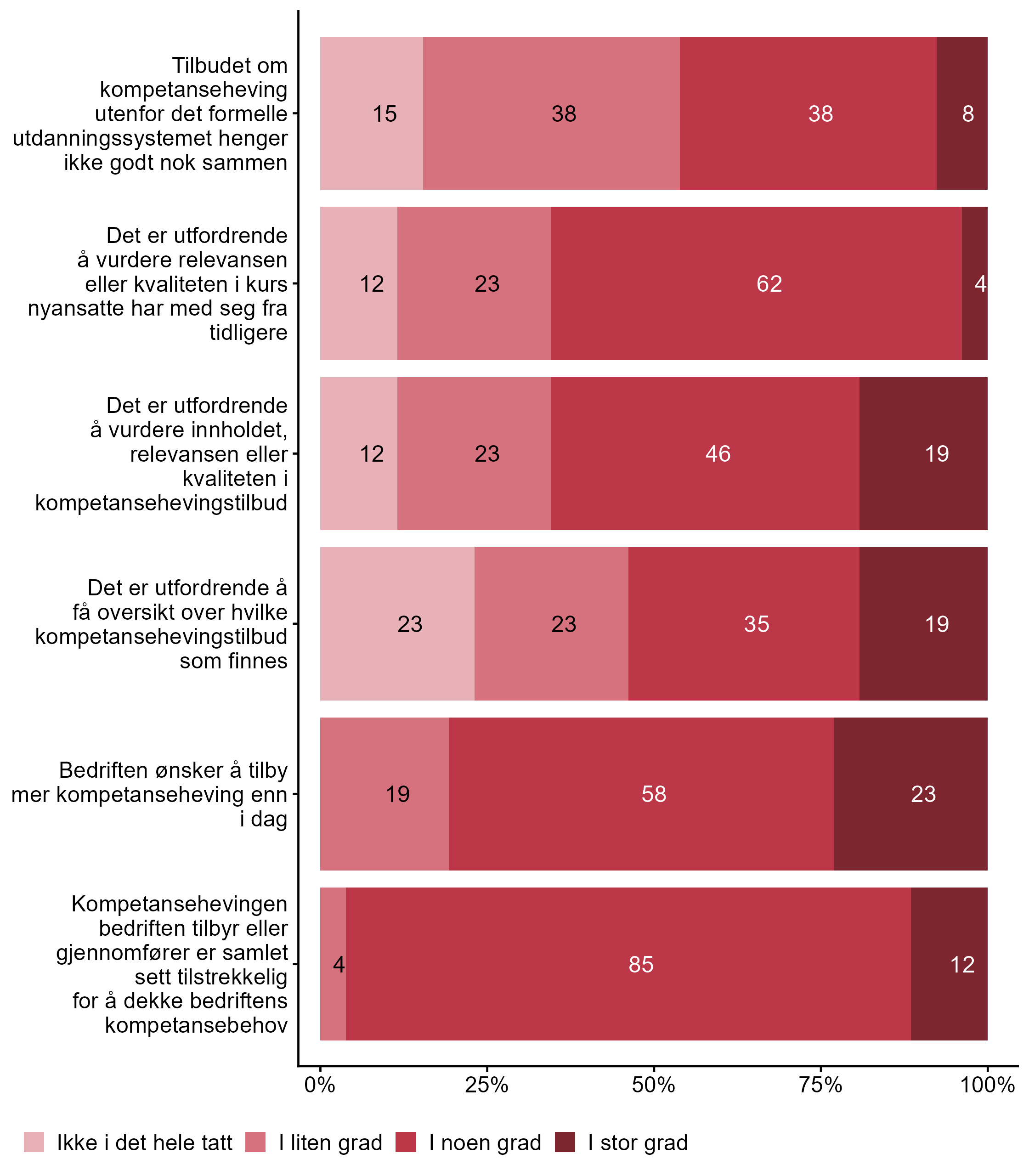 I figur 3 viser vi fordelingen av svar på en rekke påstander knyttet til utfordringer i etter- og videreutdanning.