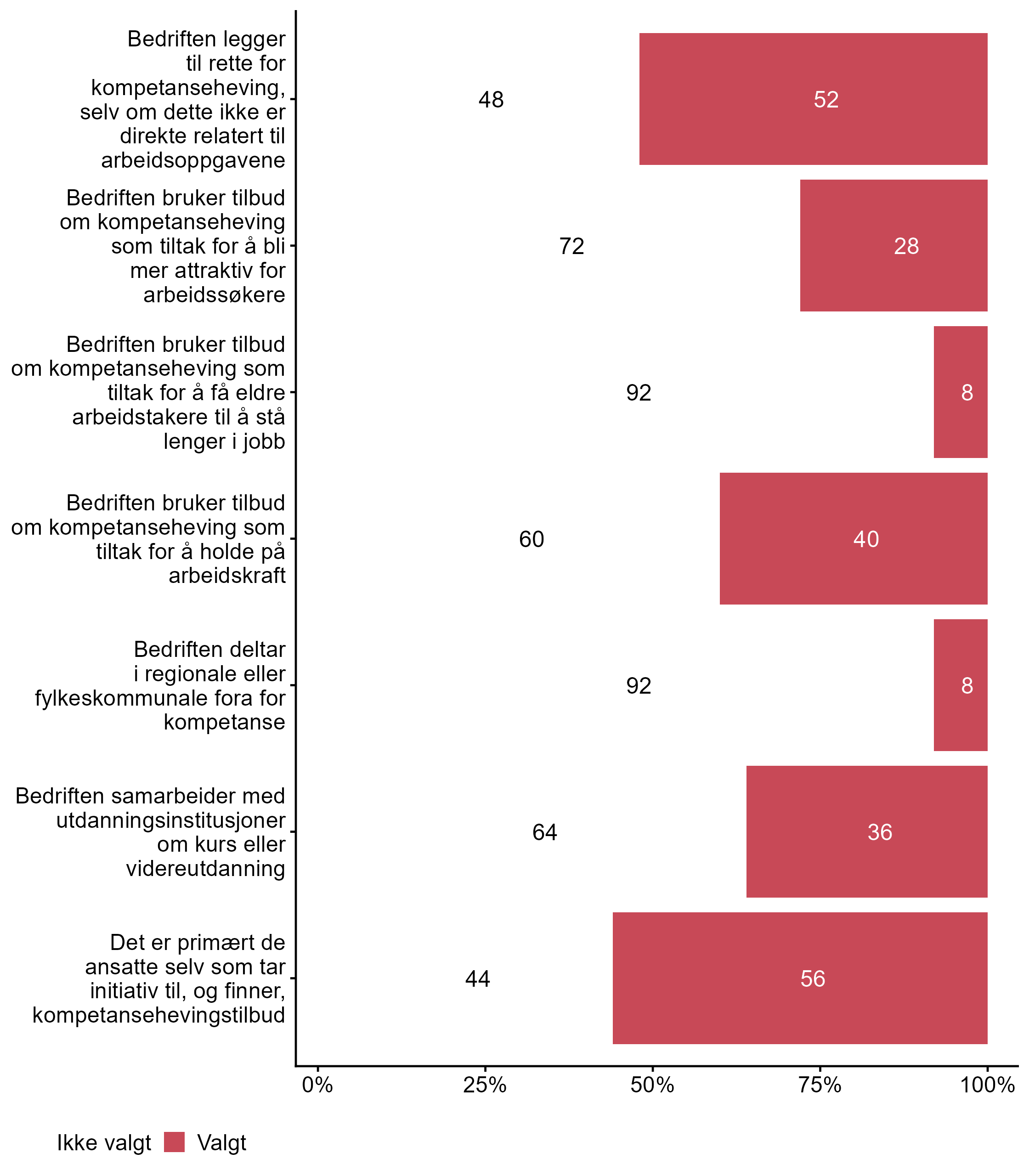 For Bedriften deltar i regionale eller fylkeskommunale fora for kompetanse har målgruppen en lavere andel respondenter (0,08) enn alle andre (0,25) som svarte Valgt. Færre respondenter svarte Valgt for Bedriften bruker tilbud om kompetanseheving som tiltak for å bli mer attraktiv for arbeidssøkere i målgruppen (0,28) enn i andre grupper (0,4). For påstanden Bedriften legger til rette for kompetanseheving, selv om dette ikke er direkte relatert til arbeidsoppgavene var det flere som svarte Valgt i målgruppen (0,52) enn blant andre (0,34).