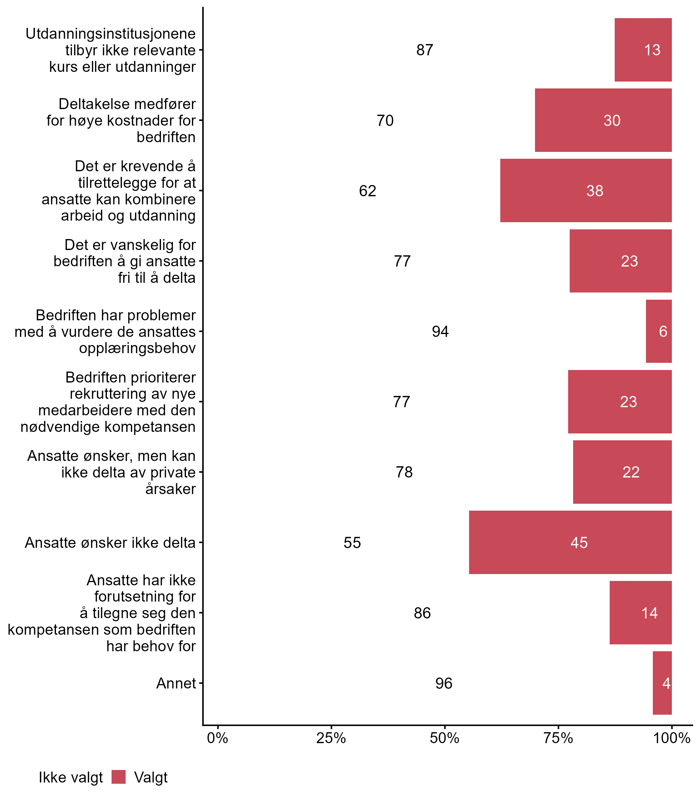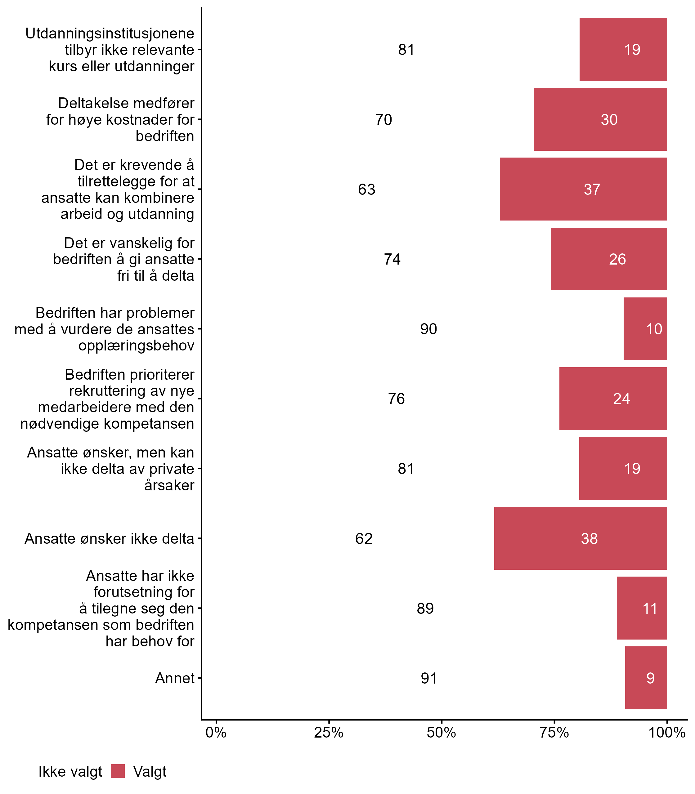 Vi ba bedriftene også krysse av for påstander som beskriver hvorfor ansatte i bedriften begrenser eller ikke deltar i etter- og videreutdanning, svarfordelingen vises i figur 5.