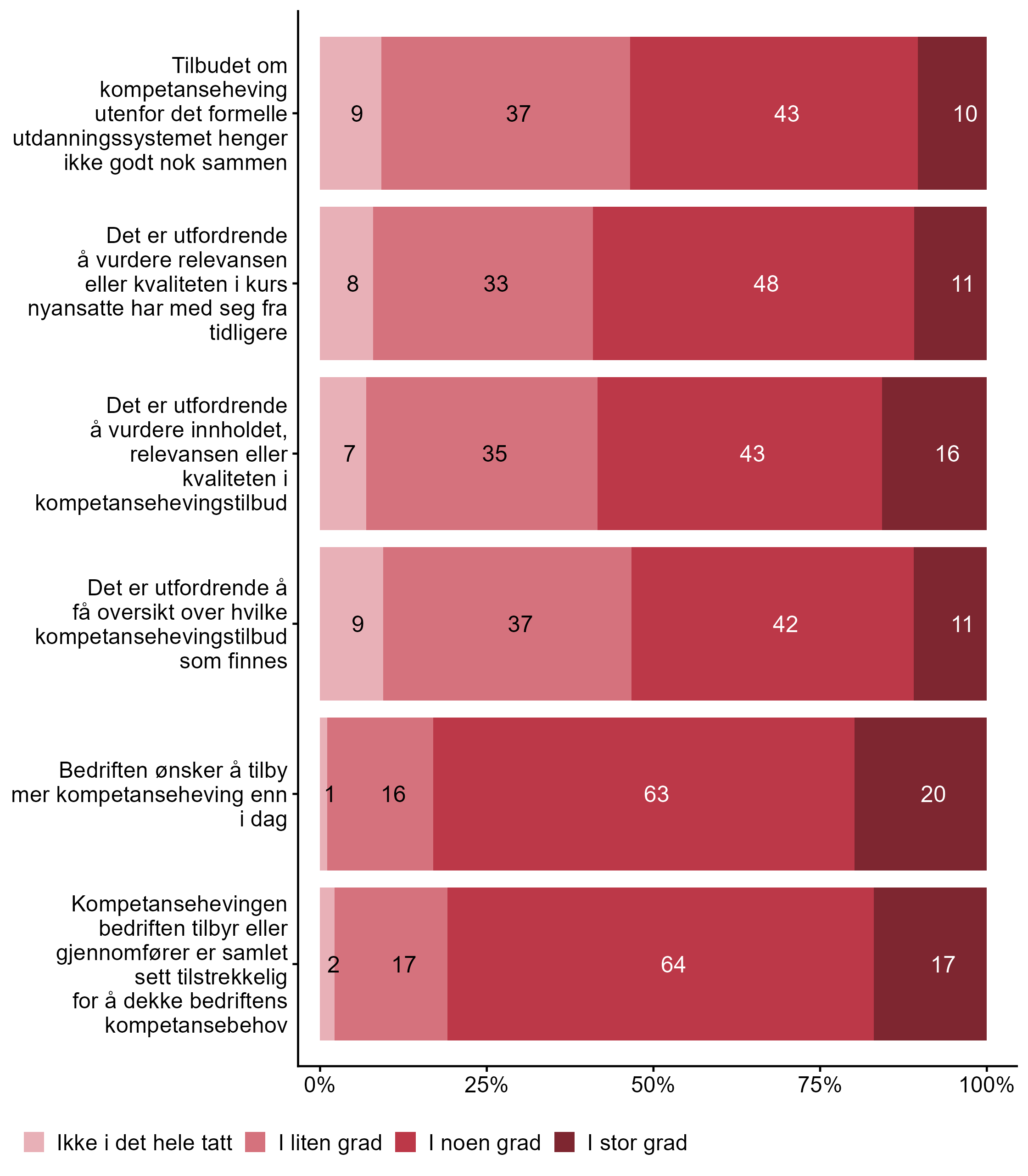 I figur 3 viser vi fordelingen av svar på en rekke påstander knyttet til utfordringer i etter- og videreutdanning.