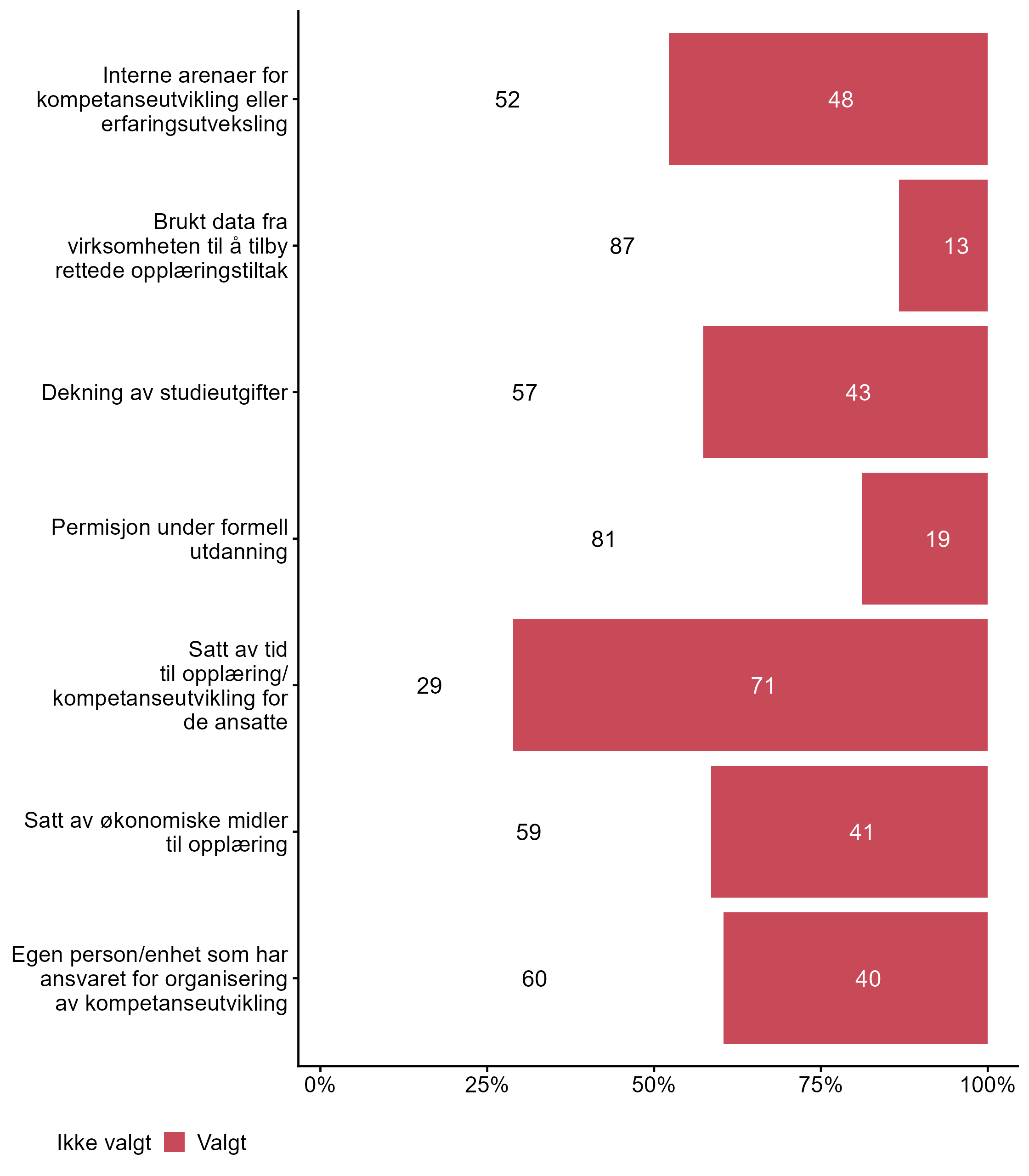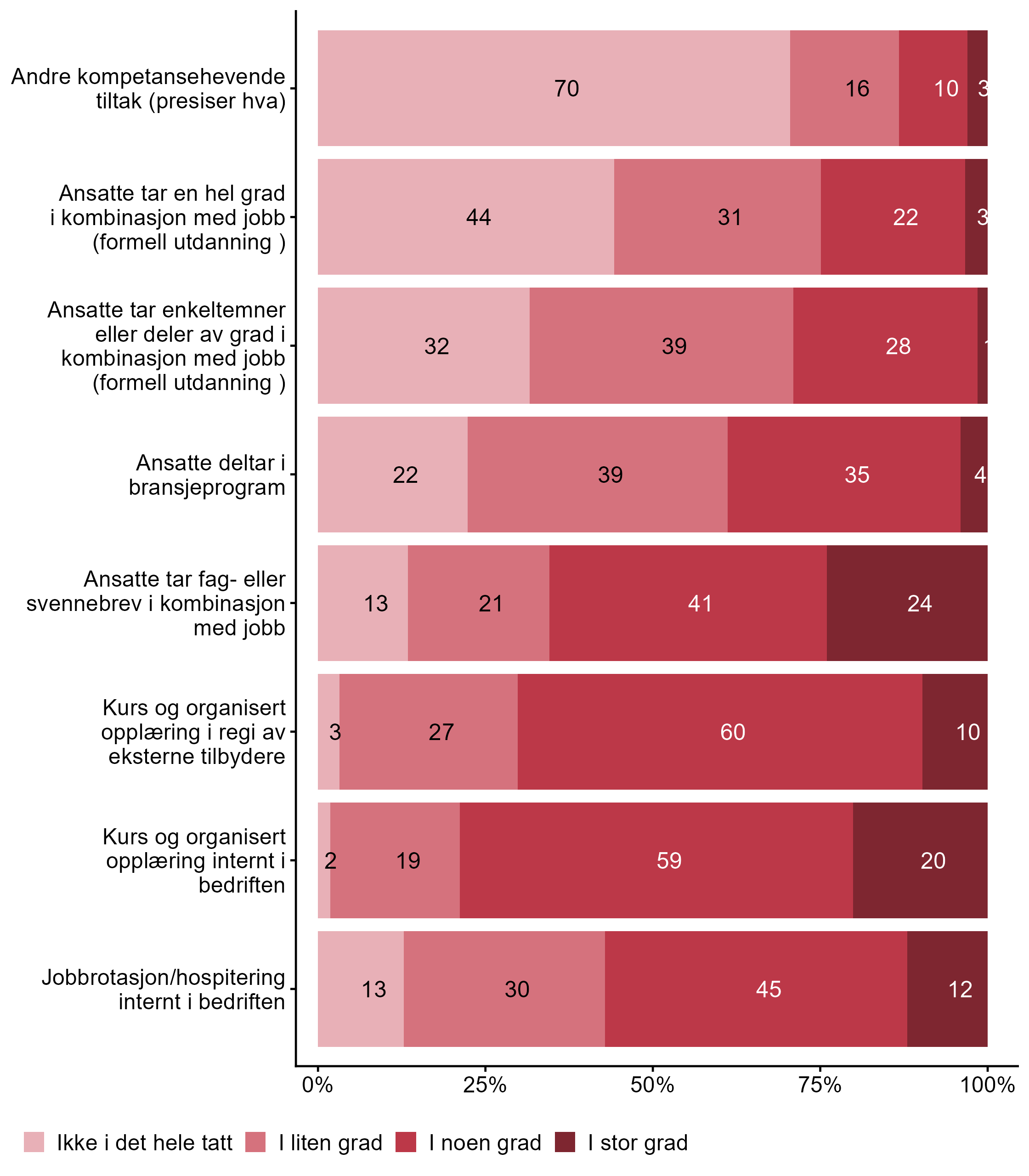 Vi stilte også spørsmål om hvilke tiltak bedriften har hatt for kompetanseutvikling det siste året, svarfordelingen vises i figur 2.