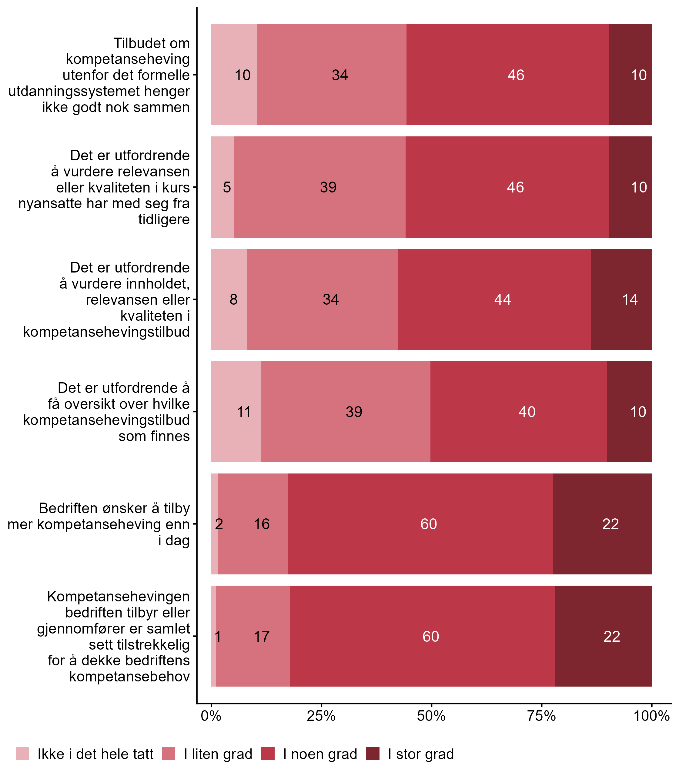 I figur 3 viser vi fordelingen av svar på en rekke påstander knyttet til utfordringer i etter- og videreutdanning.