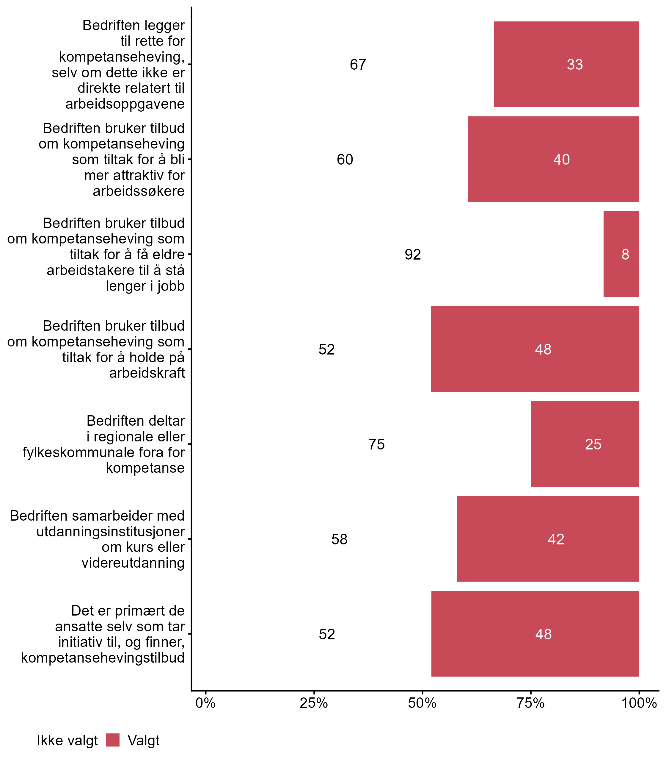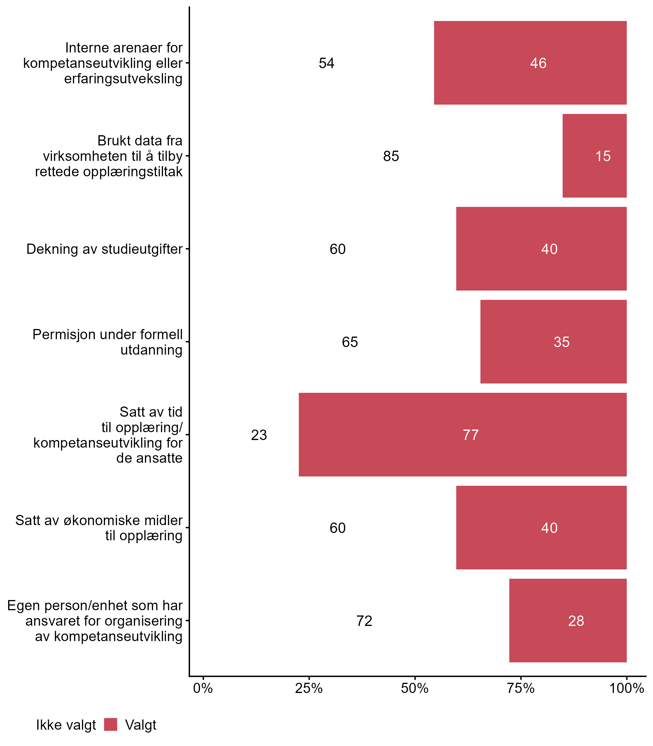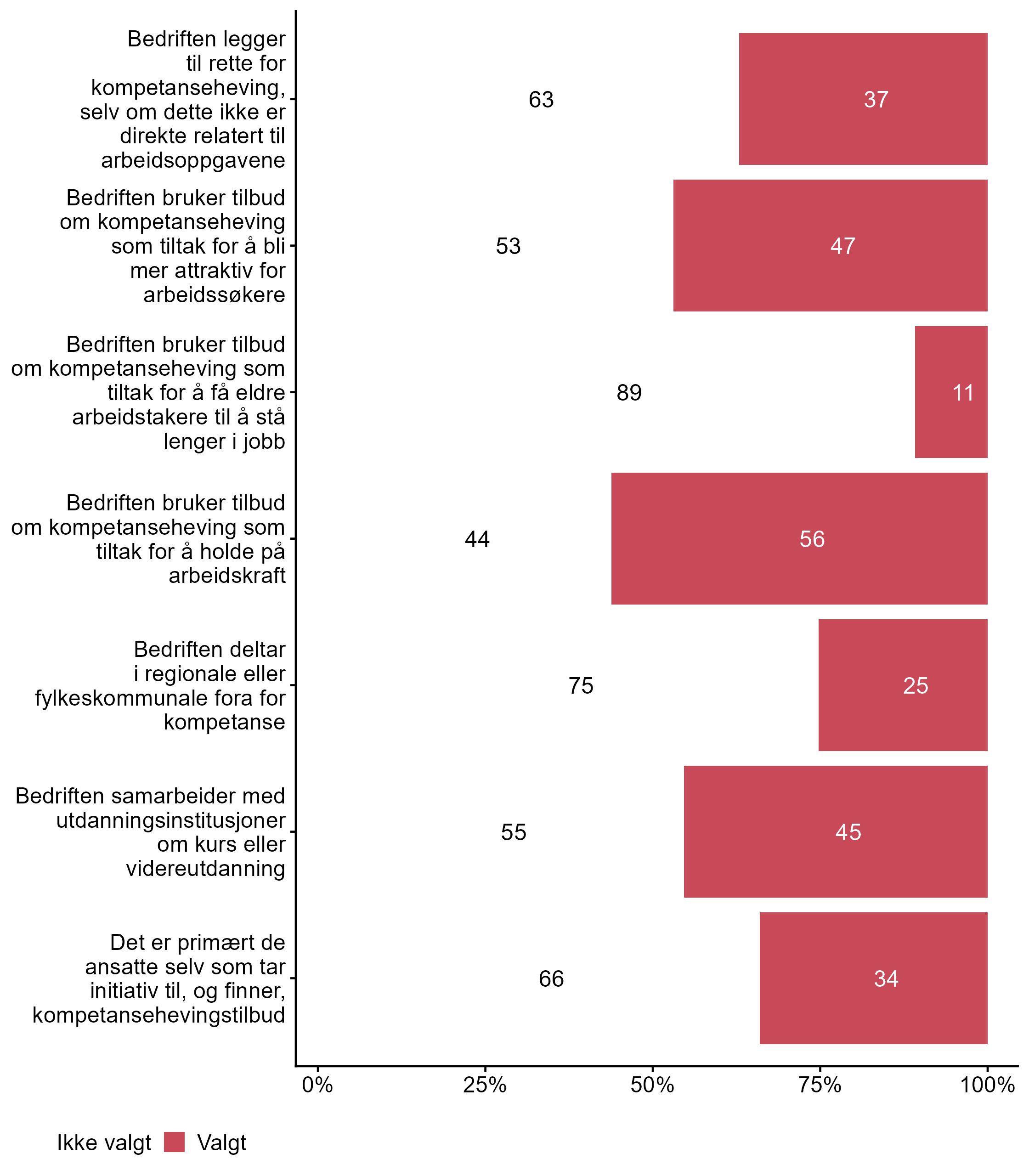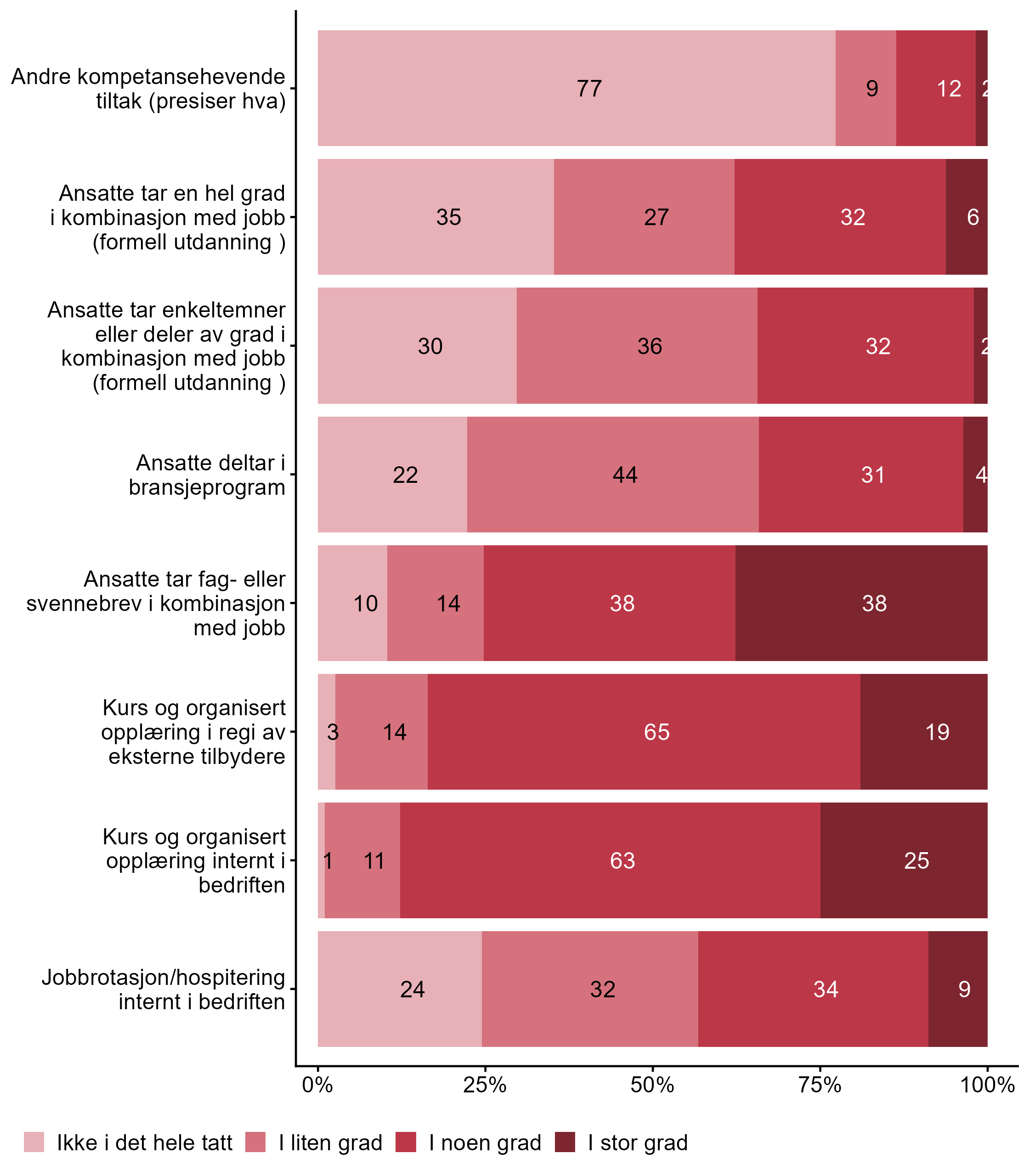 Vi stilte også spørsmål om hvilke tiltak bedriften har hatt for kompetanseutvikling det siste året, svarfordelingen vises i figur 2.