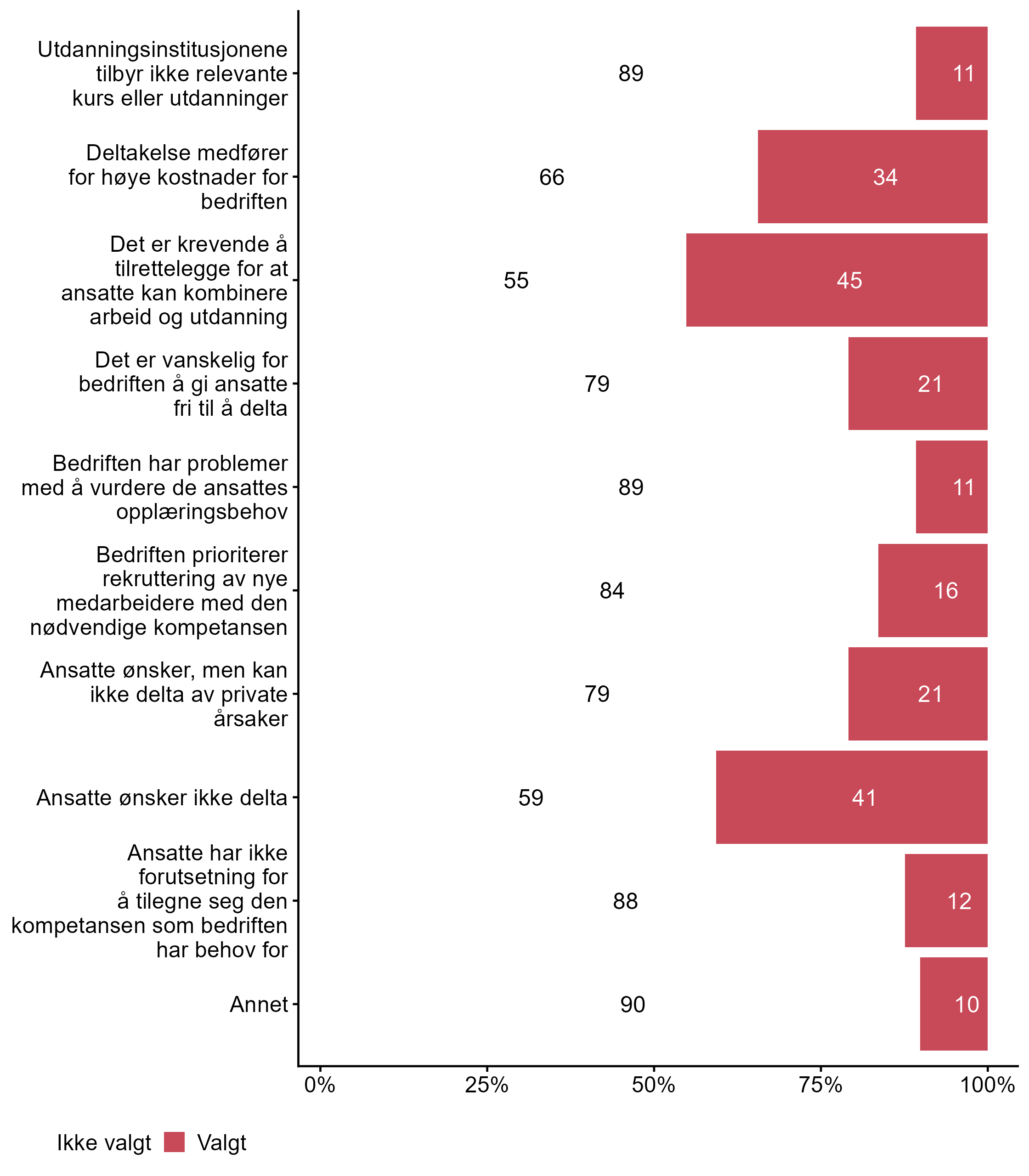 Vi ba bedriftene også krysse av for påstander som beskriver hvorfor ansatte i bedriften begrenser eller ikke deltar i etter- og videreutdanning, svarfordelingen vises i figur 5.
